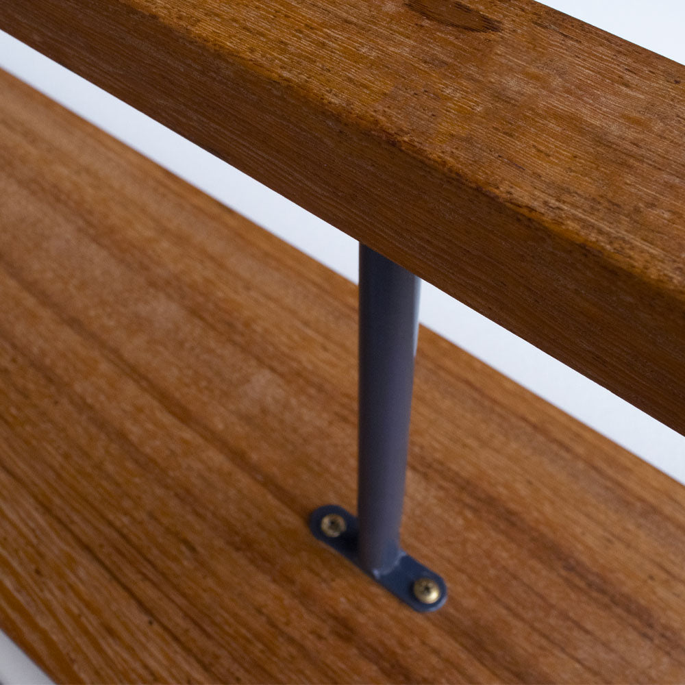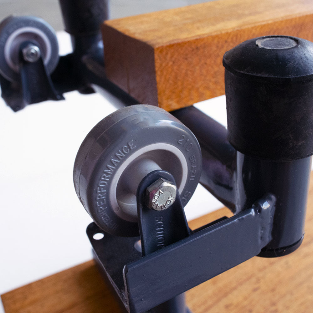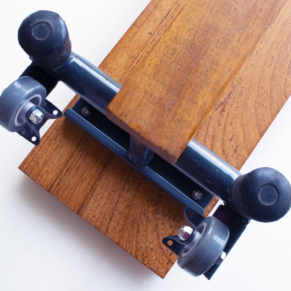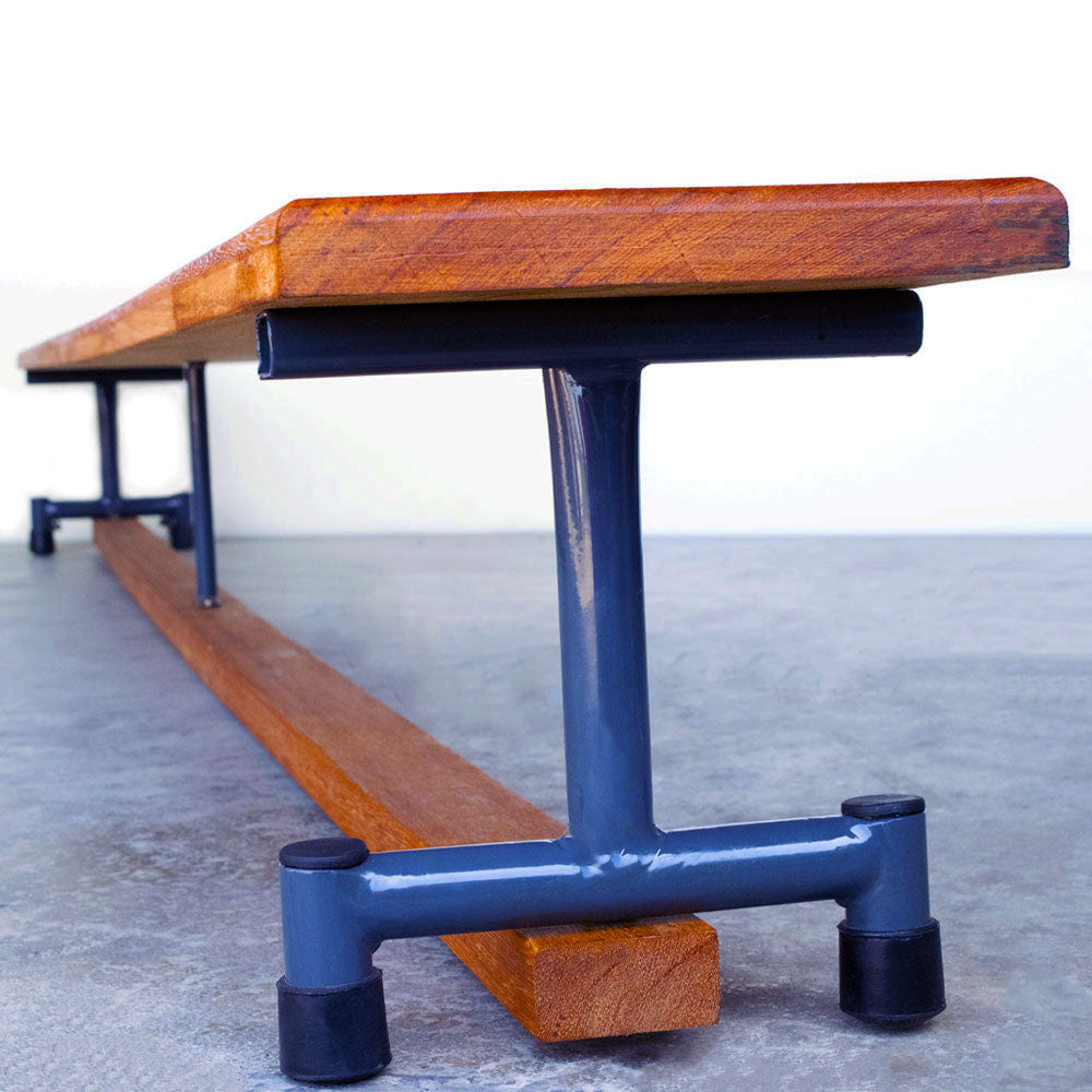Banco sueco de aço e madeira. Modelo exclusivo de altíssimo padrão de qualidade e resistência. Fabricado em madeira nobre (renovável, de lei, em conformidade com os órgãos federais para a sua comercialização), de altíssima resistência e dureza, bases de aço 100% galvanizado com pintura a pó, rodas e trave de equilíbrio de madeira nobre. Espessura mínima da madeira: 2 cm. Largura e altura aproximados: 30 cm. Comprimentos disponíveis: 2, 3 e 4m (tamanho padrão: 3m). Pode ser usado como trave de equilíbrio se virado ao contrário.