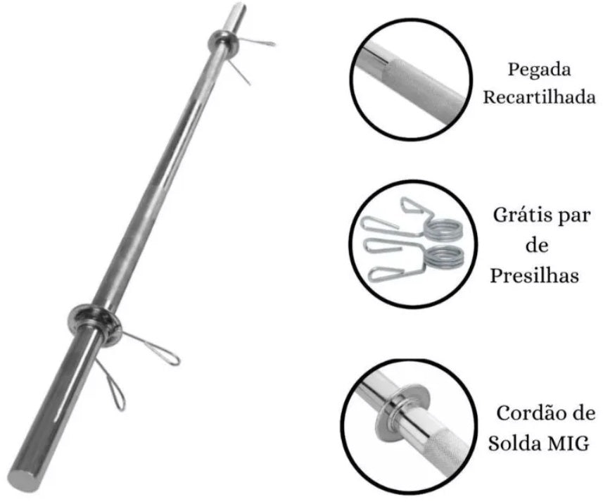 Barra para anilhas de aço maciço cromado 2m20 Pista e Campo Pista e Campo. Recartilhada. Acompanha 2 presilhas. Suporta 200kg. Bitola: 1.1/8" (aproximadamente 28 mm).