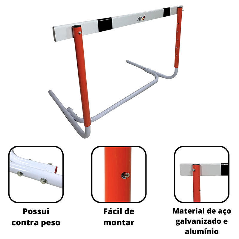 Barreira de atletismo de aço para treinamento Pista e Campo. Excelente custo-benefício. Ideal para treinamento com boa durabilidade. Estrutura de aço galvanizado, leve e resistente. Travessão de plástico resistente. Ajuste de 5 alturas conforme regras da IAAF. Pintura a pó, mais resistente à corrosão. Fácil de montar e armazenar.
