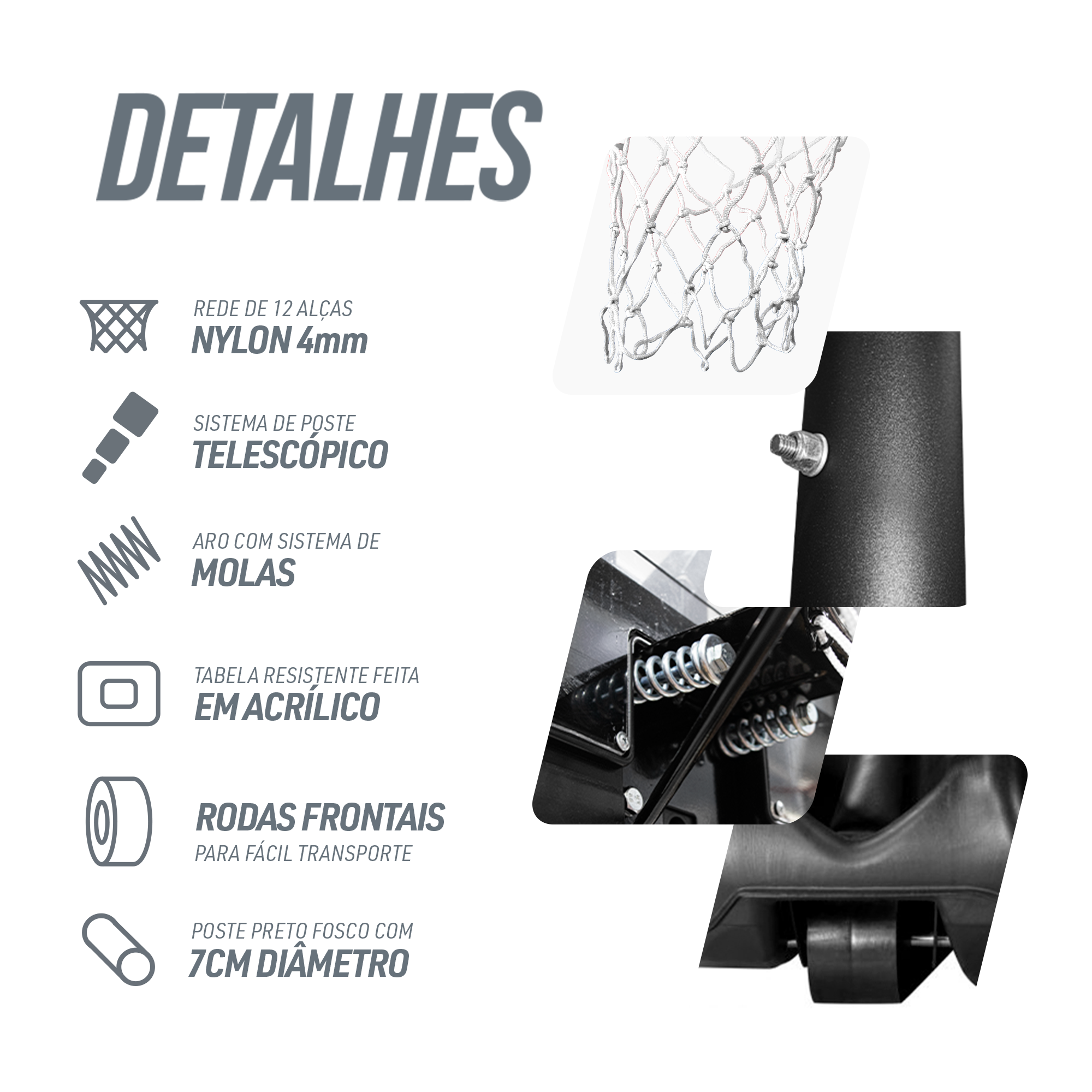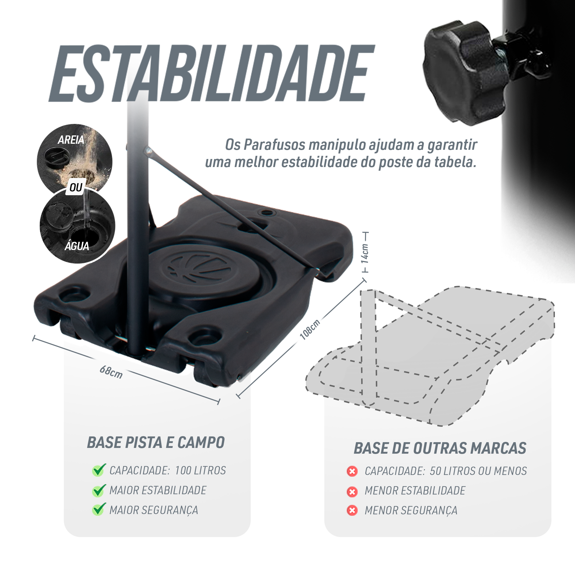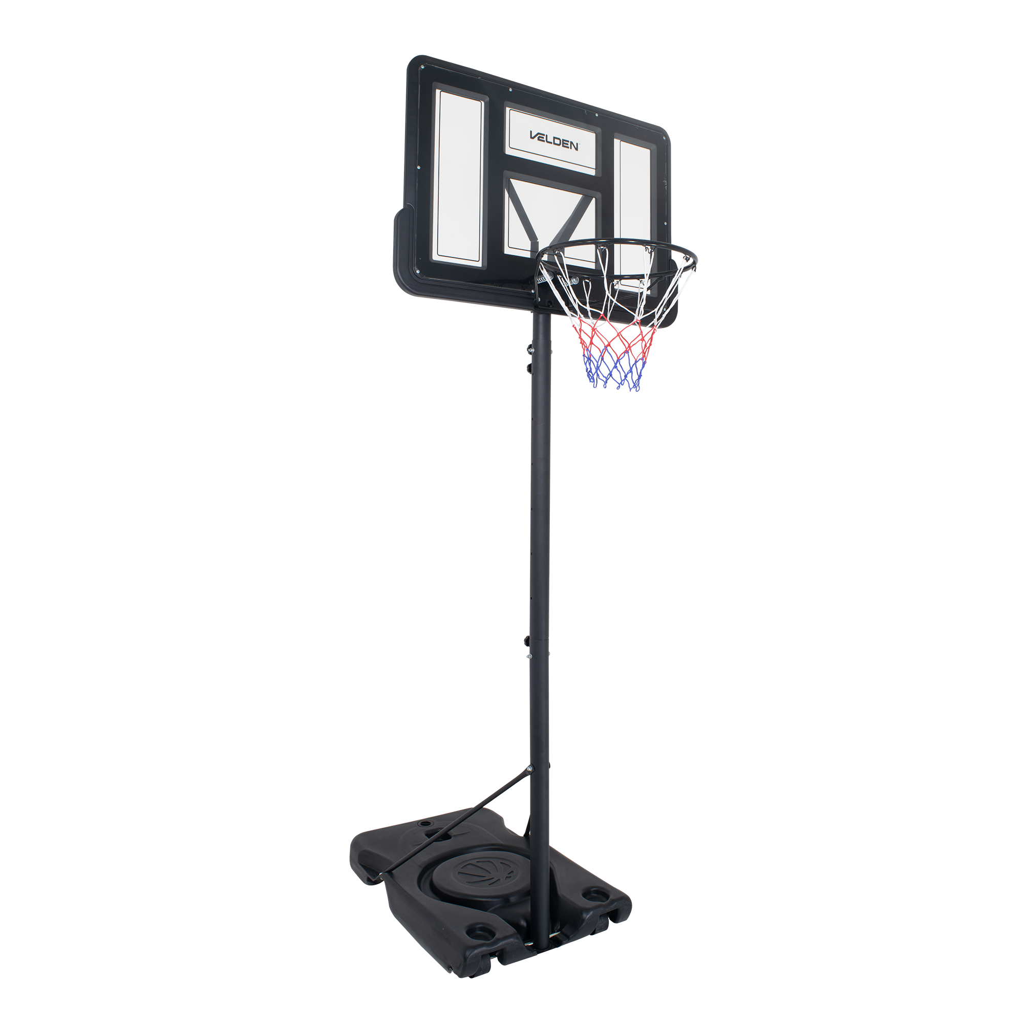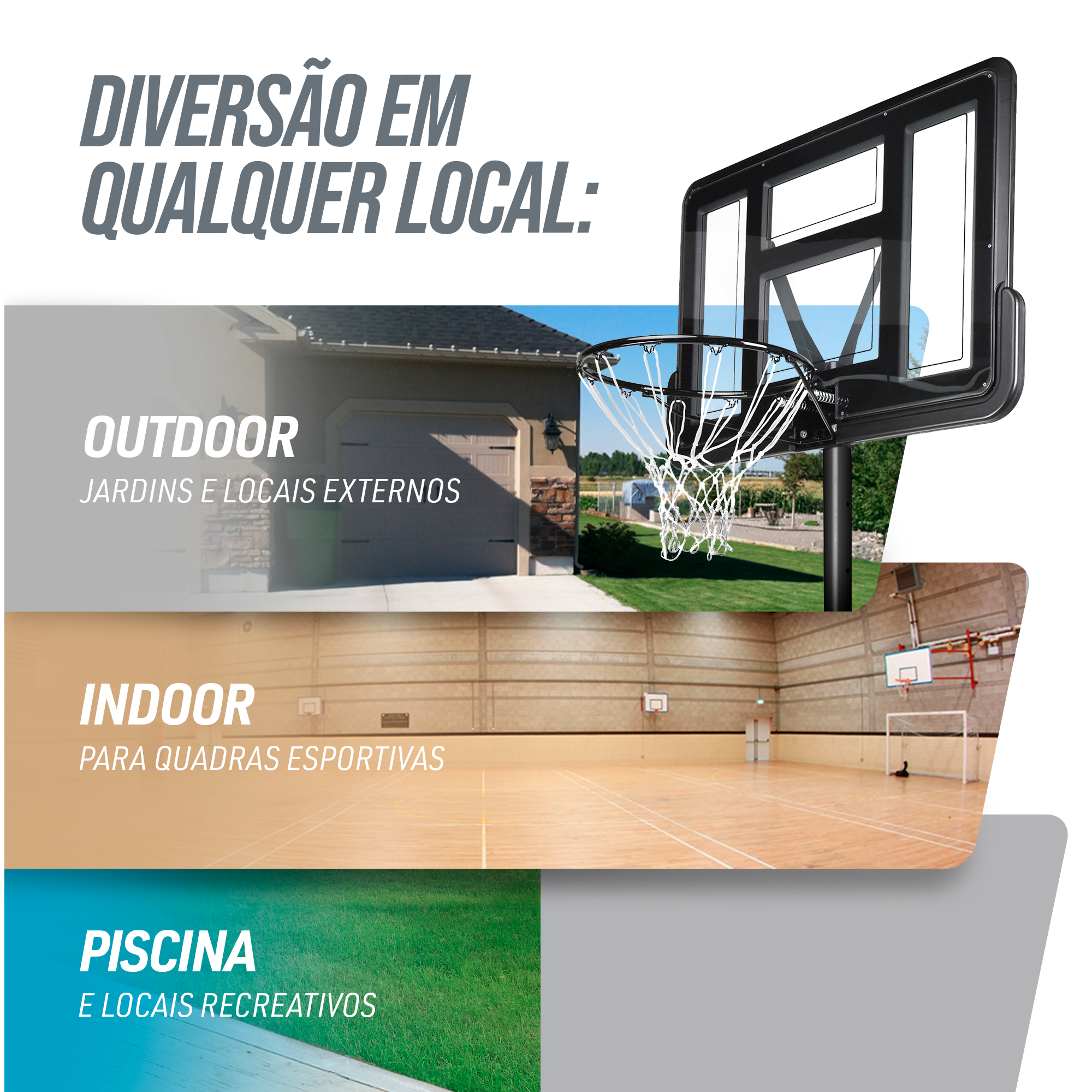 Tabela de basquete adulto móvel com poste, tabela de acrílico e aro Velden. Ajustável de 2,35m a 3,05m, ideal para crianças e adultos. Tabela de acrílico resistente (110 x 74,5 cm), não deforma e suporta impactos. Base móvel com rodas para fácil transporte. Inclui aro, rede, poste e base. Perfeita para garagens, clubes, escolas e áreas externas. Qualidade profissional para diversão e treino em qualquer lugar! Pagamento por PIX ou depósito: desconto de 5% (informado no final da compra). Velden é a nova marca Pista e Campo para esportes de quadra. A mesma qualidade agora personalizado!