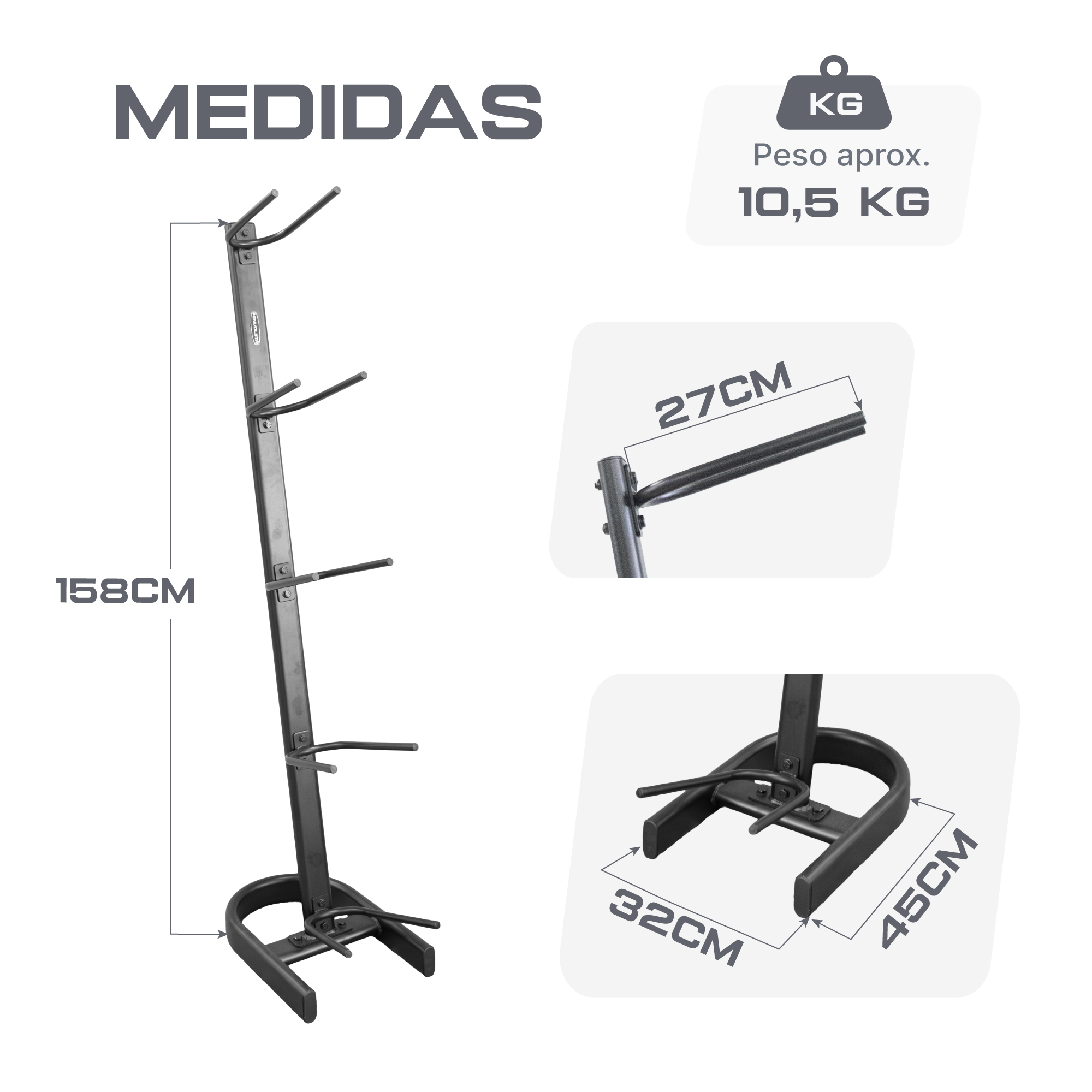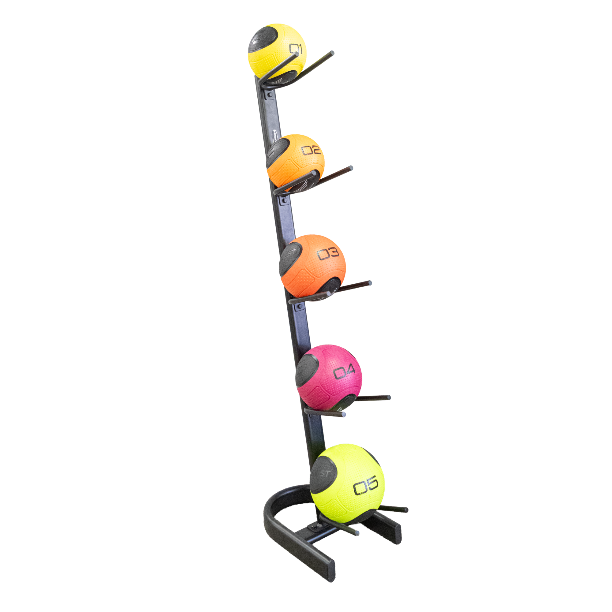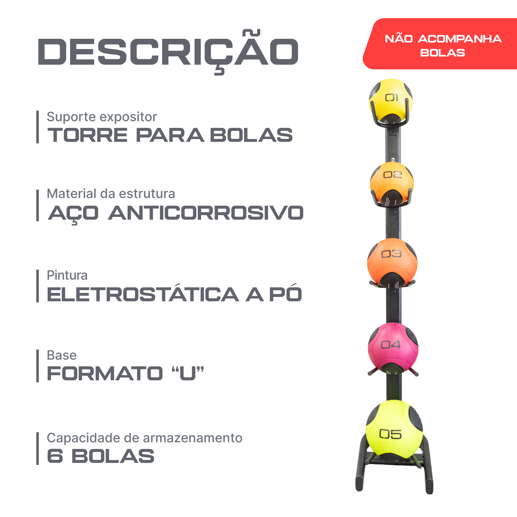 Rack vertical que organiza bolas de treino com acesso rápido e visual limpo. Estrutura em aço com tratamento anticorrosivo e pintura eletrostática para alta durabilidade. Base em U oferece estabilidade mesmo carregado. Solução para academias, estúdios e espaços residenciais com pouco espaço.