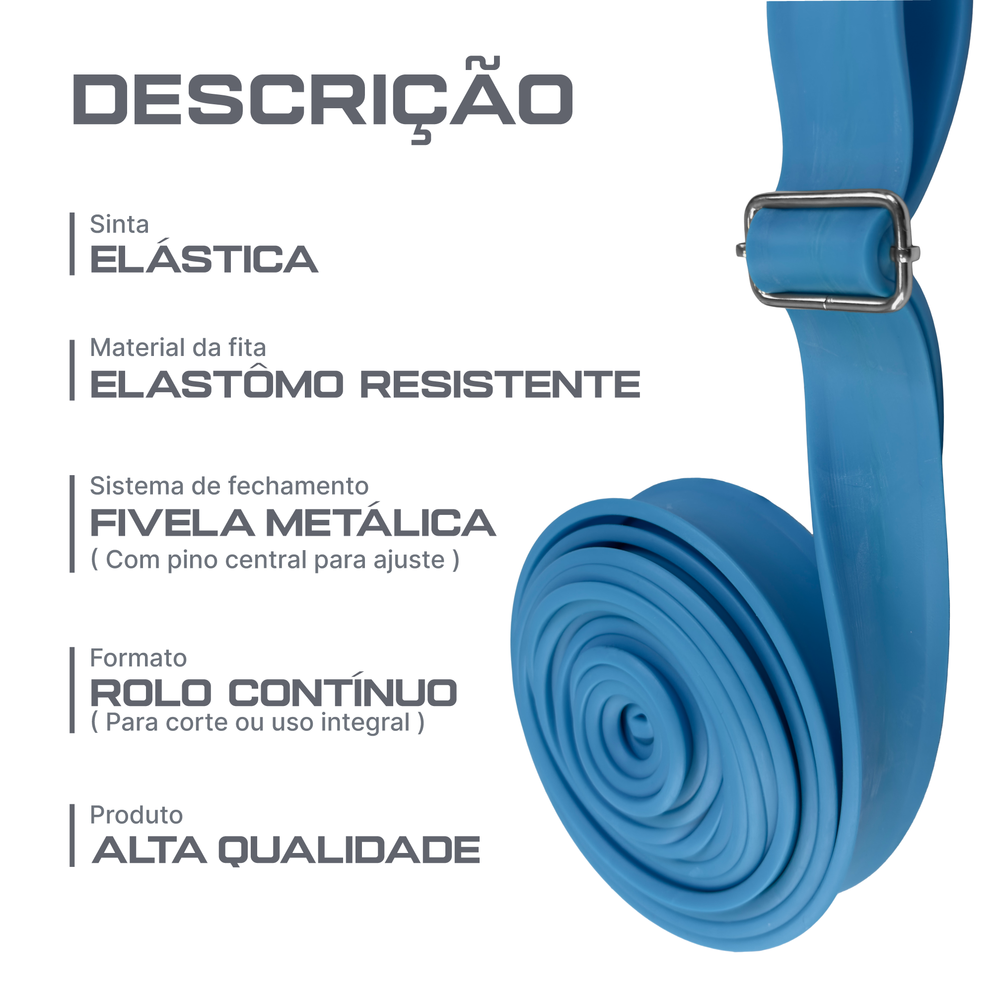 Cinta elástica em rolo para treinos de tração, potência e velocidade. O material em borracha resistente garante elasticidade consistente e retorno suave. Fivelas metálicas com pino central permitem ajuste seguro na cintura ou em ancoragem. O formato contínuo possibilita usar o rolo inteiro ou cortar no tamanho desejado.
