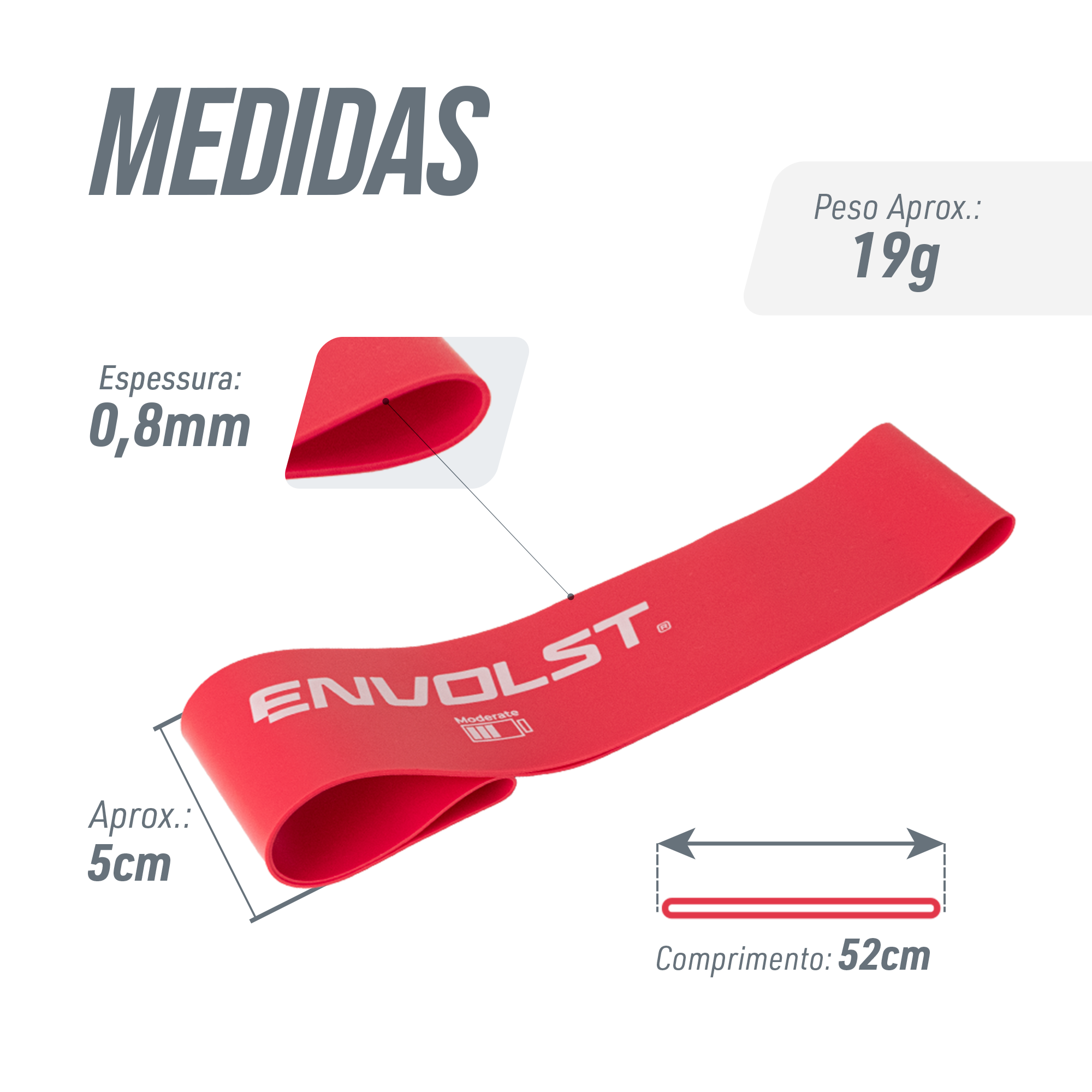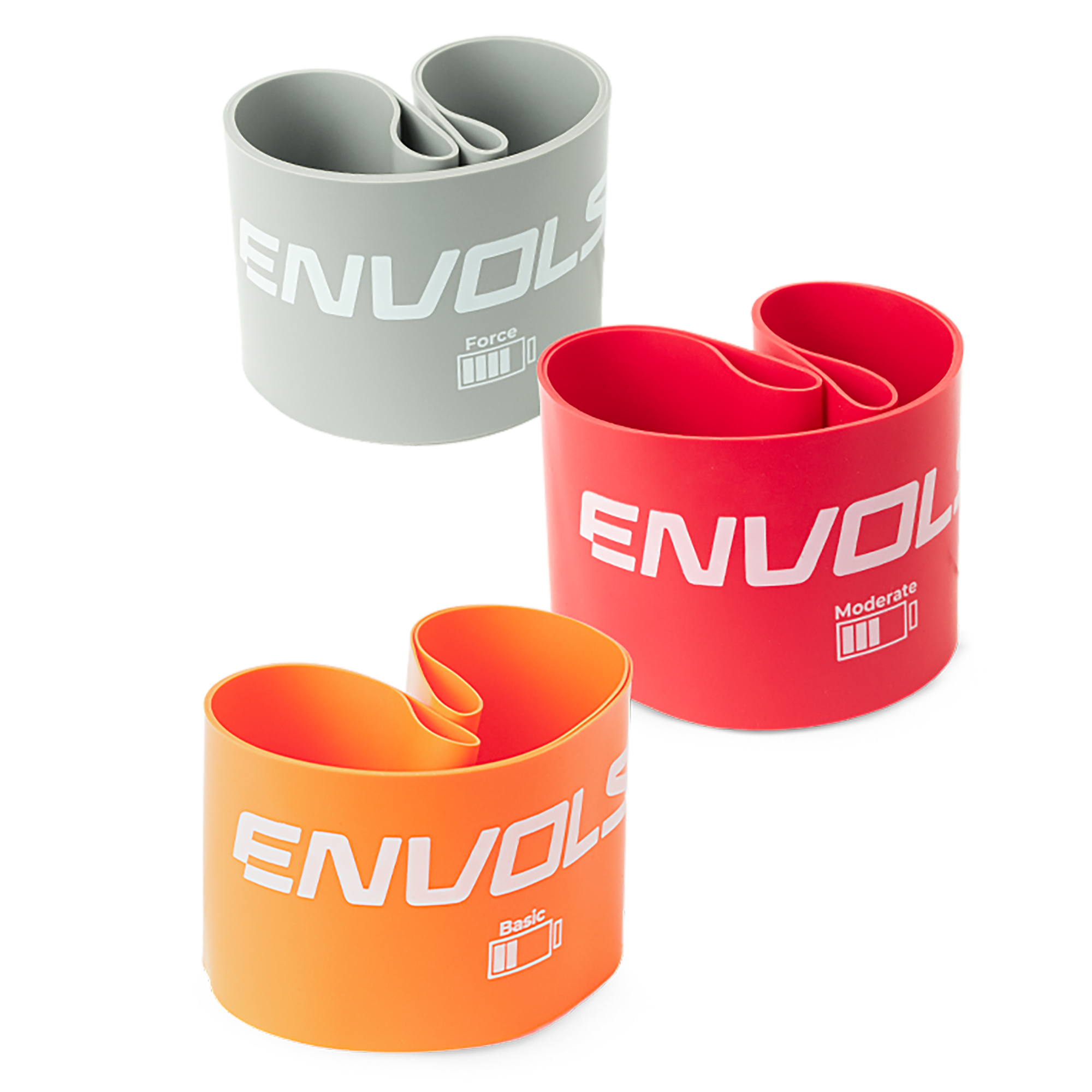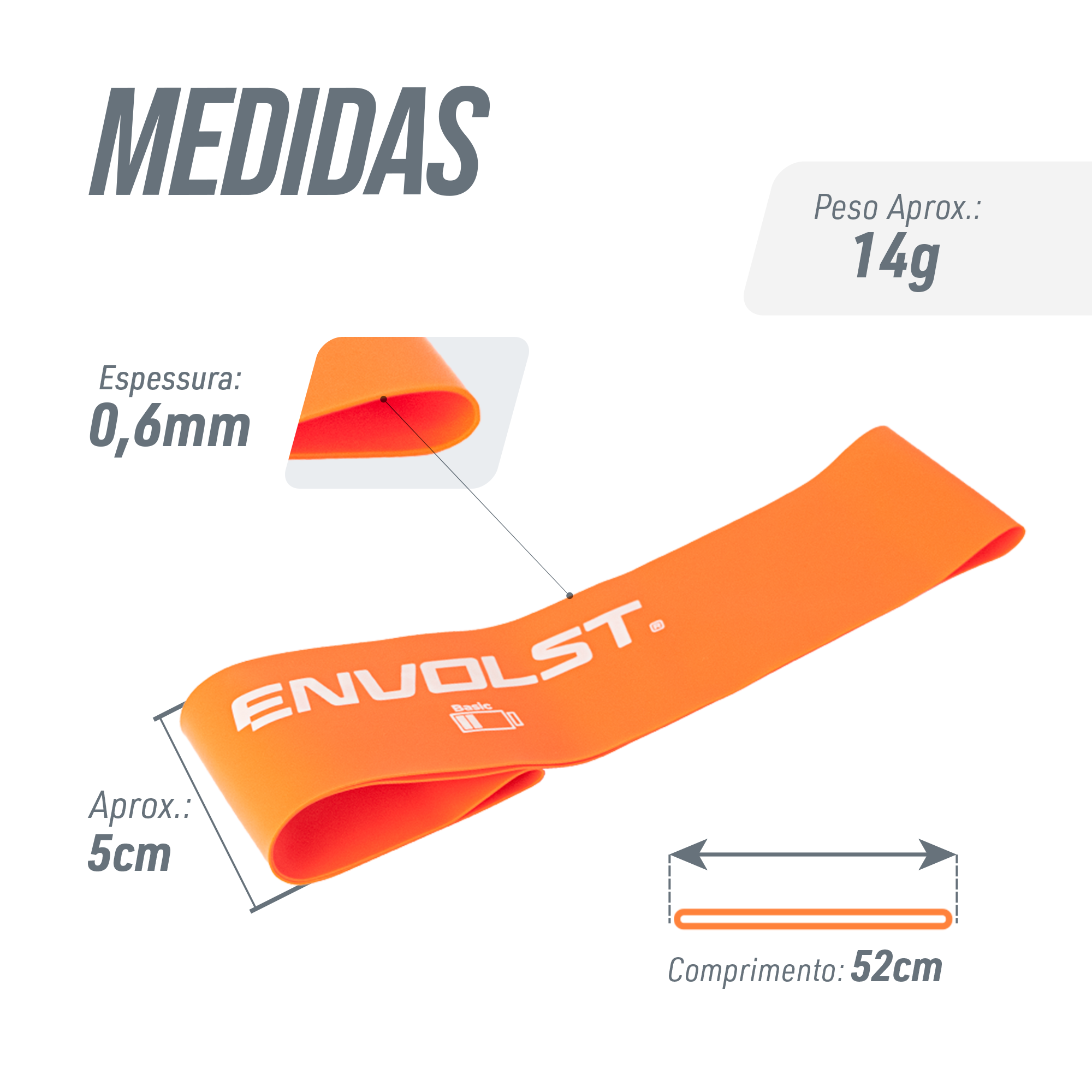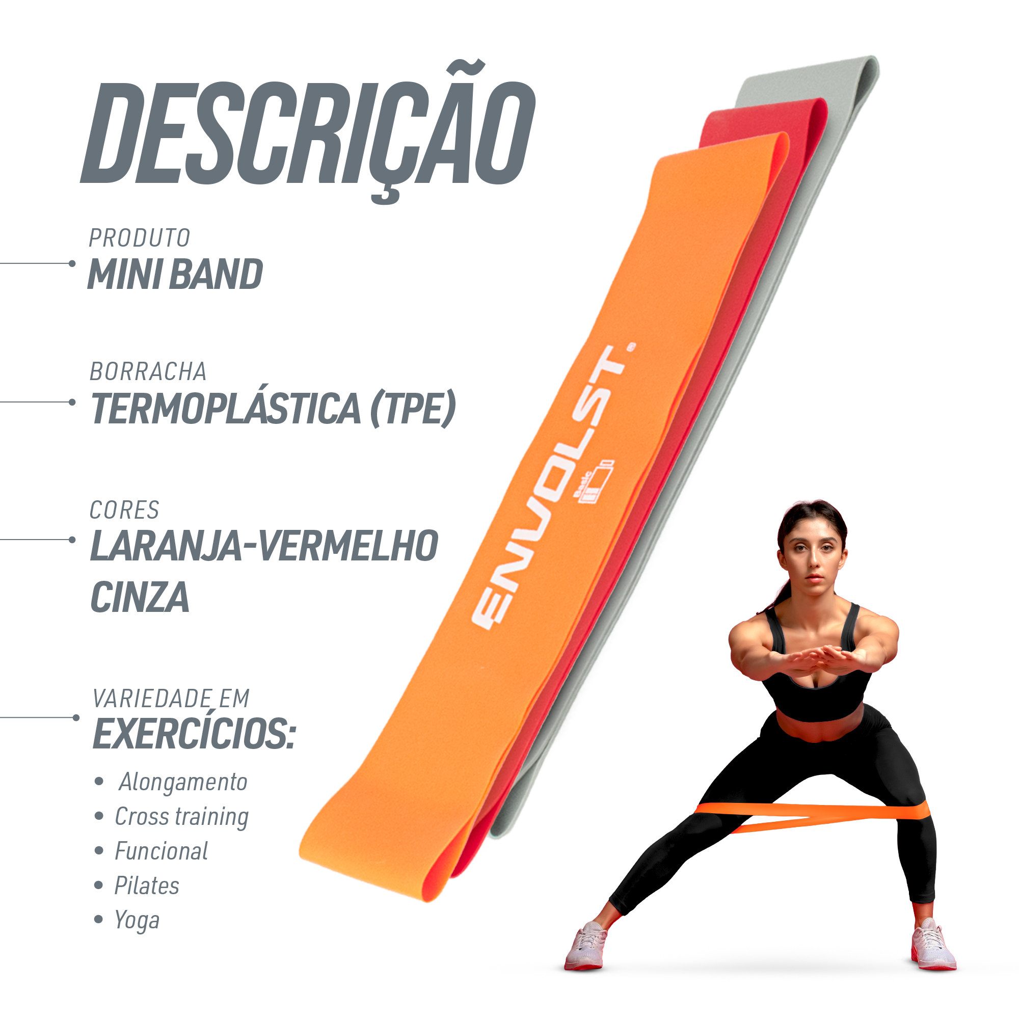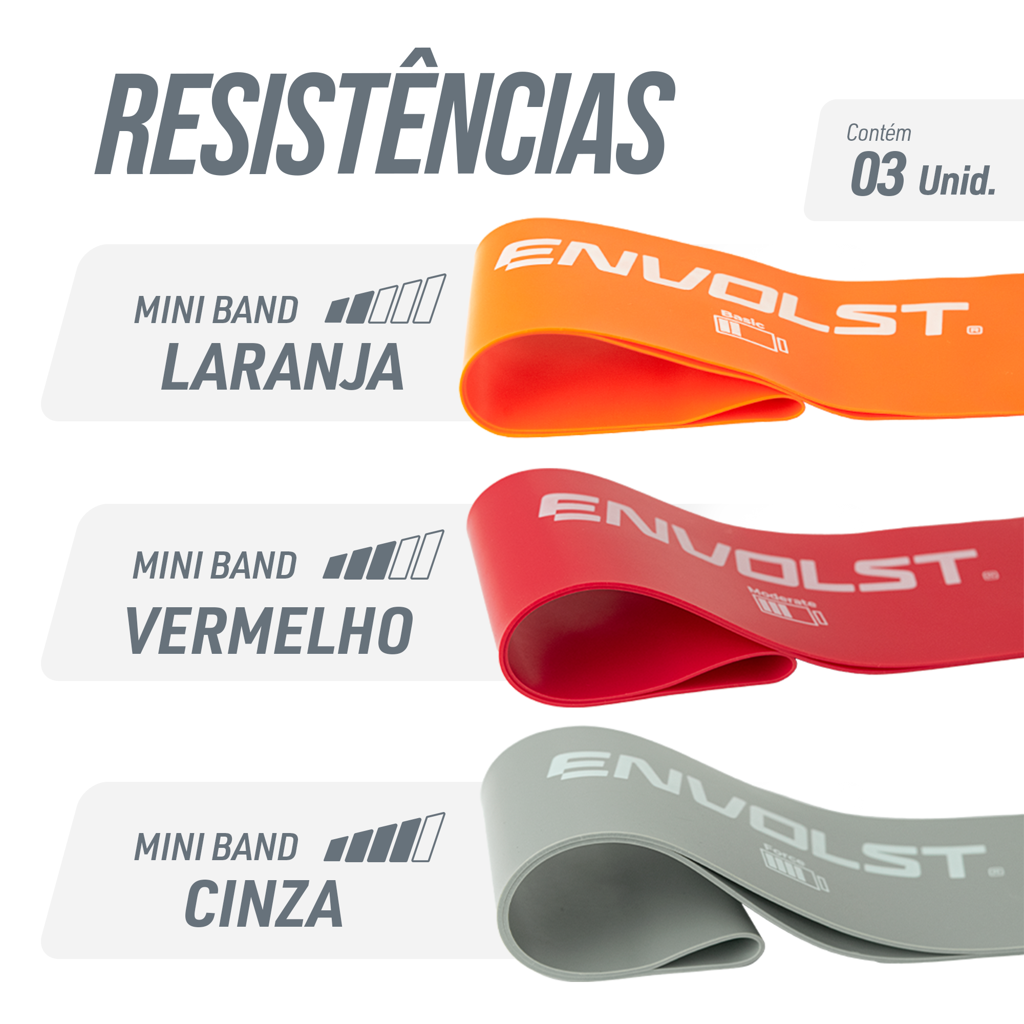 Mini Band de látex Envolst - kit com 3 intensidades. São elásticos circulares que são utilizadas para exercícios de fortalecimento e alongamentos. Pode ser usado tanto a parte superior como a inferior do corpo. Cada cor possui uma resistência ou intensidade: Laranja = Basic (leve - 0,6mm), Vermelho = Moderate (média - 0,8mm), Cinza = Intense (forte - 1,0mm). Melhora a coordenação motora, aprimora habilidades funcionais, aumenta a mobilidade e flexibilidade, usado em reabilitação de lesões, prevenção de recidivas de lesões, uso pós cirúrgico, treinamento desportivo, fitness e condicionamento corporal, além de tonificar e modelar seus braços e pernas. Dimensões de 50x5cm (considerando o comprimento do elástico) ou 25x5cm (considerando o anel). Preço kit com 3 intensidades. Acompanha saquinho de transporte.