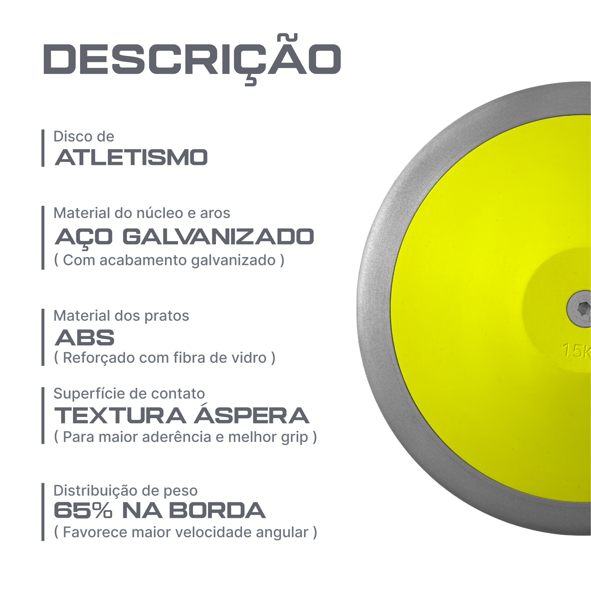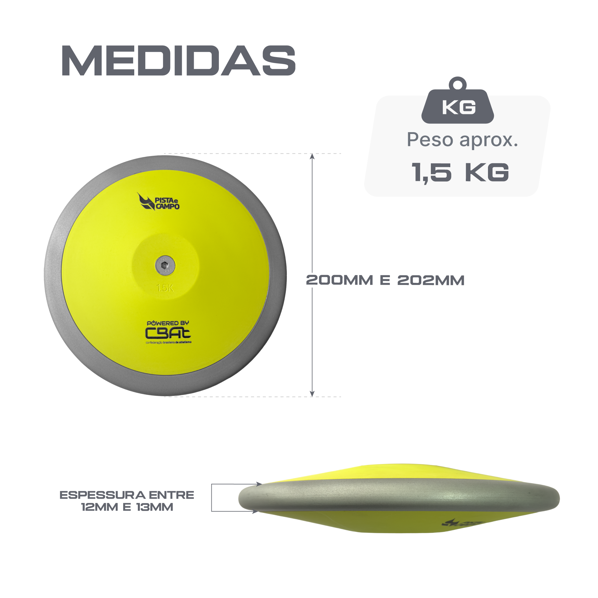Desenvolvido para atender às exigências da categoria Sub-18 masculino e sessões de treinamento intensivo, o Disco de Atletismo Pista e Campo de 1,5 kg é um equipamento de alta durabilidade e precisão técnica. Com a chancela "Powered by CBAt", este modelo garante ao atleta a experiência de utilizar um material em total conformidade com as normas da World Athletics, sendo ideal para quem busca evolução técnica e performance competitiva. A estrutura é composta por um aro e núcleo em aço galvanizado, que oferecem proteção superior contra corrosão e impactos frequentes. Os pratos são fabricados em ABS reforçado com fibra de vidro, assegurando que o disco mantenha sua integridade dimensional mesmo após uso contínuo. Um dos grandes diferenciais é a distribuição estratégica de 65% do peso concentrada na borda, fator que potencializa a inércia rotacional, estabiliza o voo e favorece o alcance de maiores distâncias através de uma trajetória mais equilibrada. Pensando no controle absoluto durante o lançamento, a superfície possui uma textura aderente que proporciona um grip firme, essencial para evitar deslizes no momento da soltura. Suas dimensões técnicas são rigorosas: diâmetro externo de 200 mm a 202 mm, espessura central entre 38 mm e 40 mm e bordas com 12 mm a 13 mm. É a ferramenta de alta qualidade que treinadores e atletas de nível intermediário e avançado precisam para aprimorar a mecânica de giro e a força de arremesso. Potencialize seus resultados com o disco de 1,5 kg Powered by CBAt. Domine a rotação com 65% de peso na borda e sinta a segurança da pegada texturizada em cada lançamento. Adquira agora na Pista e Campo e treine com padrão oficial!