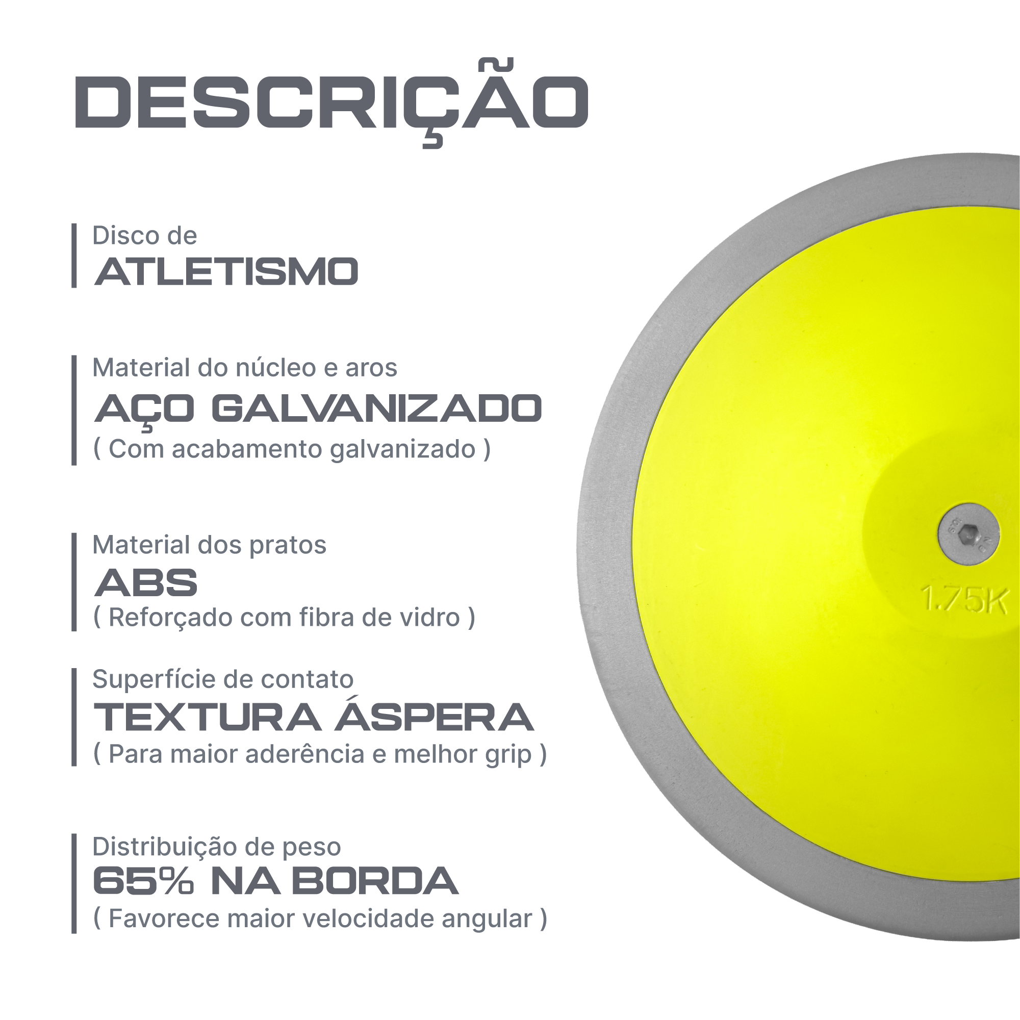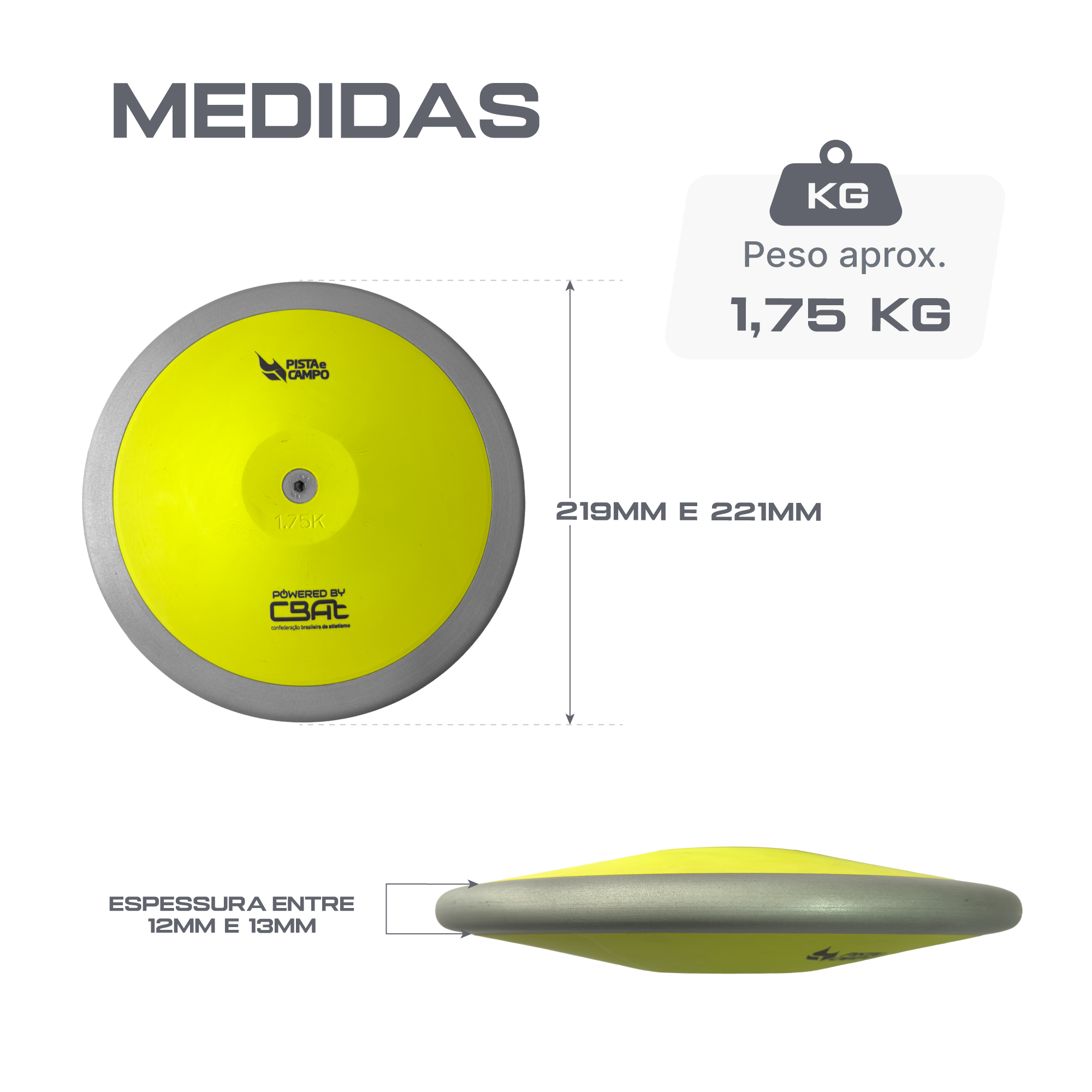 O Disco de Atletismo de 1,75kg da Pista e Campo, com selo "Powered by CBAt", é o equipamento ideal para atletas que buscam alto desempenho em treinamentos e competições oficiais. Desenvolvido rigorosamente sob as normas da World Athletics, este modelo combina materiais de engenharia avançada para oferecer estabilidade e resistência em cada lançamento. Sua construção conta com aro e núcleo em aço galvanizado, protegendo o item contra a oxidação e o desgaste por impactos, enquanto os pratos em ABS reforçados com fibra de vidro garantem a rigidez necessária para uma trajetória precisa. Um dos pilares técnicos deste disco é a sua distribuição de massa, que concentra 65% do peso total na borda. Essa configuração maximiza a inércia rotacional, permitindo que o atleta sustente o giro por mais tempo e alcance melhores resultados aerodinâmicos. Para assegurar total domínio durante a fase de aceleração e na soltura, a superfície de contato apresenta uma textura de alta aderência (grip), proporcionando firmeza mesmo em condições de uso intenso. As especificações métricas reforçam o padrão profissional do item: possui diâmetro externo entre 210 mm e 212 mm, espessura central de 41 mm a 43 mm e bordas de 14 mm a 15 mm, com placa central variando de 50 mm a 57 mm. É a escolha definitiva para lançadores que exigem um equipamento confiável, capaz de suportar a rotina de treinos pesados e entregar performance de elite. Atleta, eleve o nível da sua técnica com o disco de 1,75kg Powered by CBAt. Aproveite a estabilidade superior da rotação e a segurança do grip para bater suas marcas. Garanta já o seu na Pista e Campo e lance com padrão internacional!