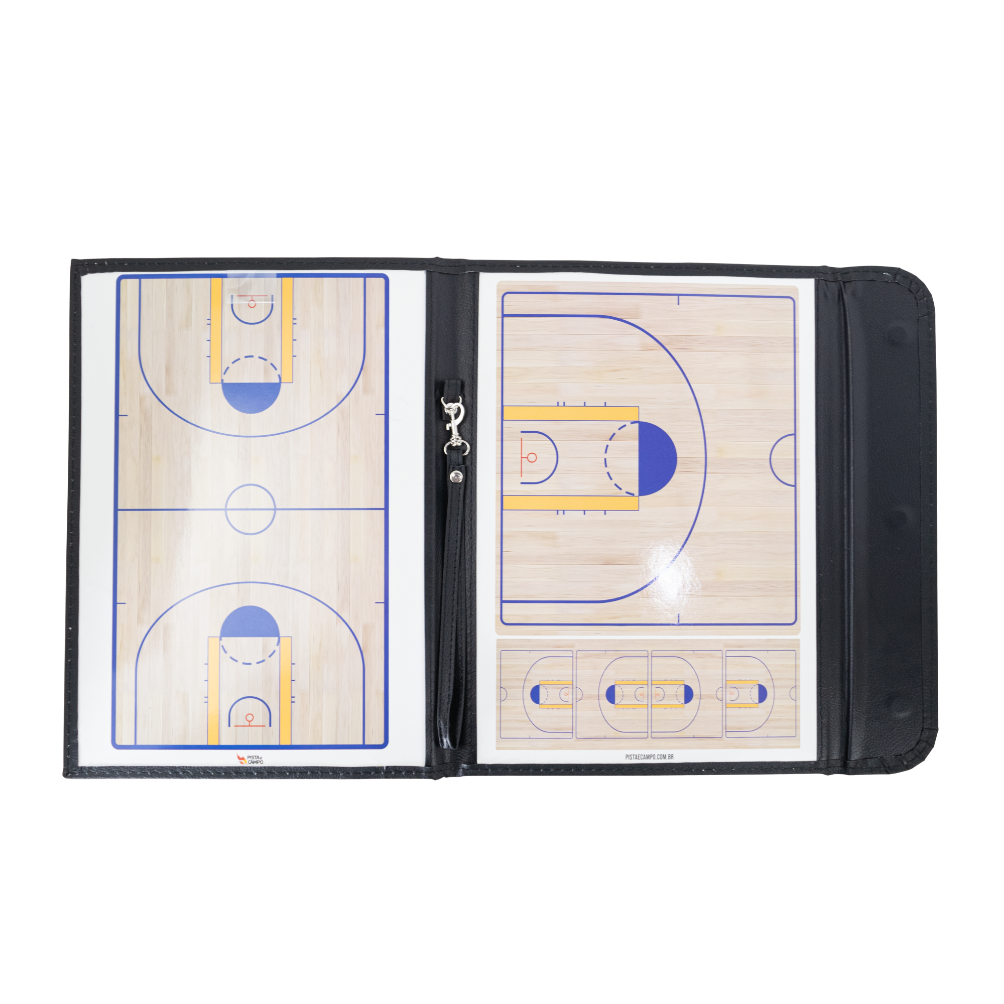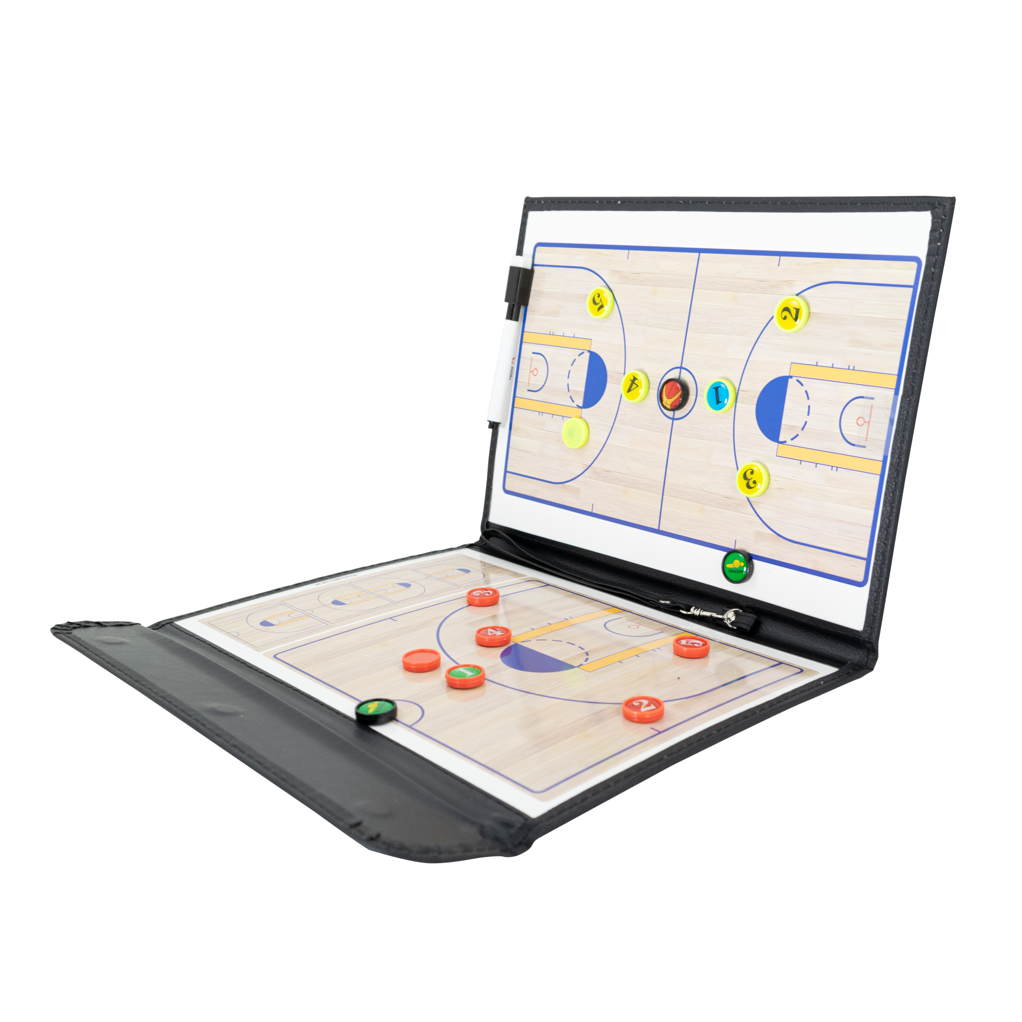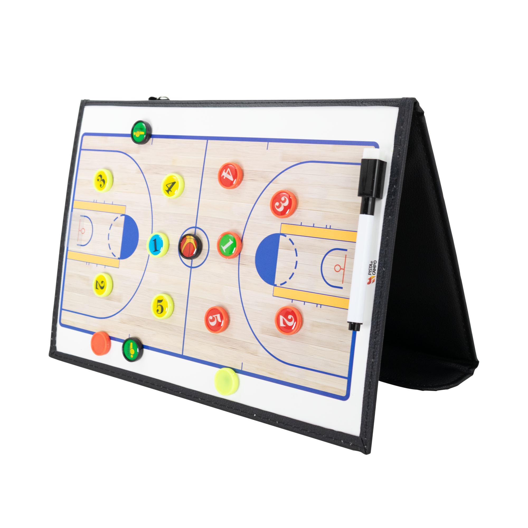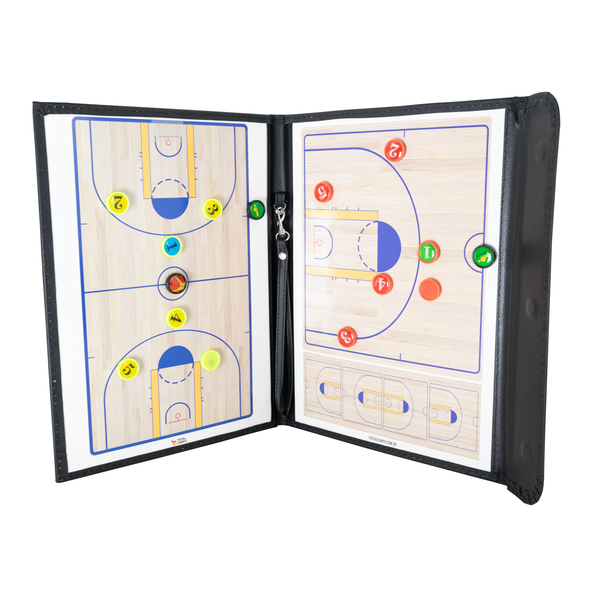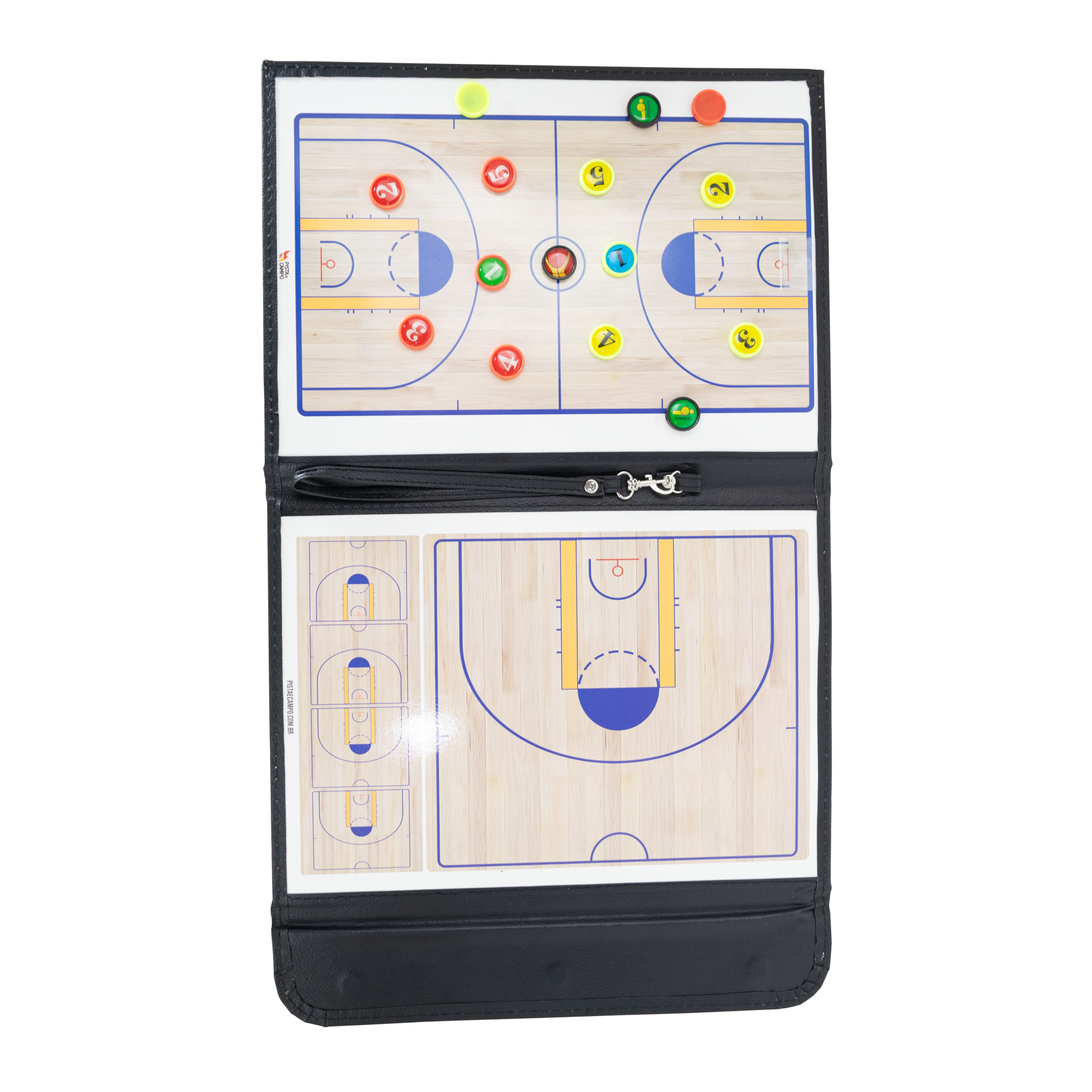 Ferramenta prática para planejar táticas em treinos e jogos. A pasta magnética exibe quadra inteira e meia quadra para visualizar formações e ajustes rápidos. Superfície de quadro branco com ímãs numerados e caneta com apagador. Acabamento em couro sintético preto, portátil e resistente.