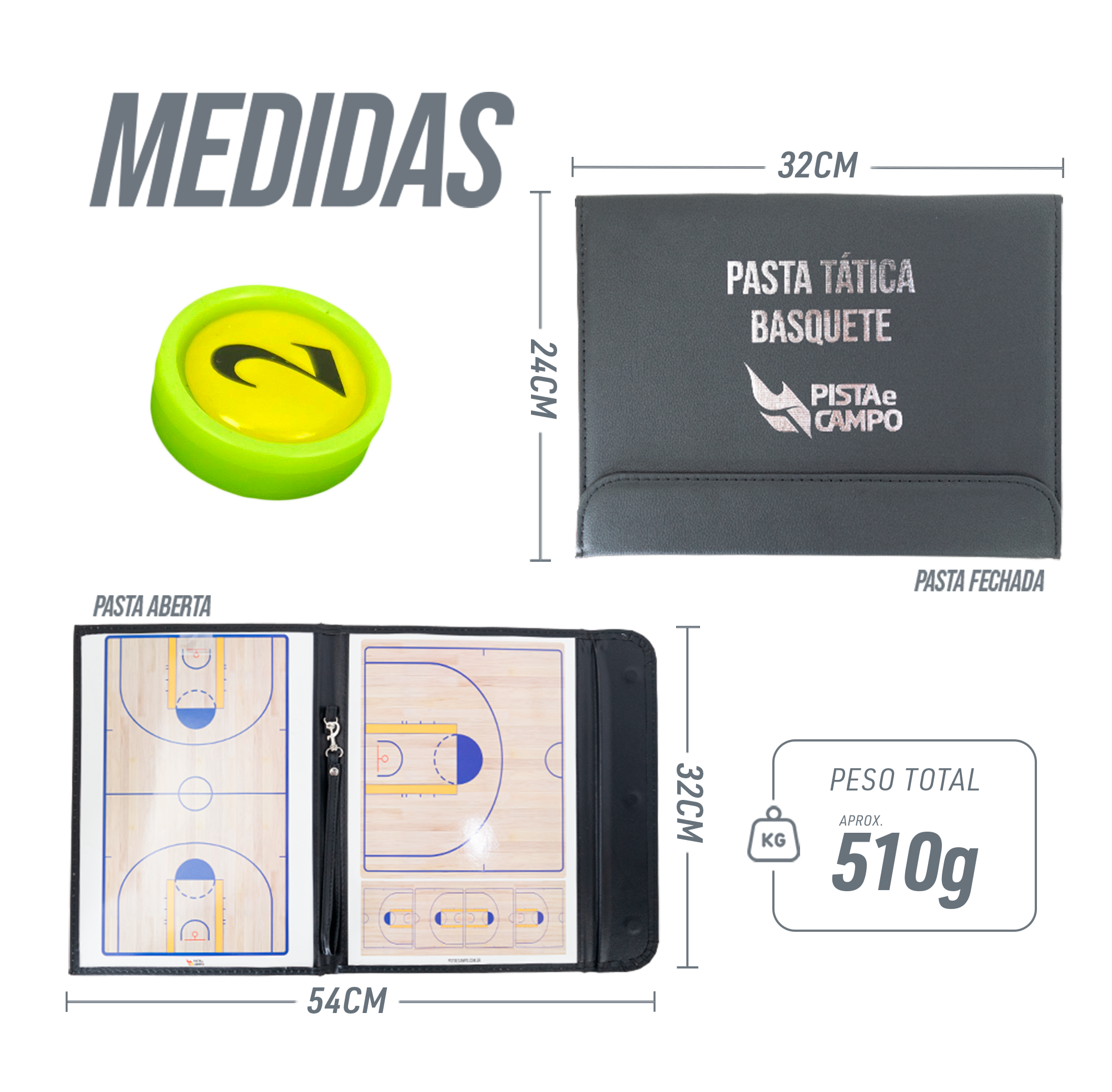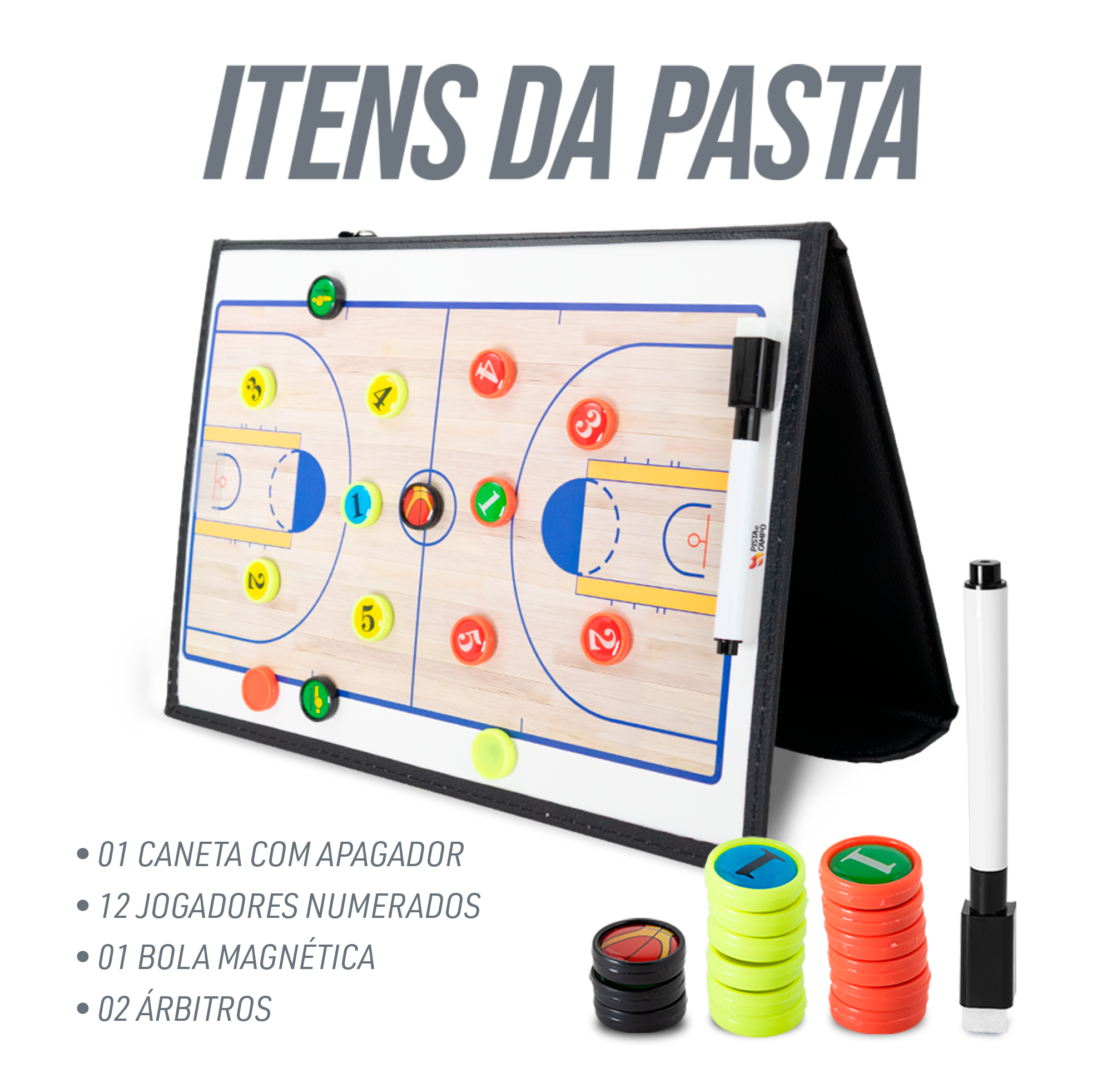 Se o objetivo é alinhar o time com clareza, esta prancheta tática magnética de basquete faz a diferença no intervalo e no treino. O formato em pasta abre em duas páginas: de um lado você tem a quadra inteira, do outro, a meia quadra para ajustes finos de jogadas. É abrir, posicionar os ímãs e conduzir a conversa olhando para a mesma referência que os atletas veem dentro do jogo. A superfície é dupla função: magnética e tipo quadro branco. Isso permite desenhar setas, rotas e responsabilidades com o marcador e, ao mesmo tempo, mover as peças para simular espaçamentos, bloqueios e trocas defensivas. O kit vem completo para começar: 12 ímãs de jogadores numerados, 2 de árbitros e 1 de bola, além da caneta com apagador. As peças aderem bem, o que facilita explicar mesmo com a pasta na vertical. O acabamento externo em couro sintético preto protege as páginas e dá um aspecto profissional para levar a quadra, ao banco de reservas ou à sala de vídeo. Fechada, a pasta ocupa pouco espaço na mochila; aberta, oferece uma área ampla e limpa para orientar a equipe. O peso leve ajuda no transporte diário entre treinos e jogos. A leitura do layout é objetiva. A quadra inteira permite planejar a saída de bola, organização defensiva e transição. Na meia quadra, fica fácil detalhar gatilhos de pick-and-roll, opções de backdoor, flares e ajustes de cobertura. Com o quadro branco, você registra variações, chama um time-out e rapidamente limpa para a próxima instrução. Na rotina, a manutenção é simples: use apenas marcadores próprios para quadro branco e limpe com o apagador ou pano macio levemente umedecido. Essa combinação preserva a lisura da superfície e mantém os traços visíveis por muito tempo. O material magnético continua firme, garantindo que as peças permaneçam no lugar durante a explicação. É uma ferramenta prática para treinadores, auxiliares e professores que precisam de comunicação visual rápida. Em escolas de basquete, clubes ou equipes amadoras e profissionais, ela padroniza a linguagem da comissão técnica e melhora o entendimento coletivo. Quando o desenho da jogada está à vista, as decisões ficam mais objetivas e o treino rende mais. Se você busca organização, clareza e portabilidade numa única solução, esta prancheta entrega tudo isso. Leve para a quadra, alinhe o time e otimize cada intervalo. Garanta a sua na Pista e Campo e conduza suas sessões com precisão.