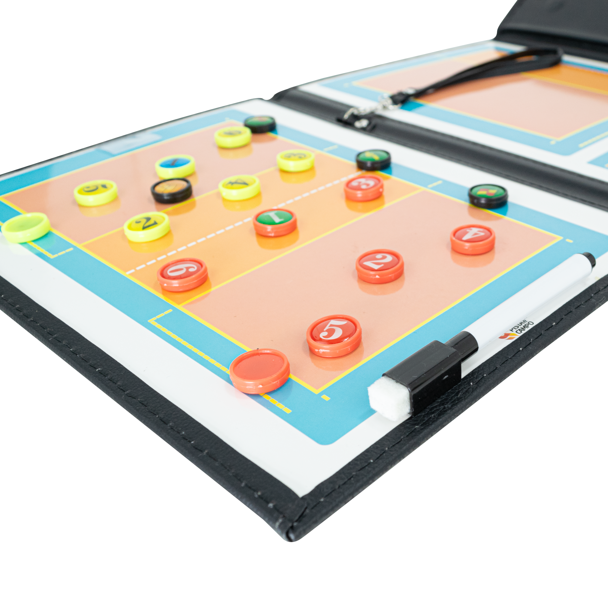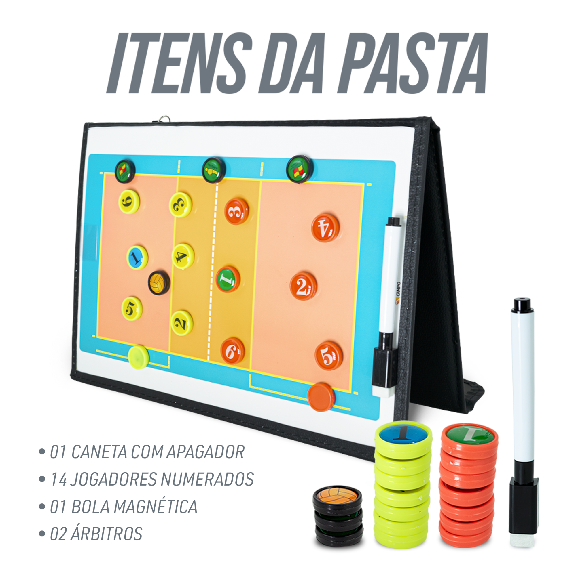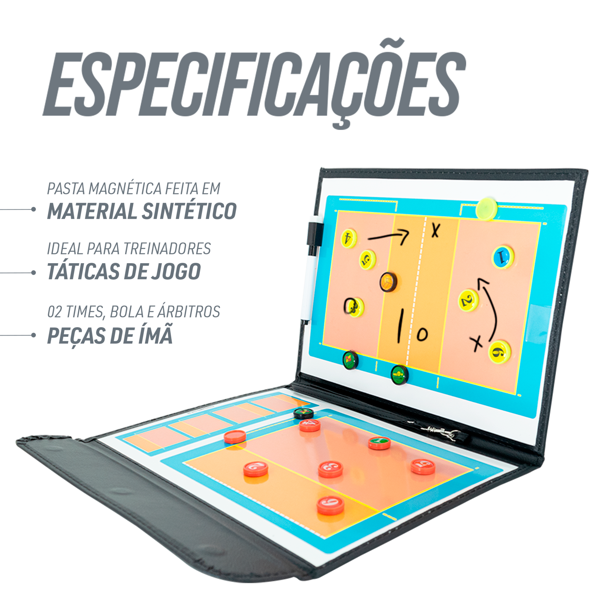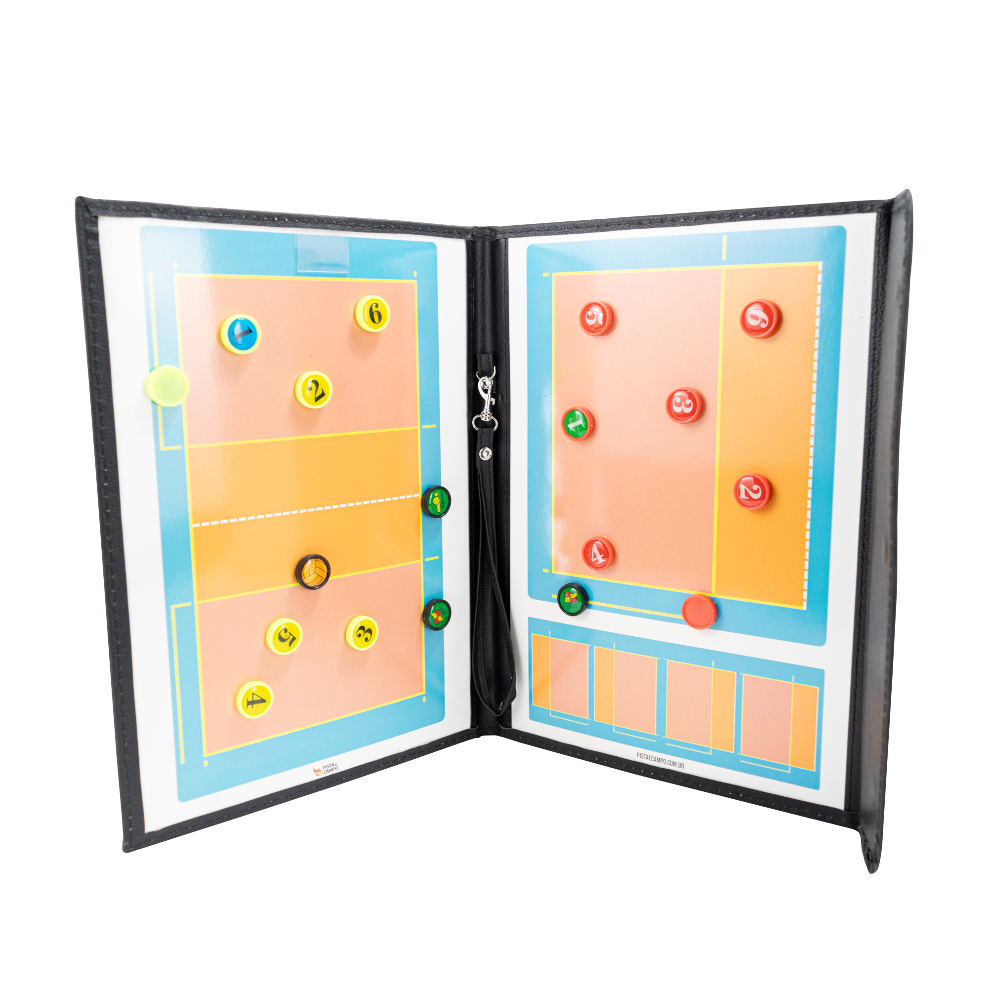 Ferramenta prática para treinos e jogos de vôlei, com superfície magnética tipo quadro branco para desenhar e reposicionar jogadas. Um lado exibe a quadra inteira e o outro meia quadra para orientações específicas. Acompanha imãs e caneta com apagador para uso imediato. Formato tipo pasta em couro sintético, leve e fácil de transportar.