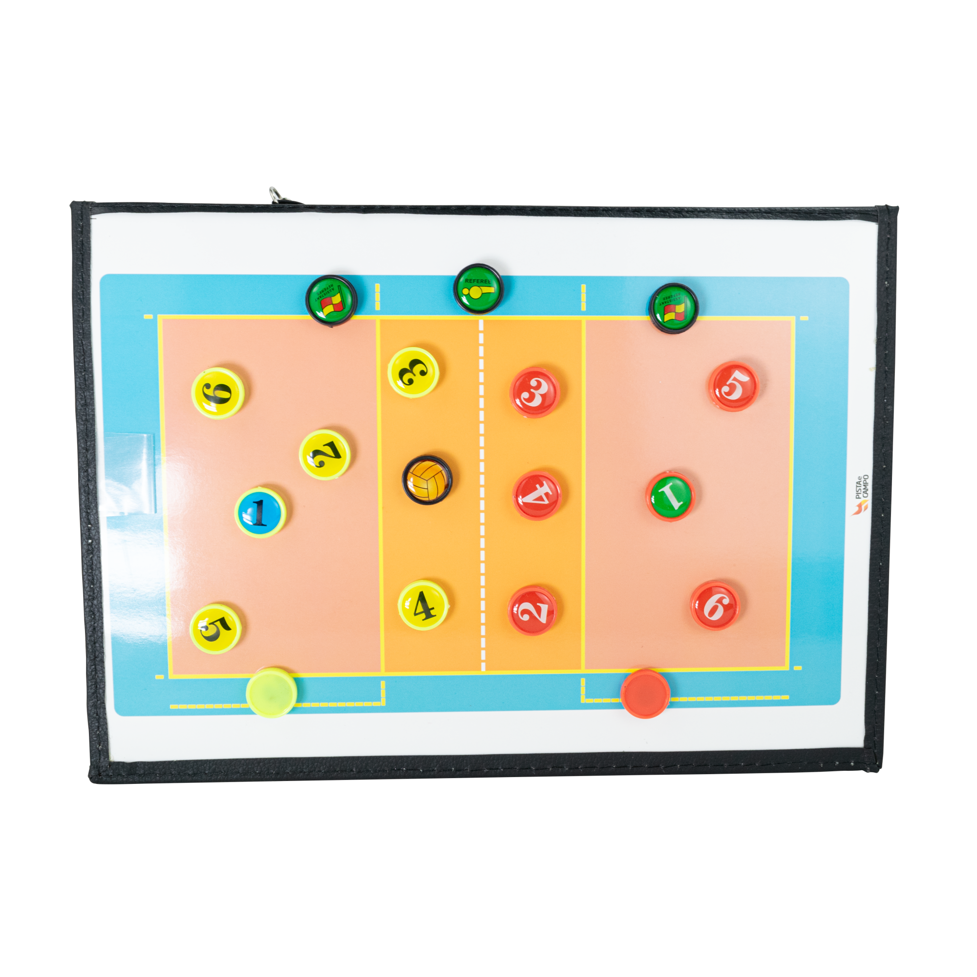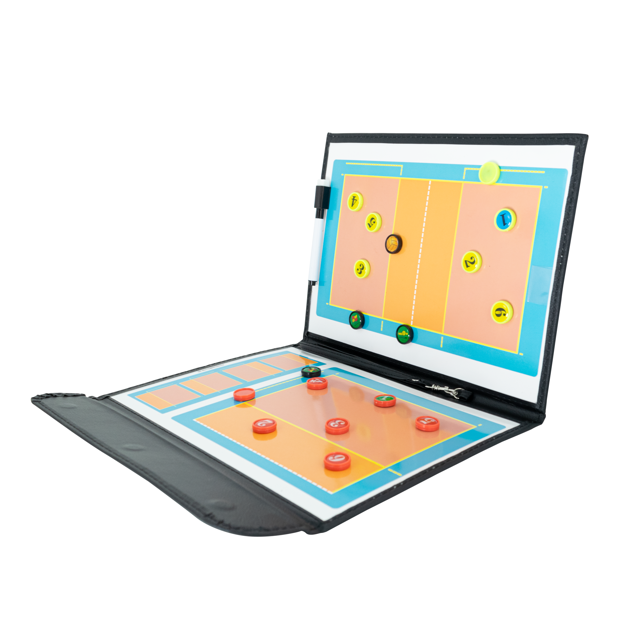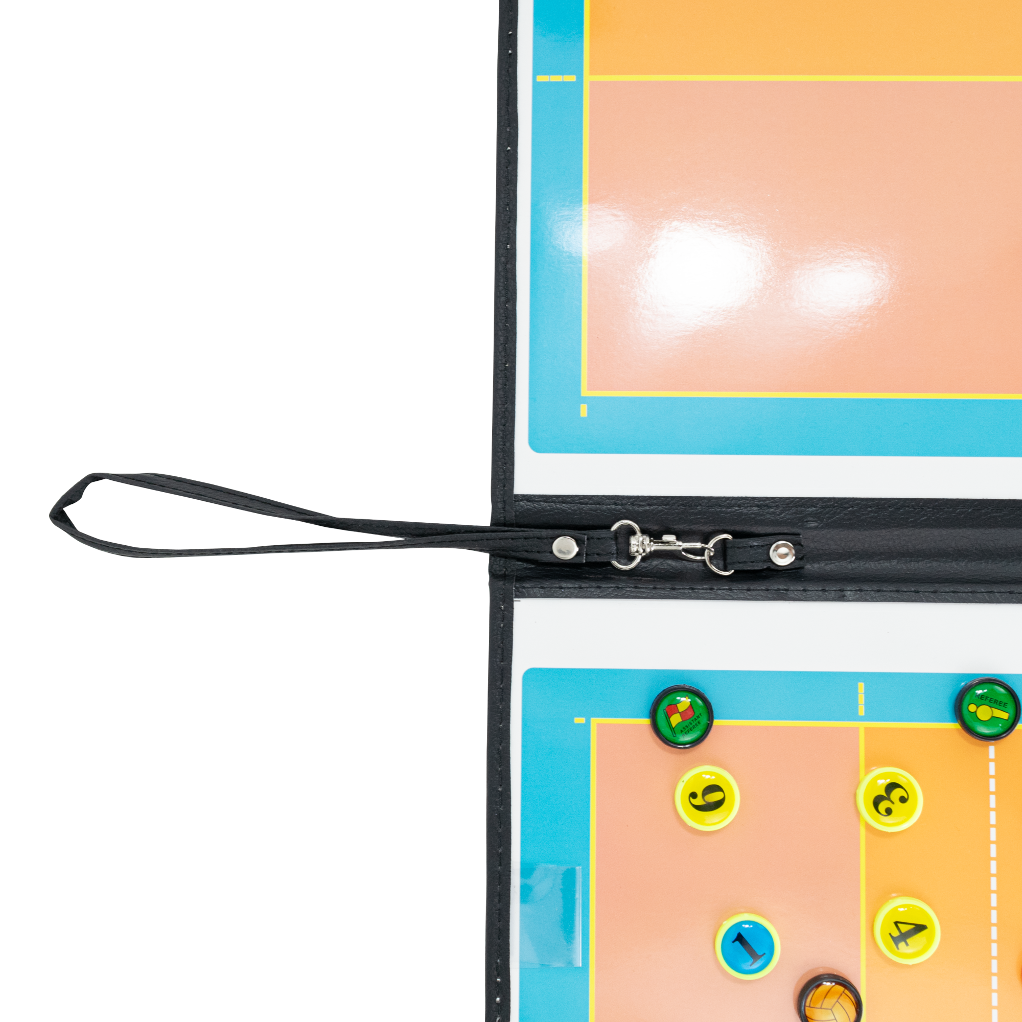 Ferramenta prática para treinos e jogos de vôlei, com superfície magnética tipo quadro branco para desenhar e reposicionar jogadas. Um lado exibe a quadra inteira e o outro meia quadra para orientações específicas. Acompanha imãs e caneta com apagador para uso imediato. Formato tipo pasta em couro sintético, leve e fácil de transportar.