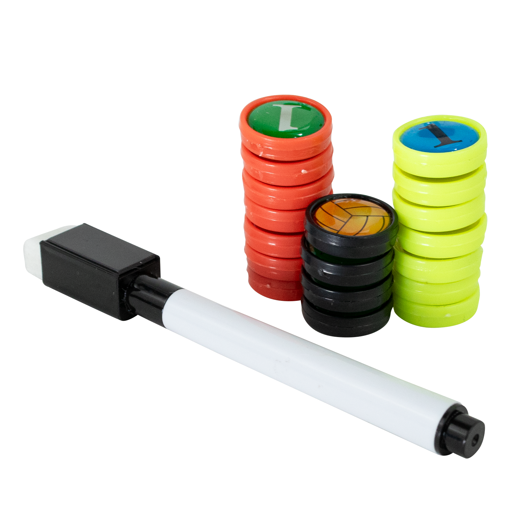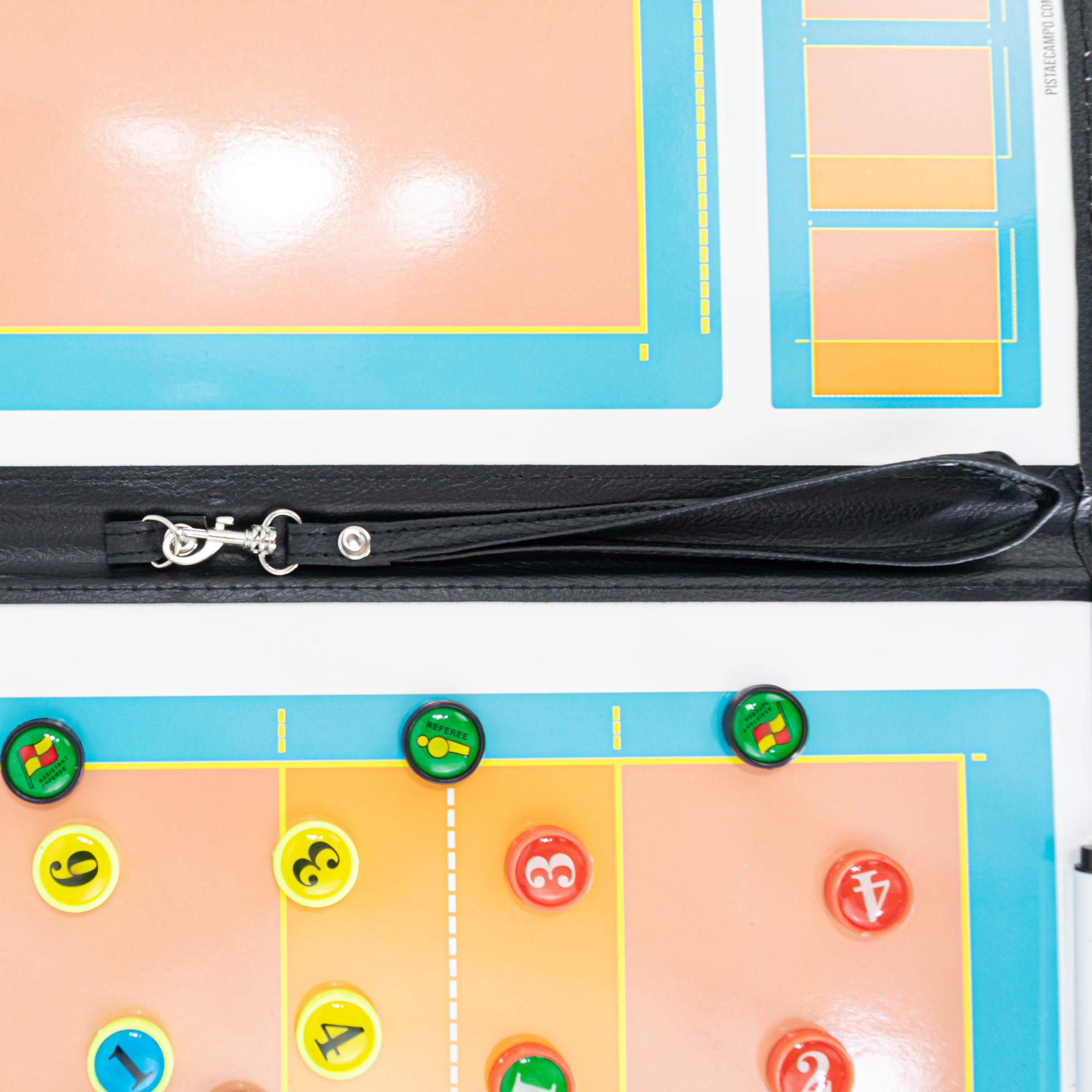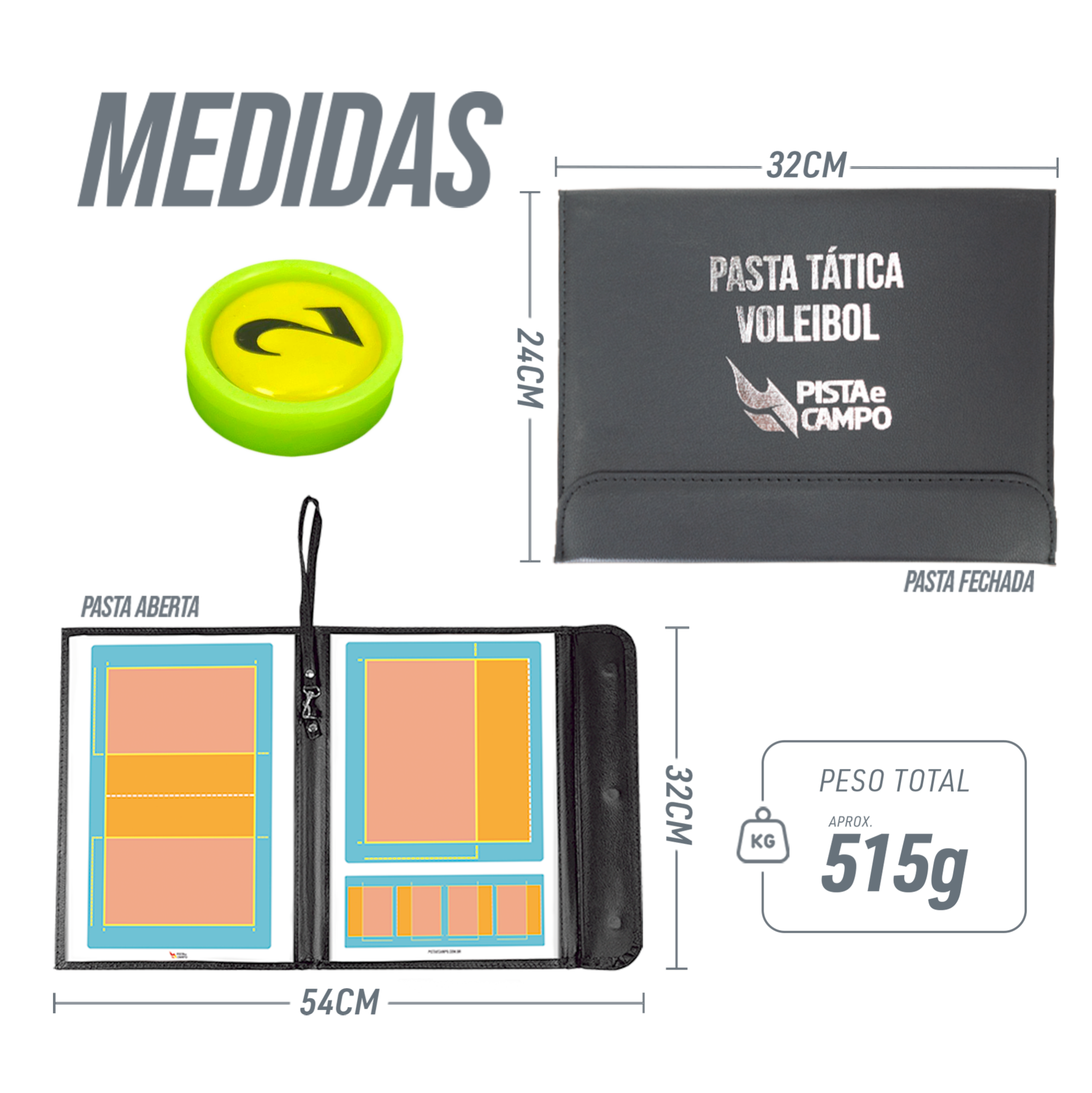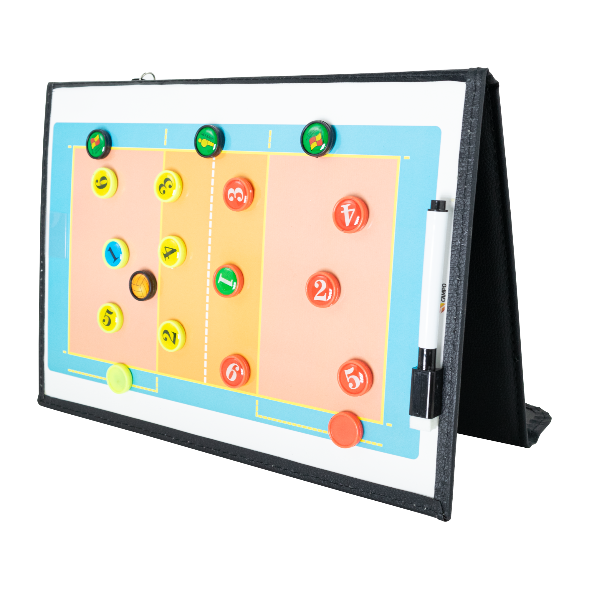 Ferramenta prática para treinos e jogos de vôlei, com superfície magnética tipo quadro branco para desenhar e reposicionar jogadas. Um lado exibe a quadra inteira e o outro meia quadra para orientações específicas. Acompanha imãs e caneta com apagador para uso imediato. Formato tipo pasta em couro sintético, leve e fácil de transportar.