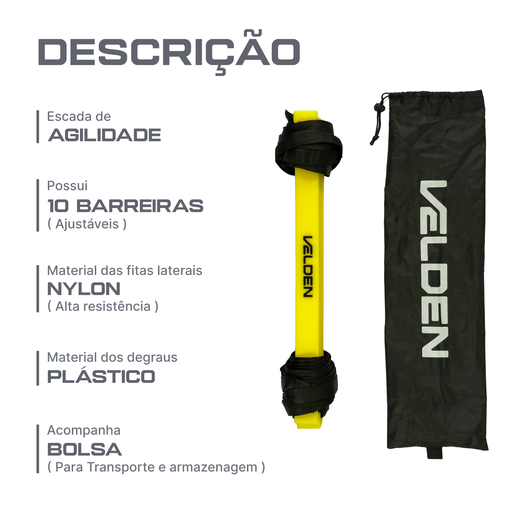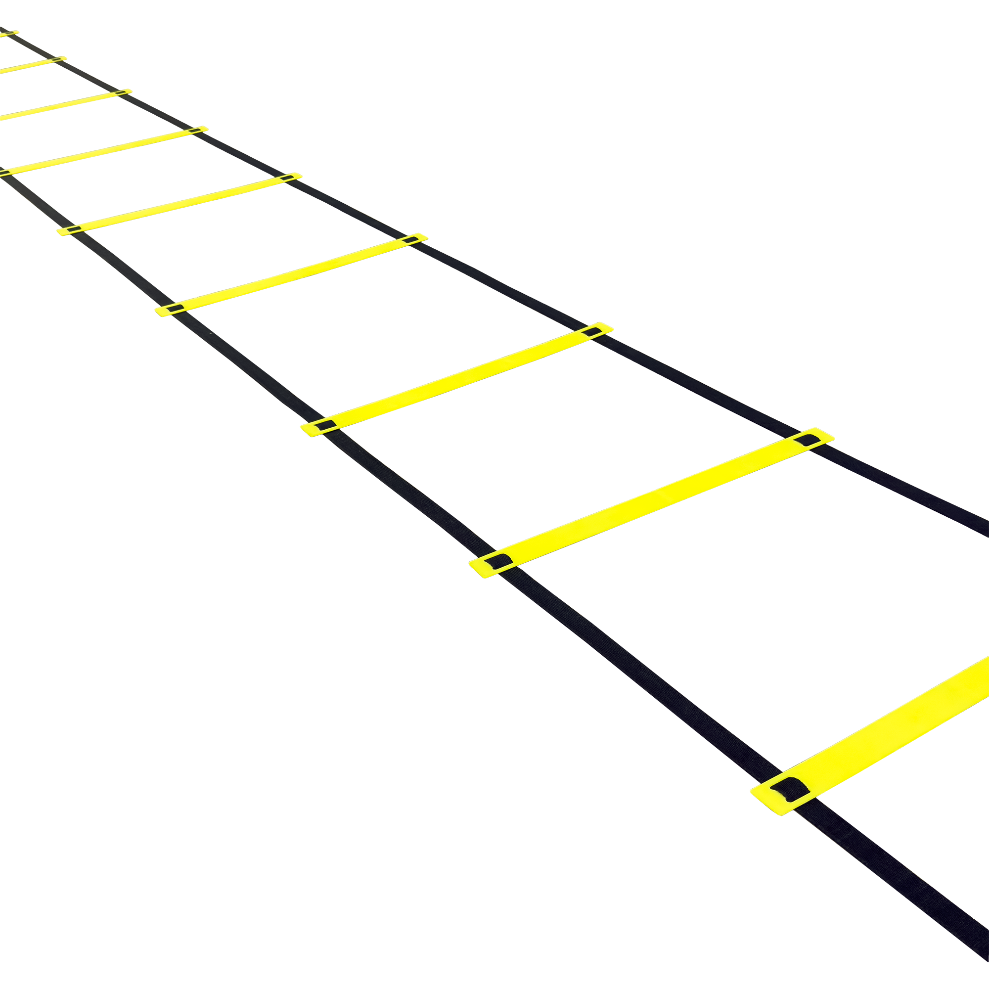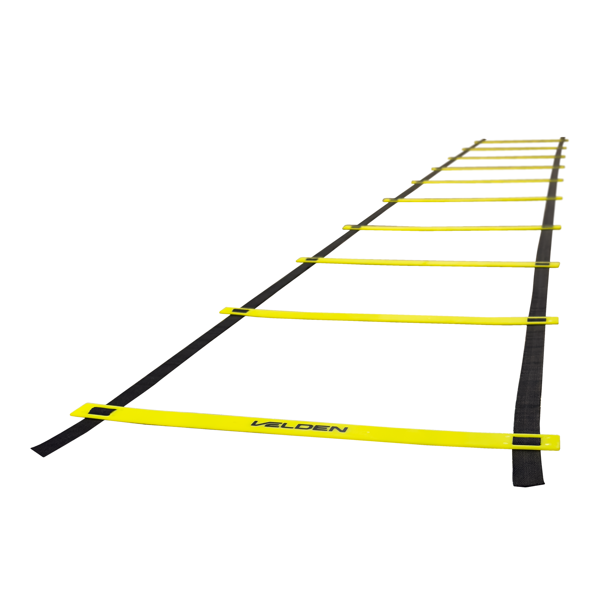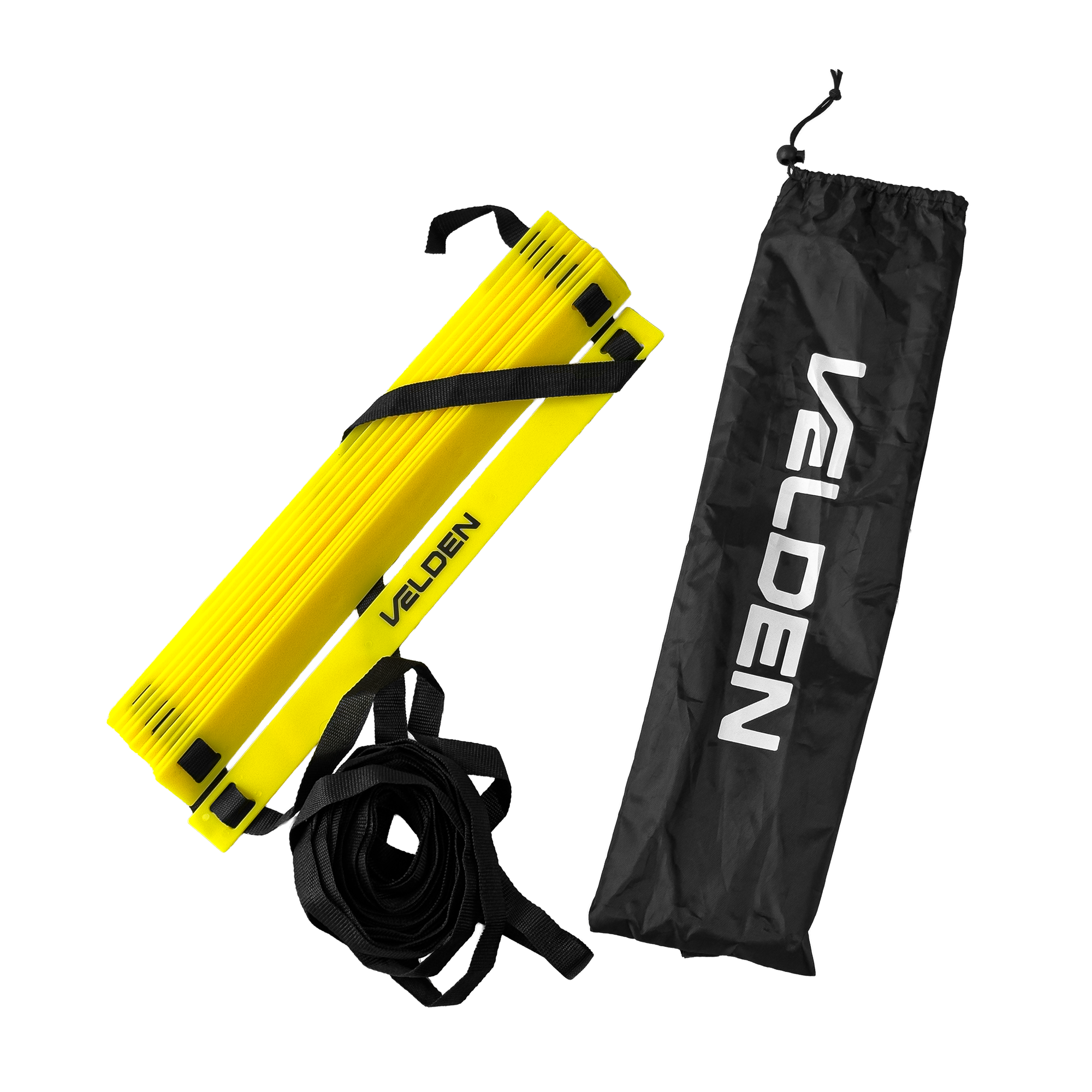 Escada de agilidade para treinos de velocidade, coordenação e mudança de direção. Degraus em PVC ajustáveis sobre fitas de nylon de alta resistência, com alta visibilidade amarela. Leve e dobrável, acompanha bolsa para transporte. Engate rápido nas pontas para conectar outras escadas e ampliar o circuito.