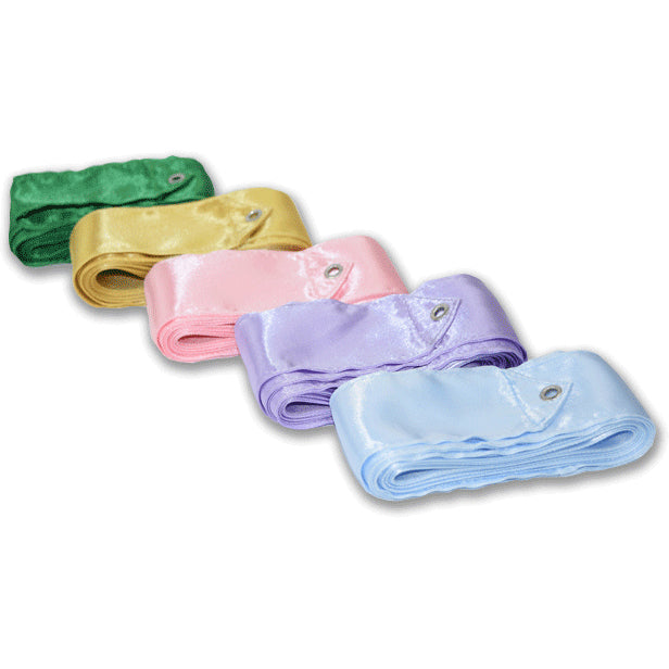 Fita de ginástica rítmica. Com 50mm de largura e 6m de comprimento (categoria adulto). Primeiro metro duplo. Peso oficial. Ilhós na ponta. Cetim de alta qualidade, brilhante, com solda nos cantos. Modelo de alta qualidade, para atletas iniciantes ou profissionais.