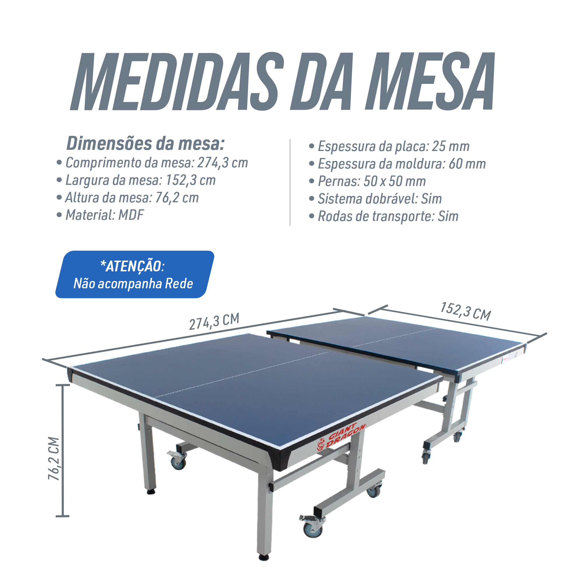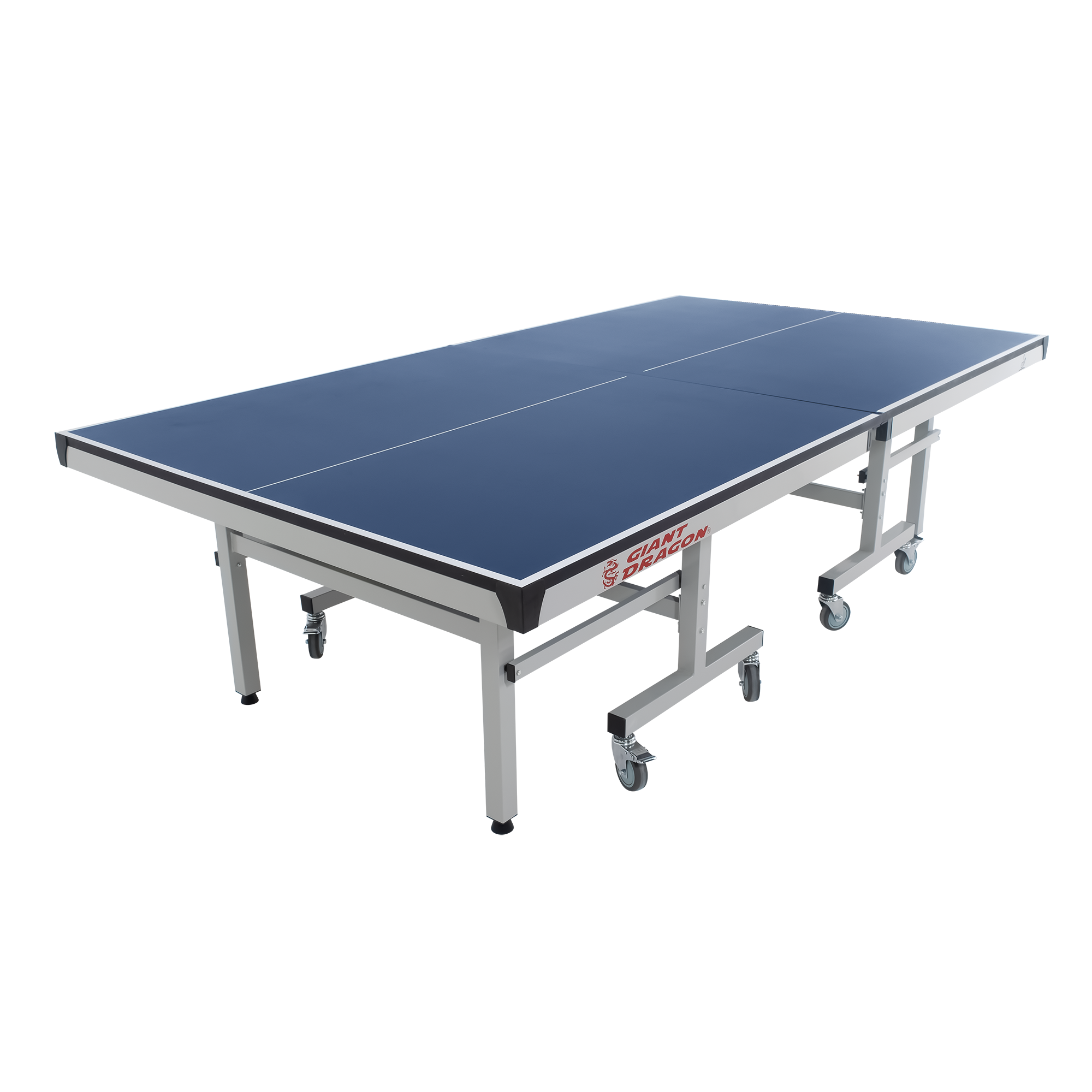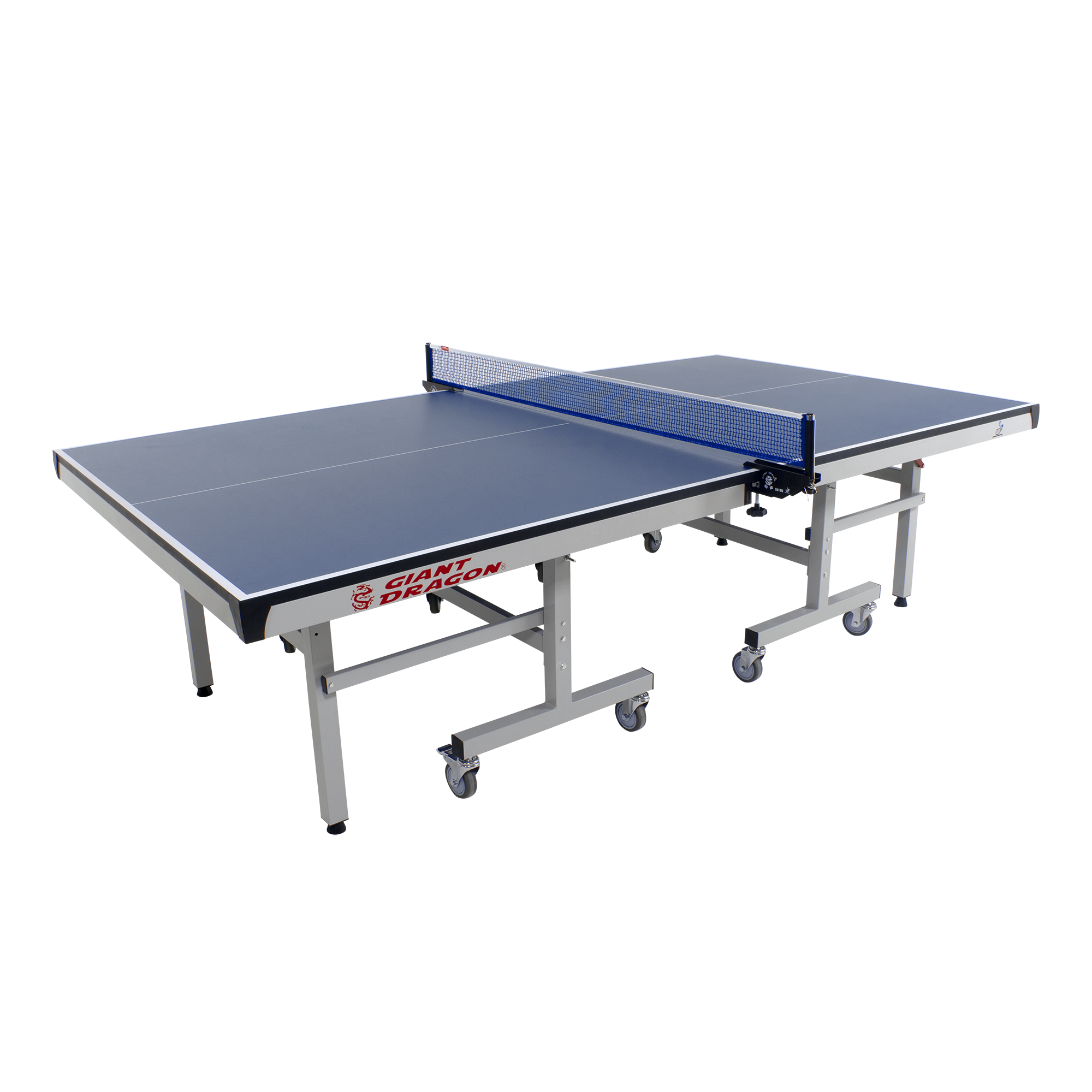 Mesa de tênis de mesa tamanho oficial certificada pela ITTF, dobrável e ajustável Giant Dragon. Fabricada com o melhor MDF do mercado, com estrutura e acabamento metálicos. Pés de metal com rodas e trava. Dobrável para fácil armazenamento e transporte. Ajustável para que apenas um jogador possa se divertir e treinar. Ideal para competições e treino. Produto de alta qualidade e durabilidade, com visual diferenciado: chapa na cor azul royal escuro e bordas em cinza. Uso indoor. Dimensões: 274 x 152,5 x 76 cm.