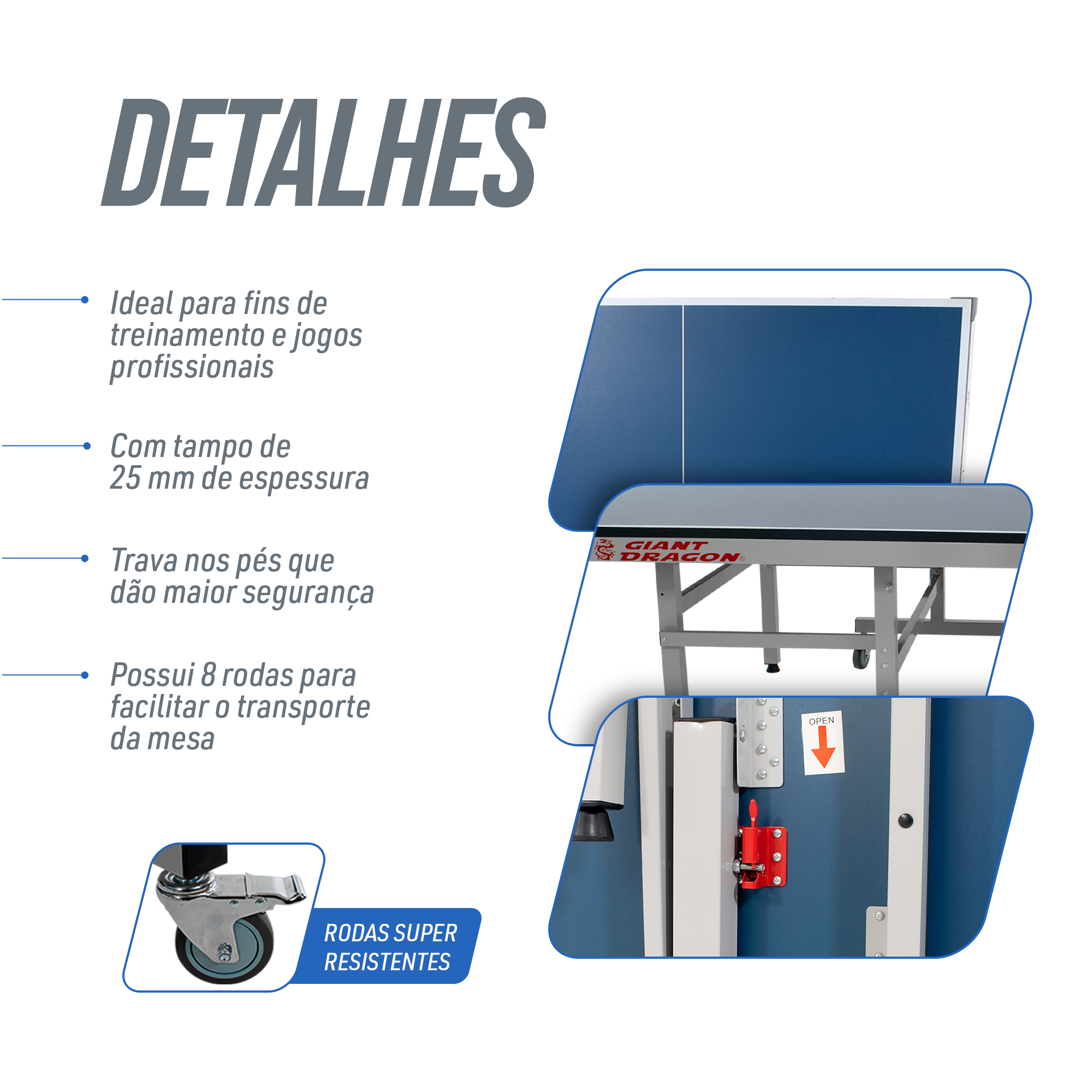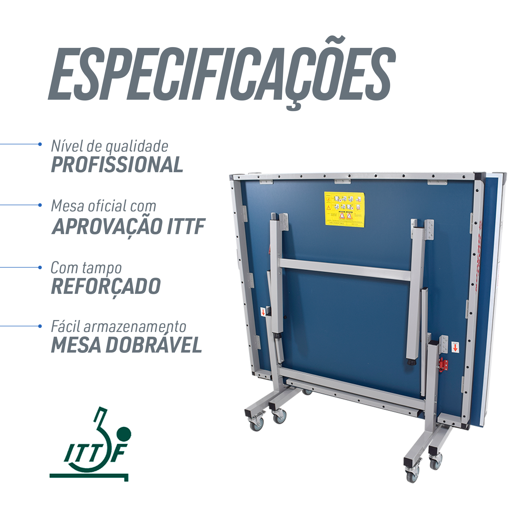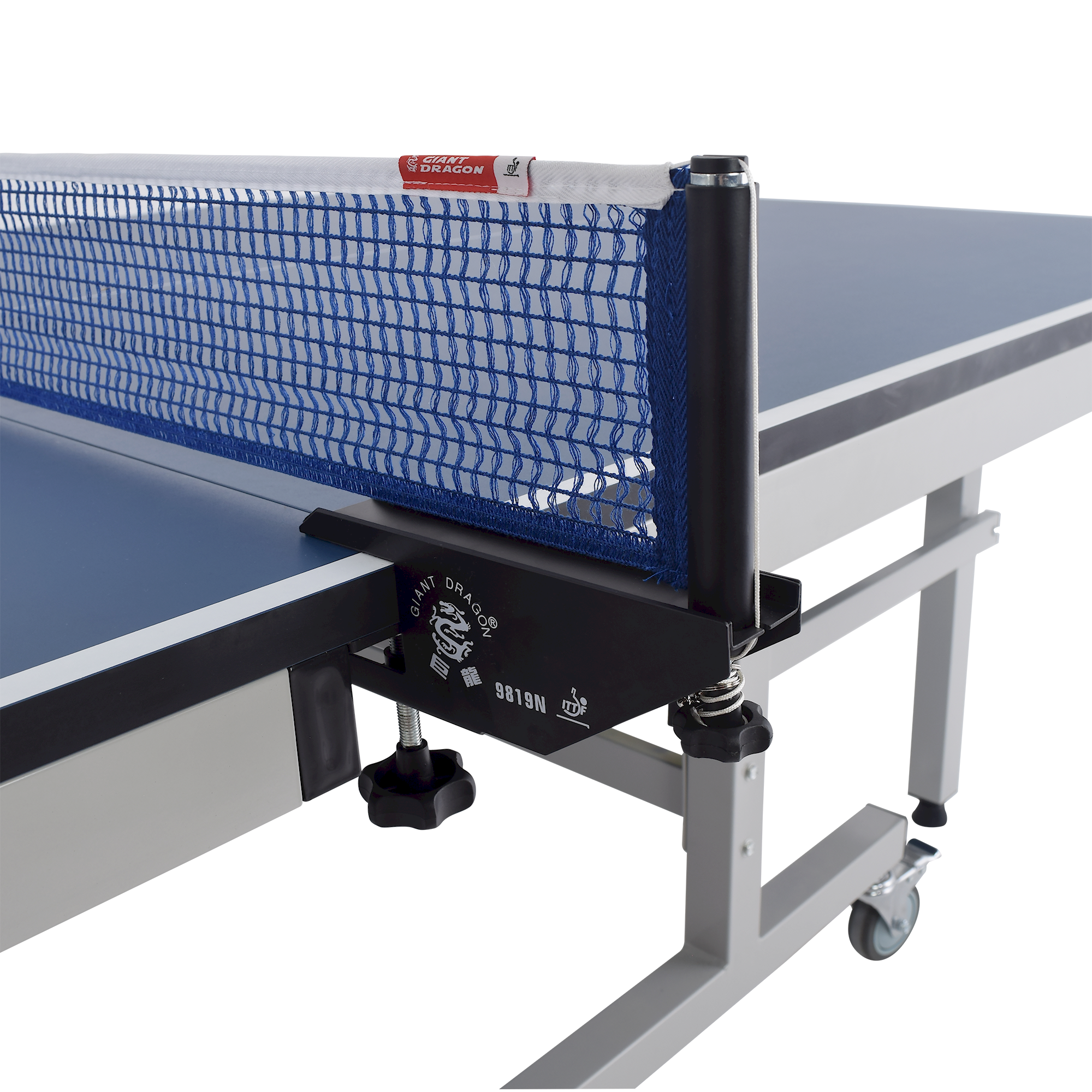 Mesa de tênis de mesa tamanho oficial certificada pela ITTF, dobrável e ajustável Giant Dragon. Fabricada com o melhor MDF do mercado, com estrutura e acabamento metálicos. Pés de metal com rodas e trava. Dobrável para fácil armazenamento e transporte. Ajustável para que apenas um jogador possa se divertir e treinar. Ideal para competições e treino. Produto de alta qualidade e durabilidade, com visual diferenciado: chapa na cor azul royal escuro e bordas em cinza. Uso indoor. Dimensões: 274 x 152,5 x 76 cm.