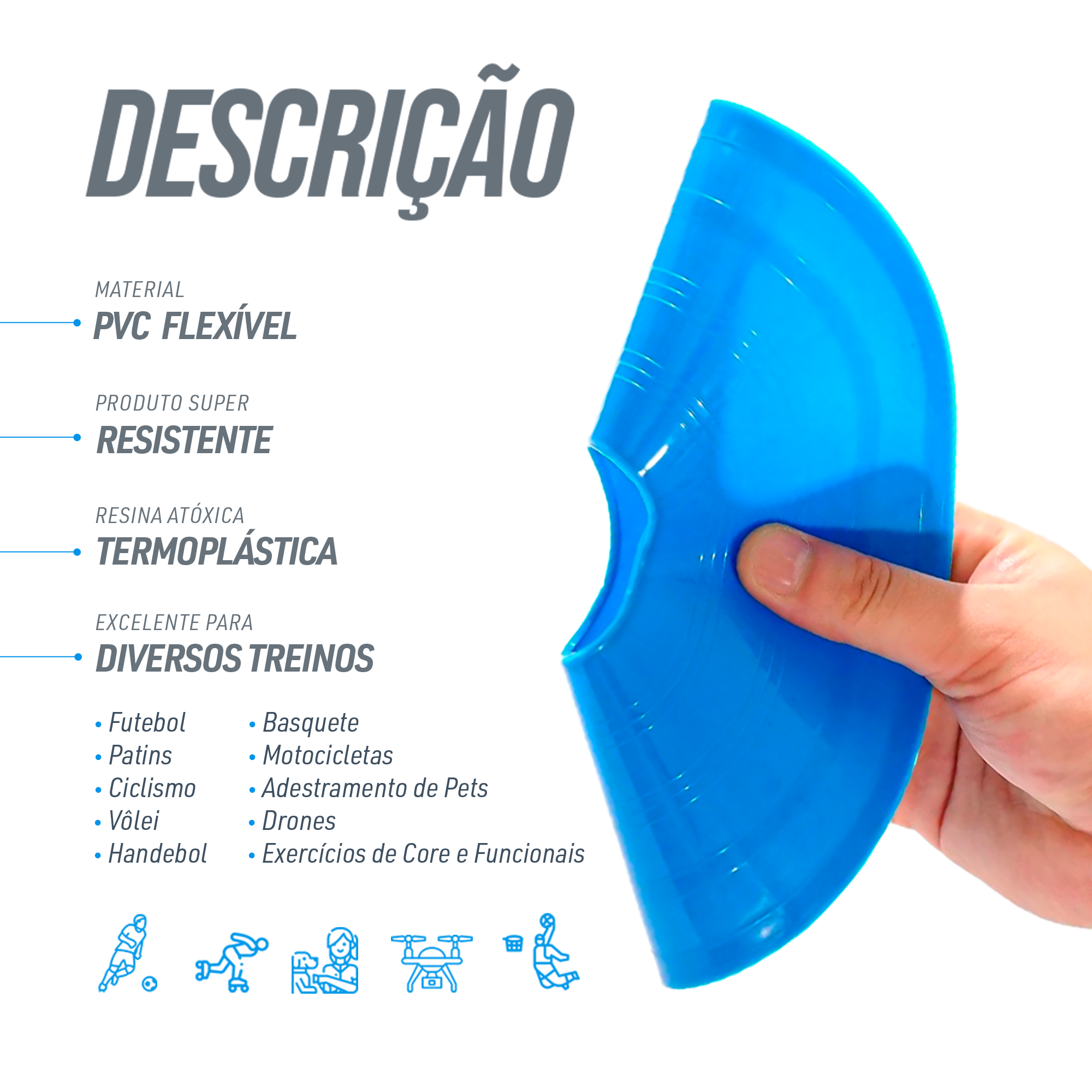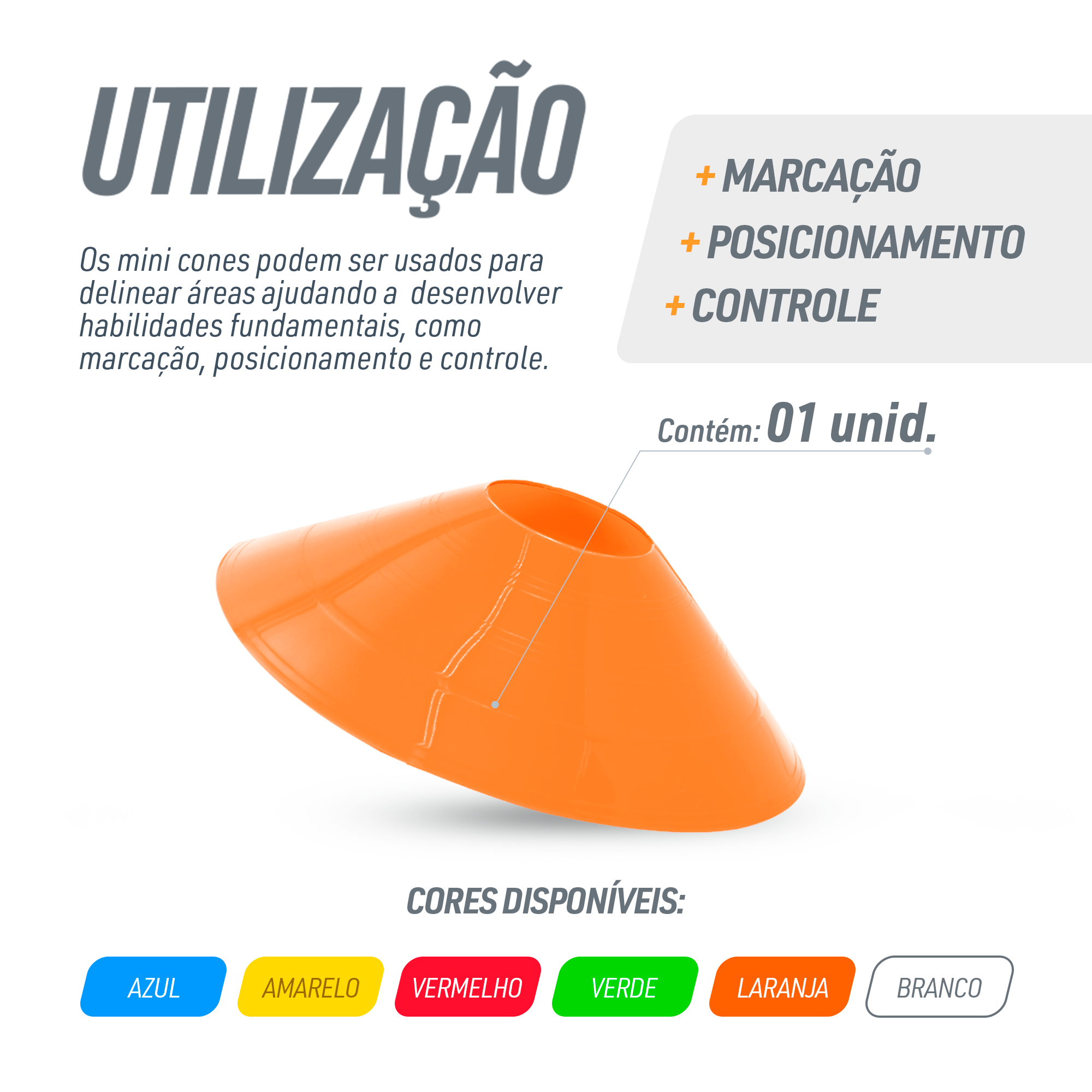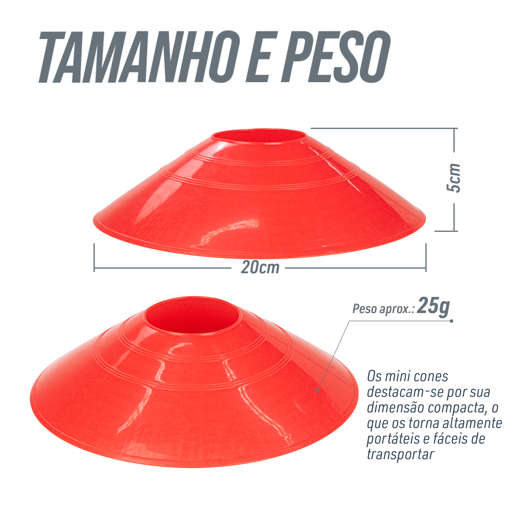 Minicone chapéu avulso de plástico com 5 cm de altura Pista e Campo. Feito de plástico resistente com 20 cm de diâmetro e 5 cm de altura. Também chamado de prato demarcatório ou chapéu chinês, possui diversas aplicações esportivas. Preço unitário. Suporte para transporte vendido separadamente.