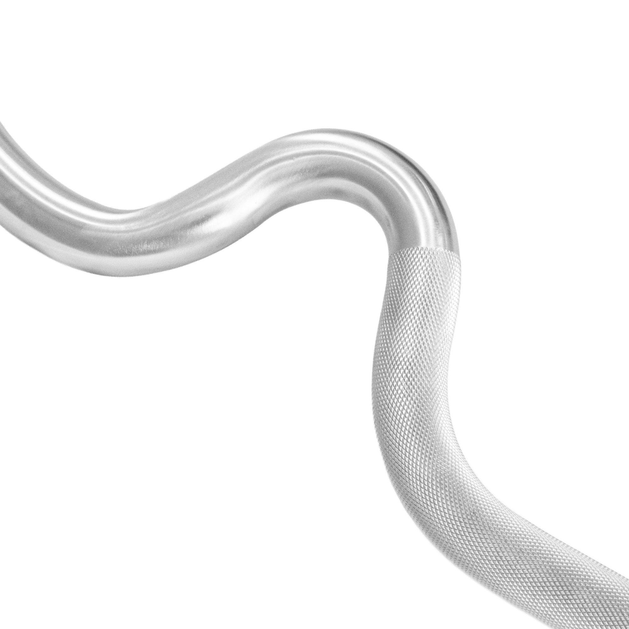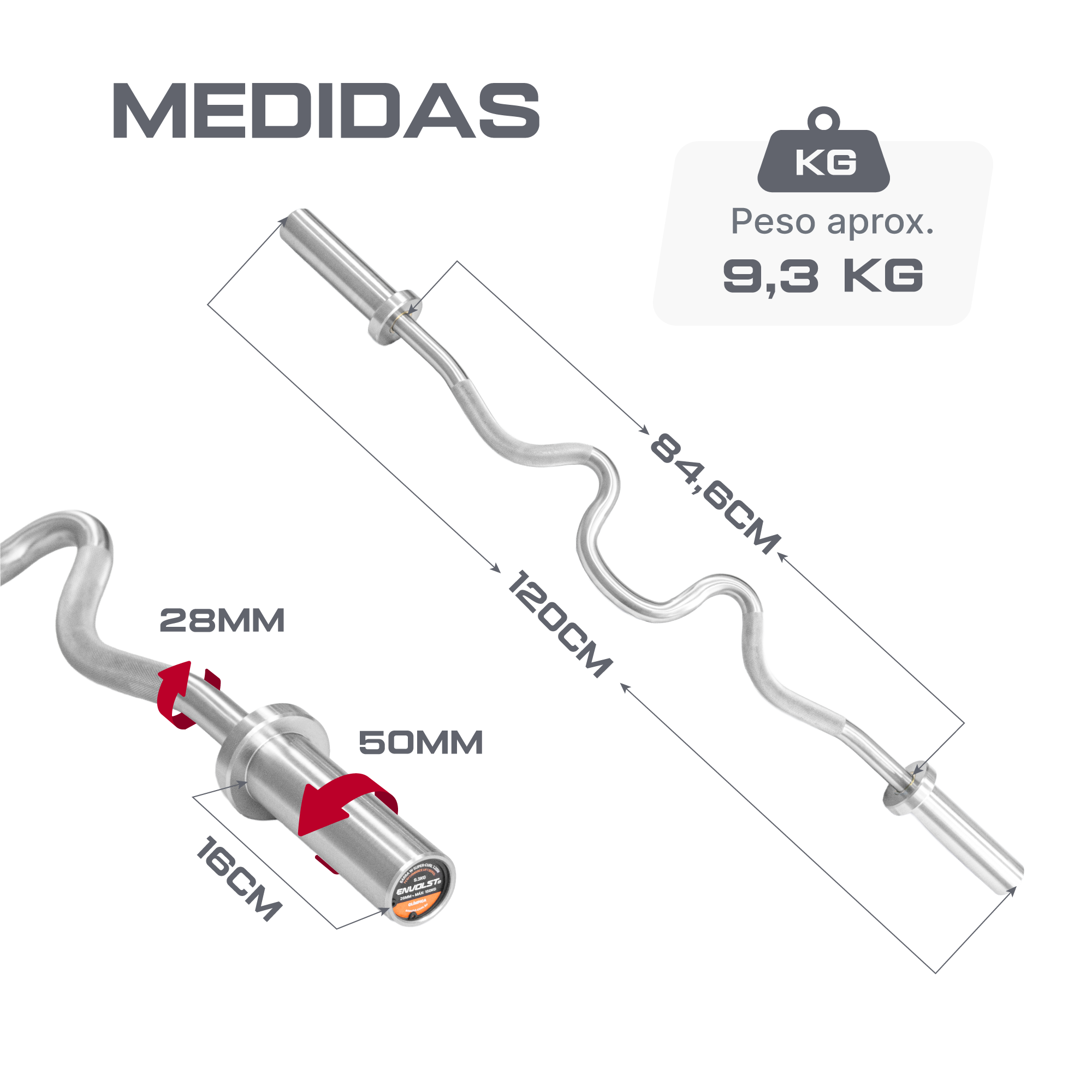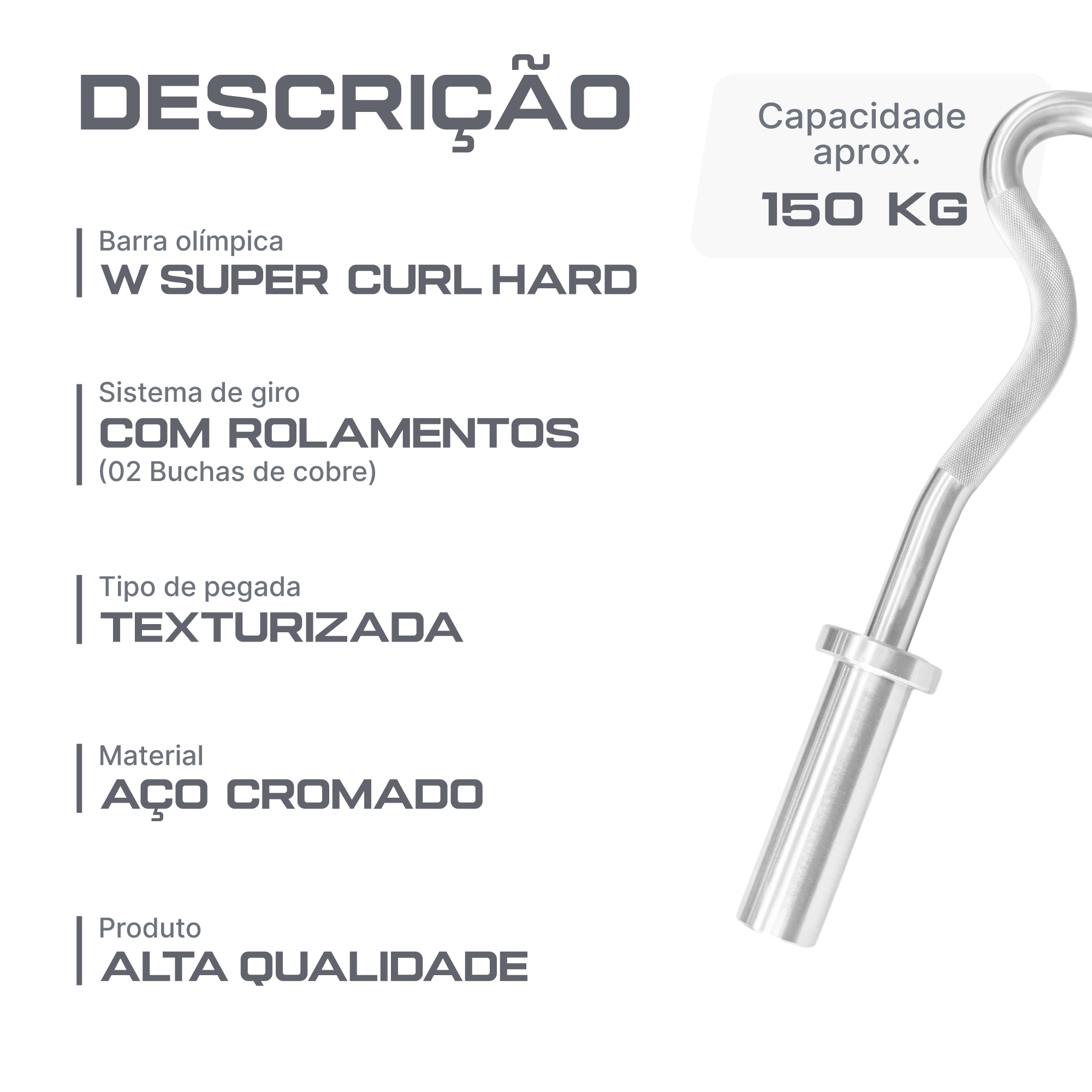 Desenvolvida para treinos de braços, com formato super curl que favorece pegadas naturais e reduz carga nos punhos. Estrutura em aço com acabamento hard chrome e pegada recartilhada de 28 mm. Mangas olímpicas de 50 mm, 16 cm úteis, compatíveis com anilhas 50 mm. Sistema de giro com rolamentos e buchas de cobre para rotação suave.