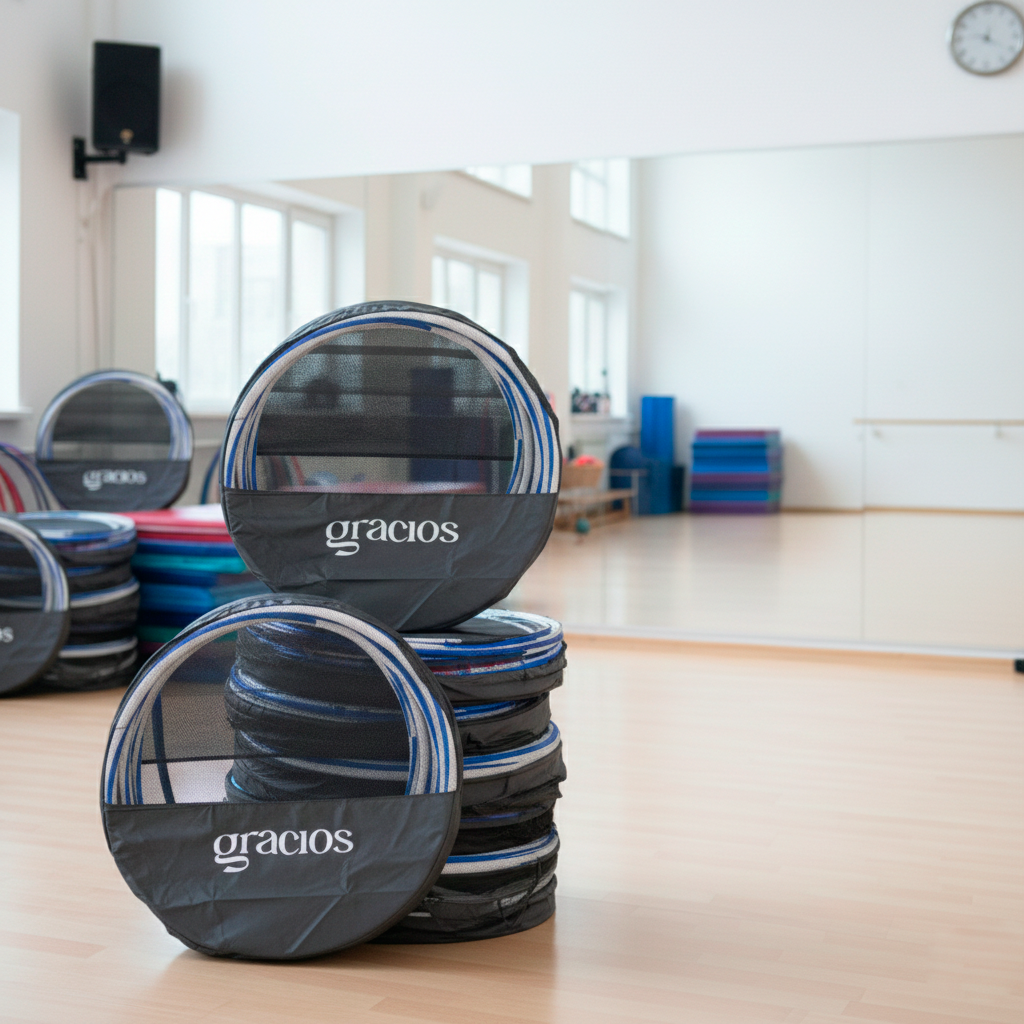 Leve seus bambolês organizados e protegidos em uma bolsa circular com nylon resistente e tela mesh respirável. Compatível com arcos de até 90 cm, comporta até 12 unidades com acesso rápido por zíper perimetral. A alça de mão facilita deslocamentos entre treinos, aulas e competições. Indicado para ginástica rítmica, escolas, estúdios e artistas.