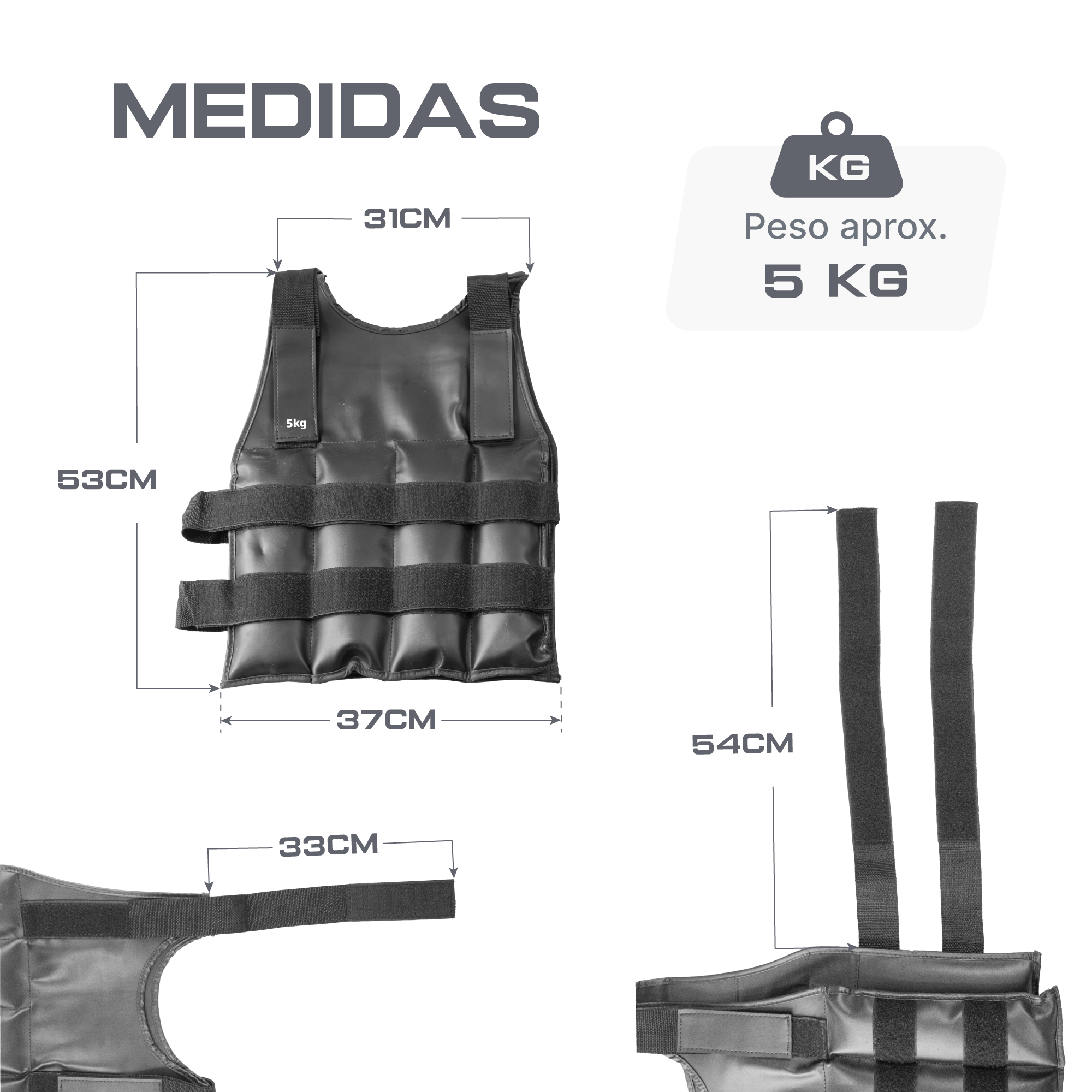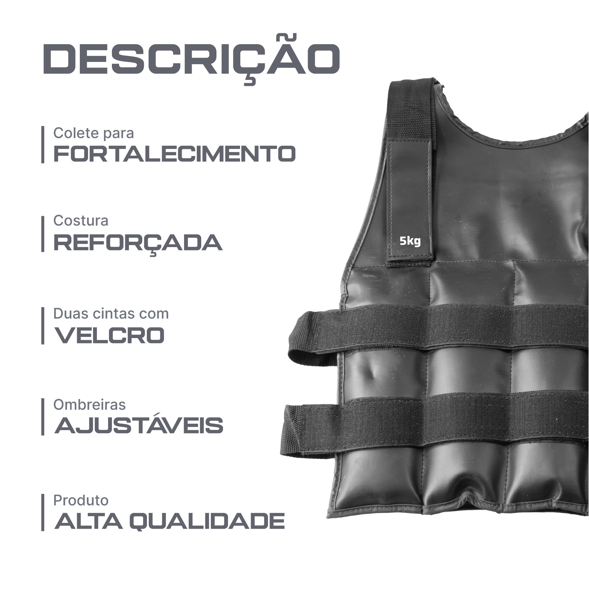 Colete com pesos para treinamento premium. Produto de alta qualidade, emborrachado, com peso de 5 kg. Duas cintas com velcro que garantem que o colete fique bem ajustado ao corpo. Ombreiras ajustáveis. Peso distribuído ao redor do colete. Indicado para o treinamento de força e velocidade.