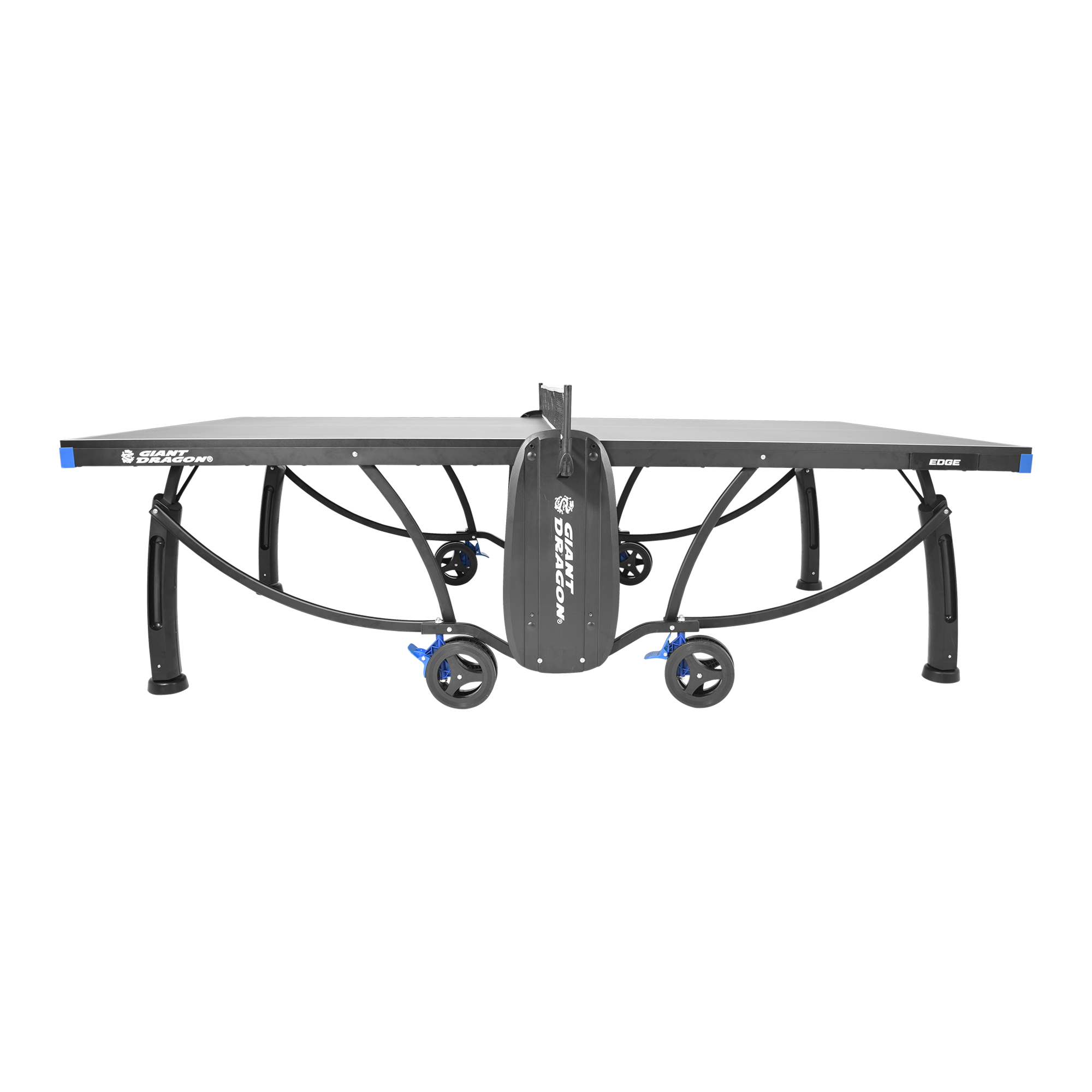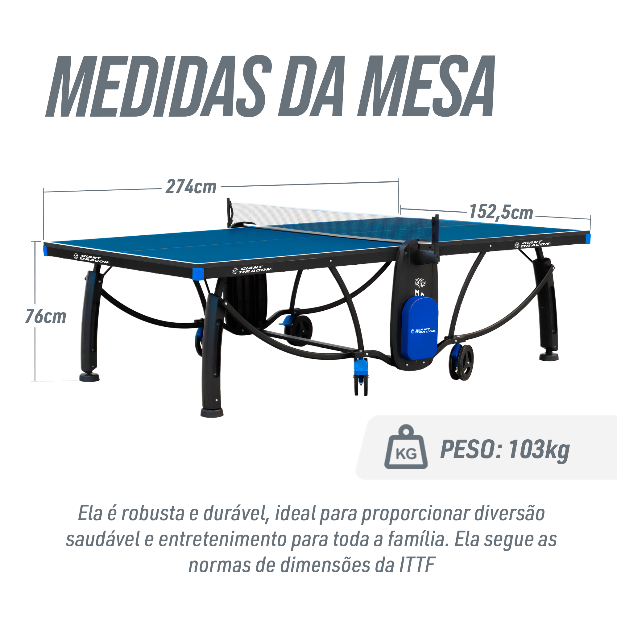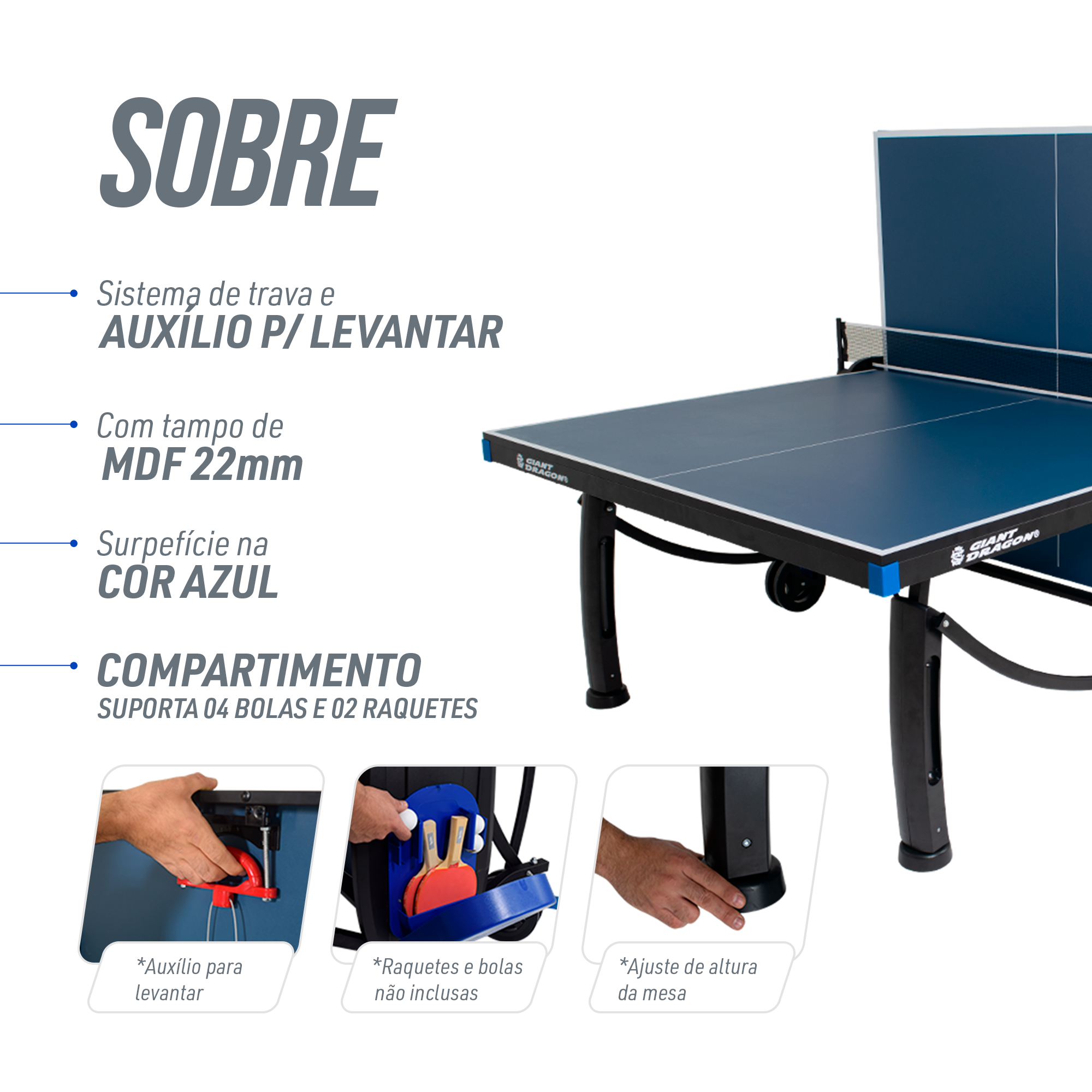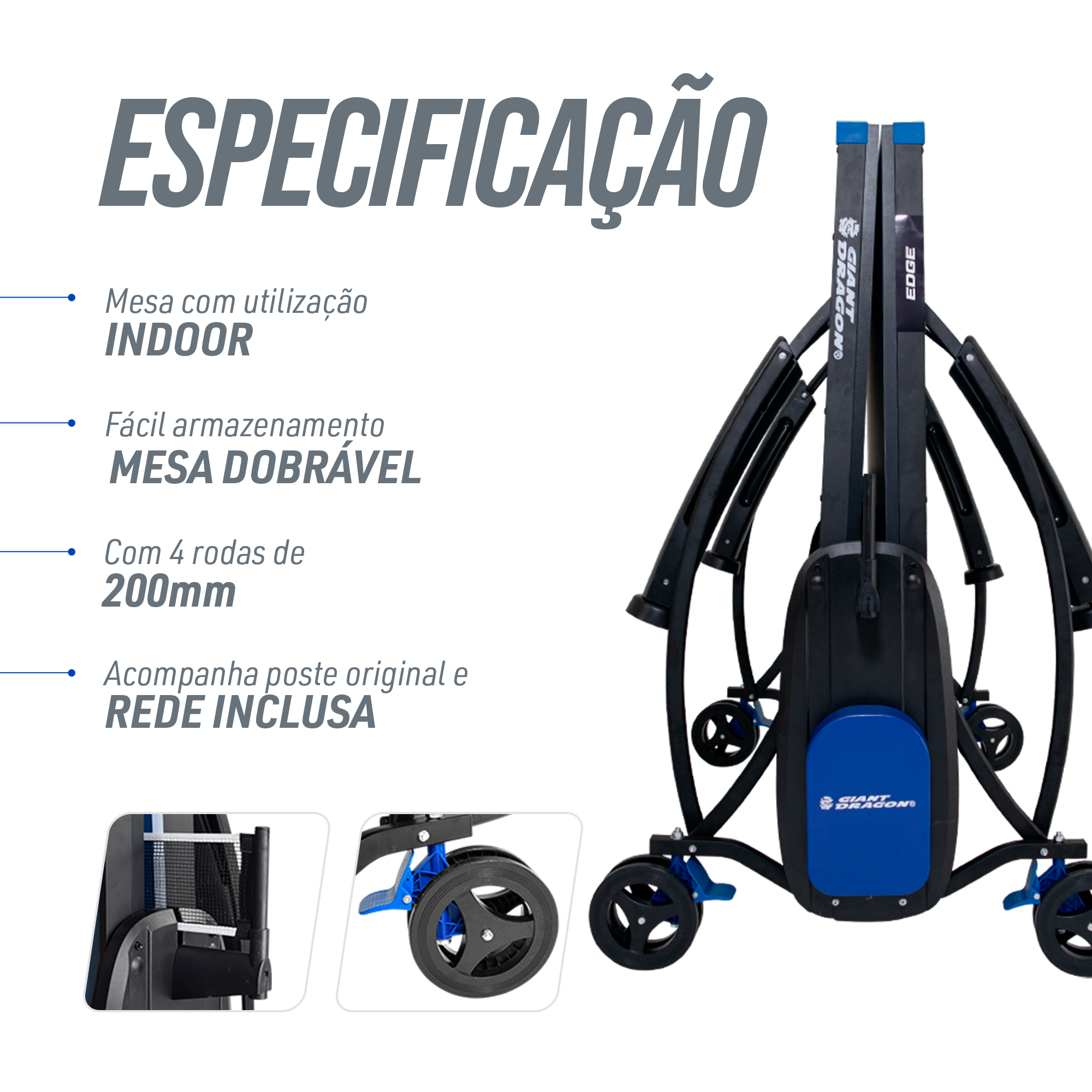 Mesa profissional indoor Giant Dragon Edge com tampo em MDF de 22 mm e pintura azul antirreflexo. Estrutura metálica robusta, rodas duplas de 200 mm com trava, paredão para treino solo e sistema de dobra fácil. Possui suporte lateral para raquetes e bolas. Acompanha rede de algodão e suportes tipo jacaré. Ideal para jogos técnicos e treinos intensivos.