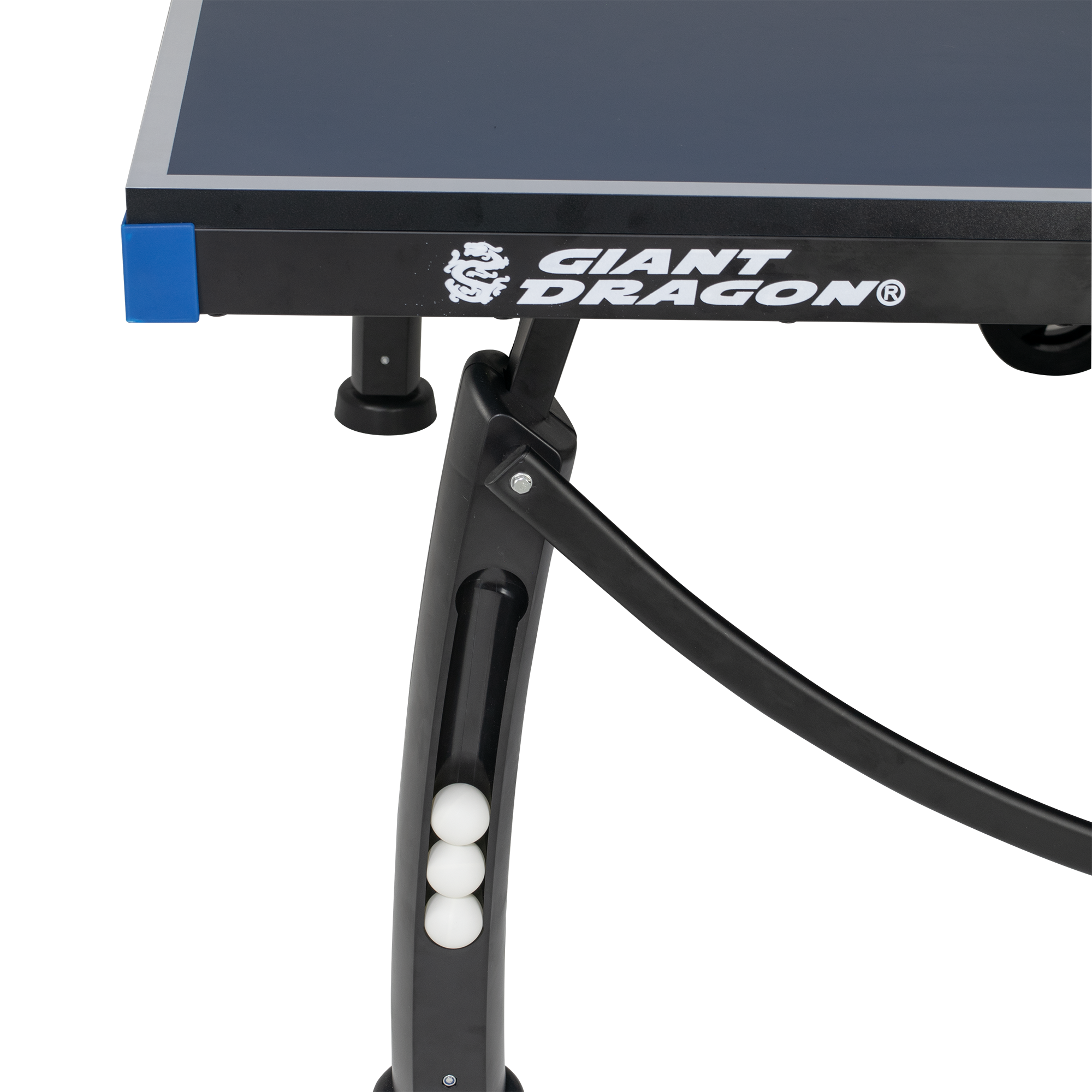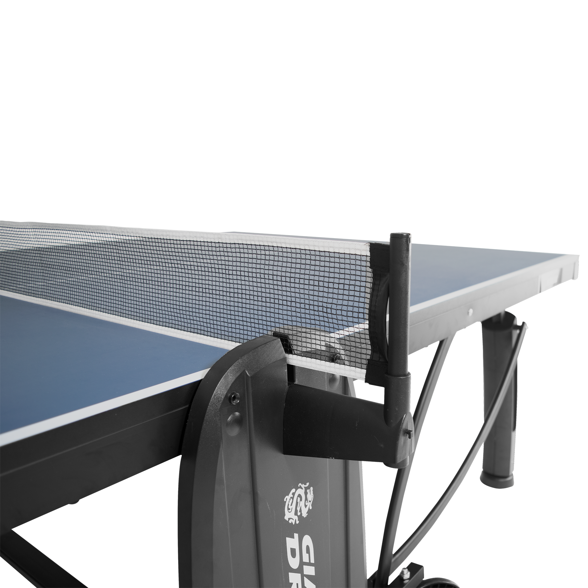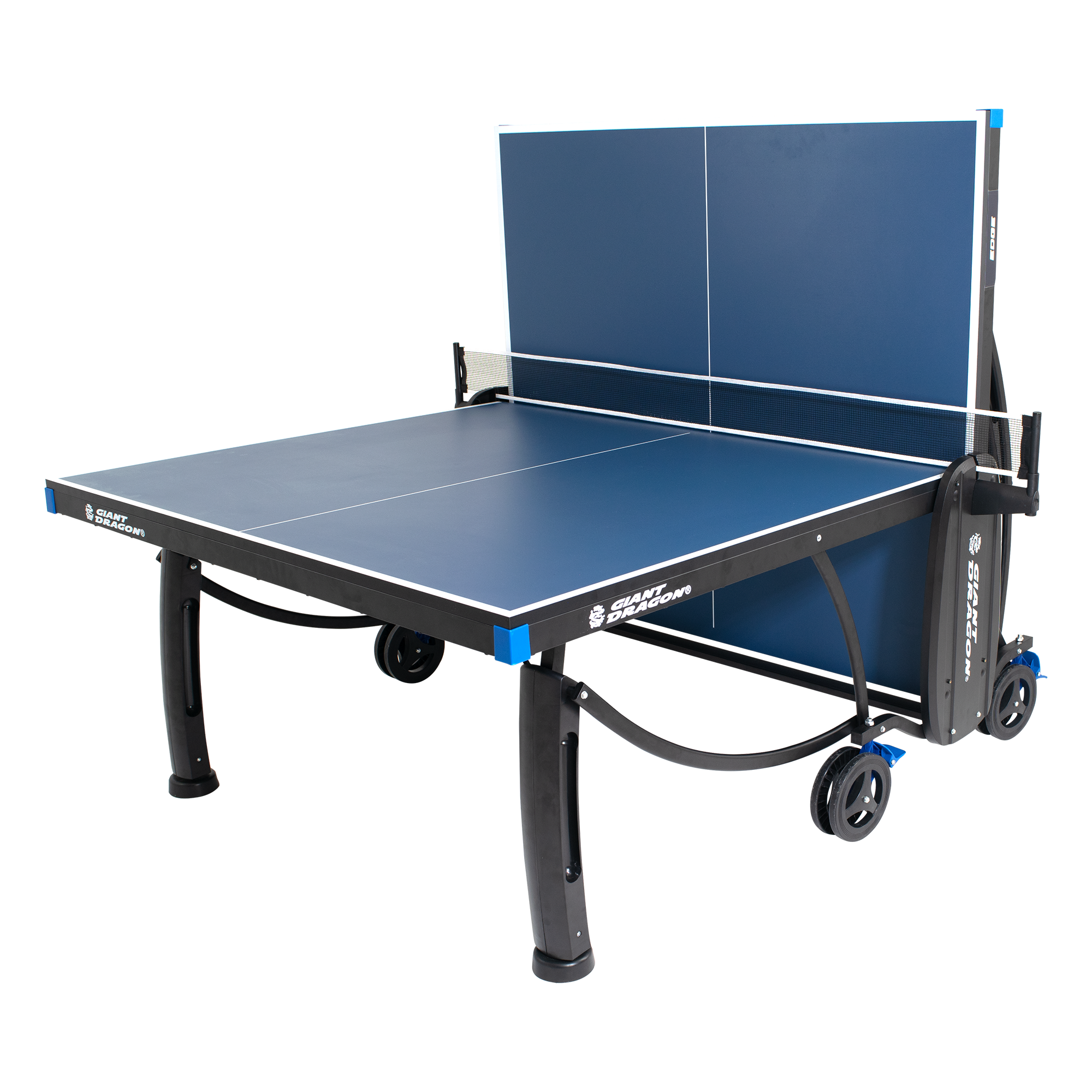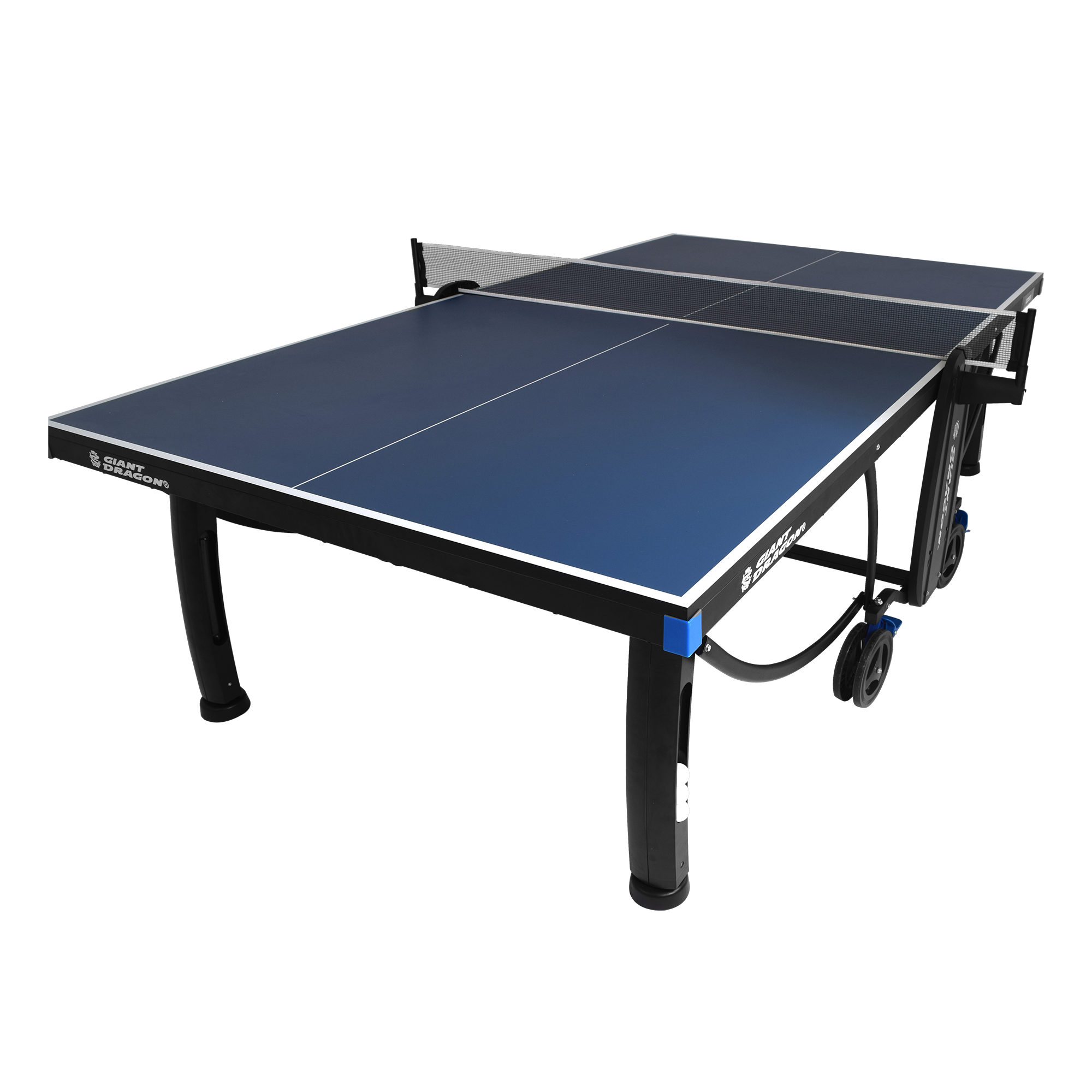Mesa profissional indoor Giant Dragon Edge com tampo em MDF de 22 mm e pintura azul antirreflexo. Estrutura metálica robusta, rodas duplas de 200 mm com trava, paredão para treino solo e sistema de dobra fácil. Possui suporte lateral para raquetes e bolas. Acompanha rede de algodão e suportes tipo jacaré. Ideal para jogos técnicos e treinos intensivos.