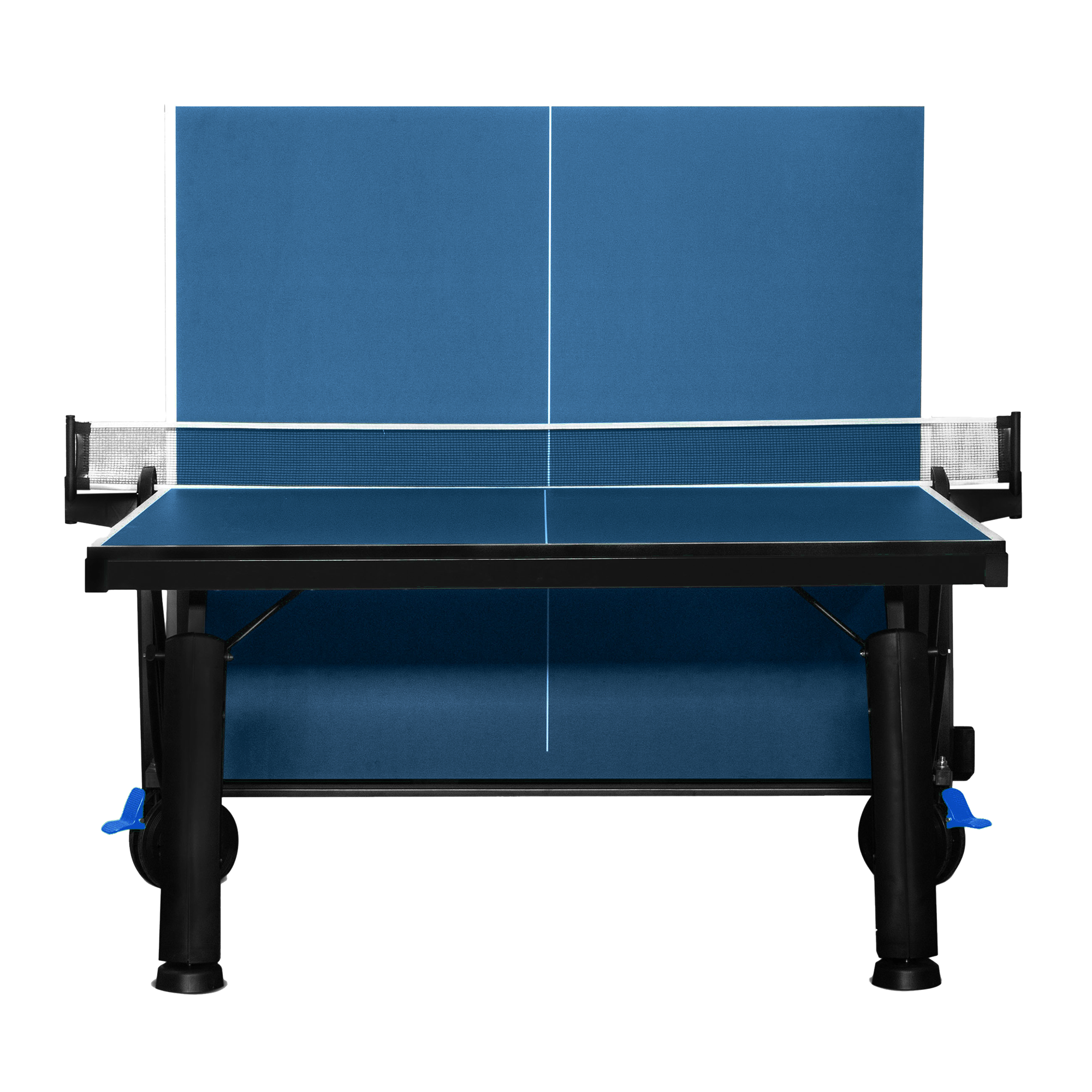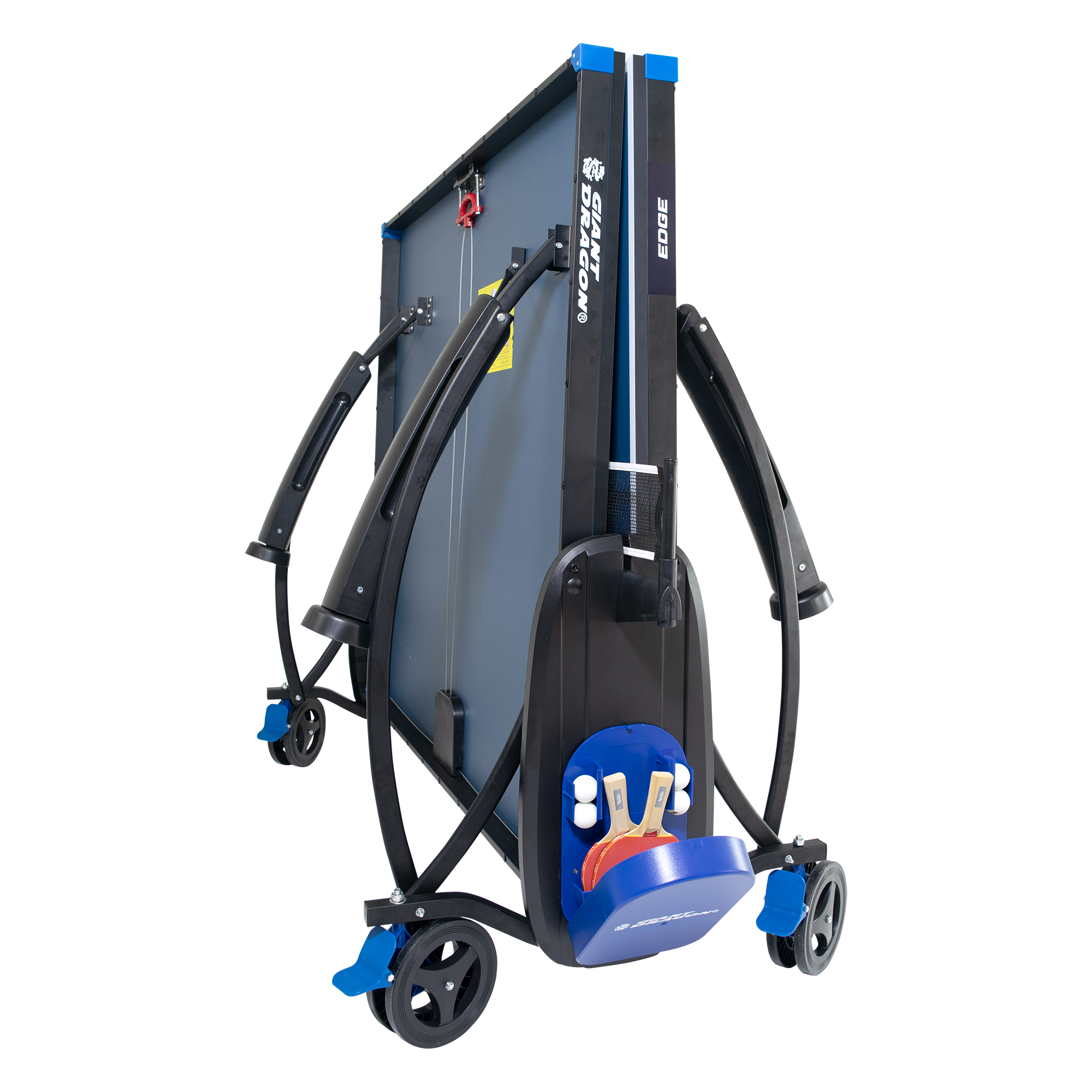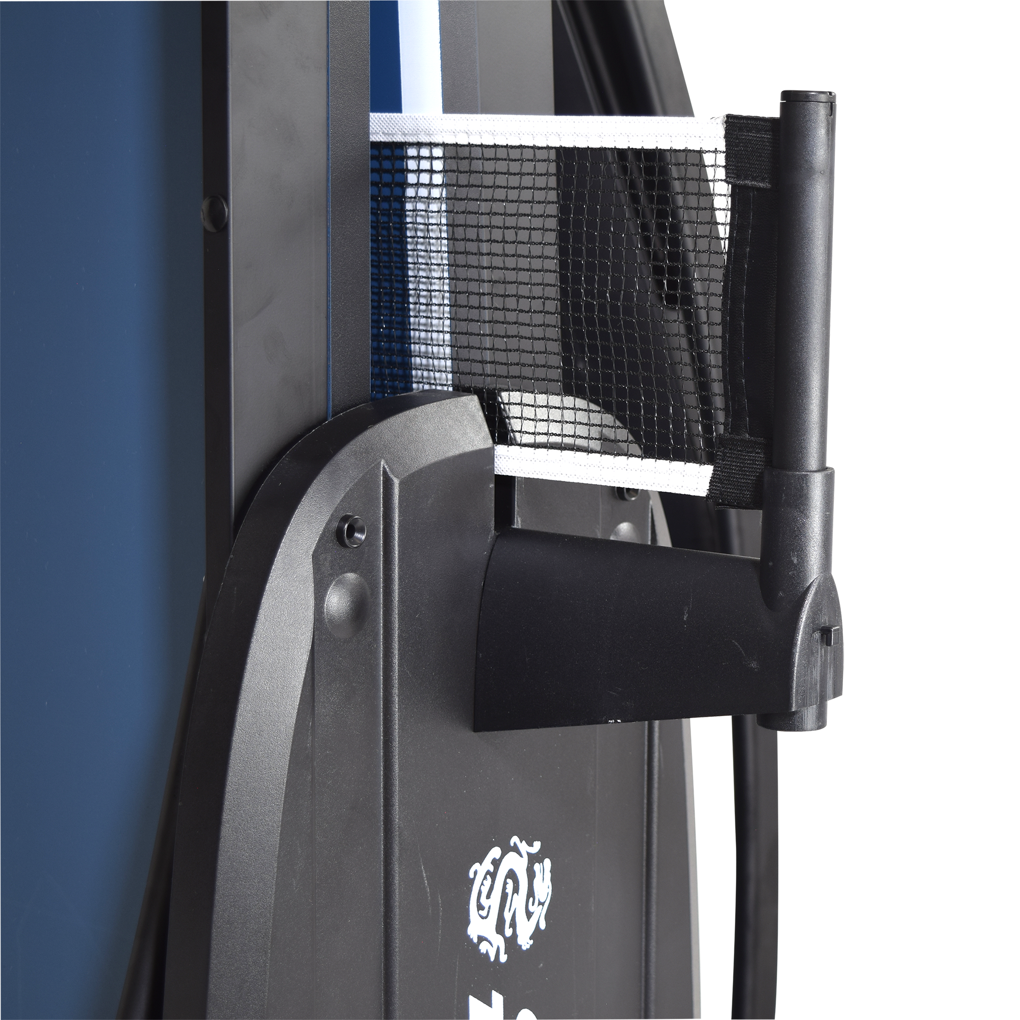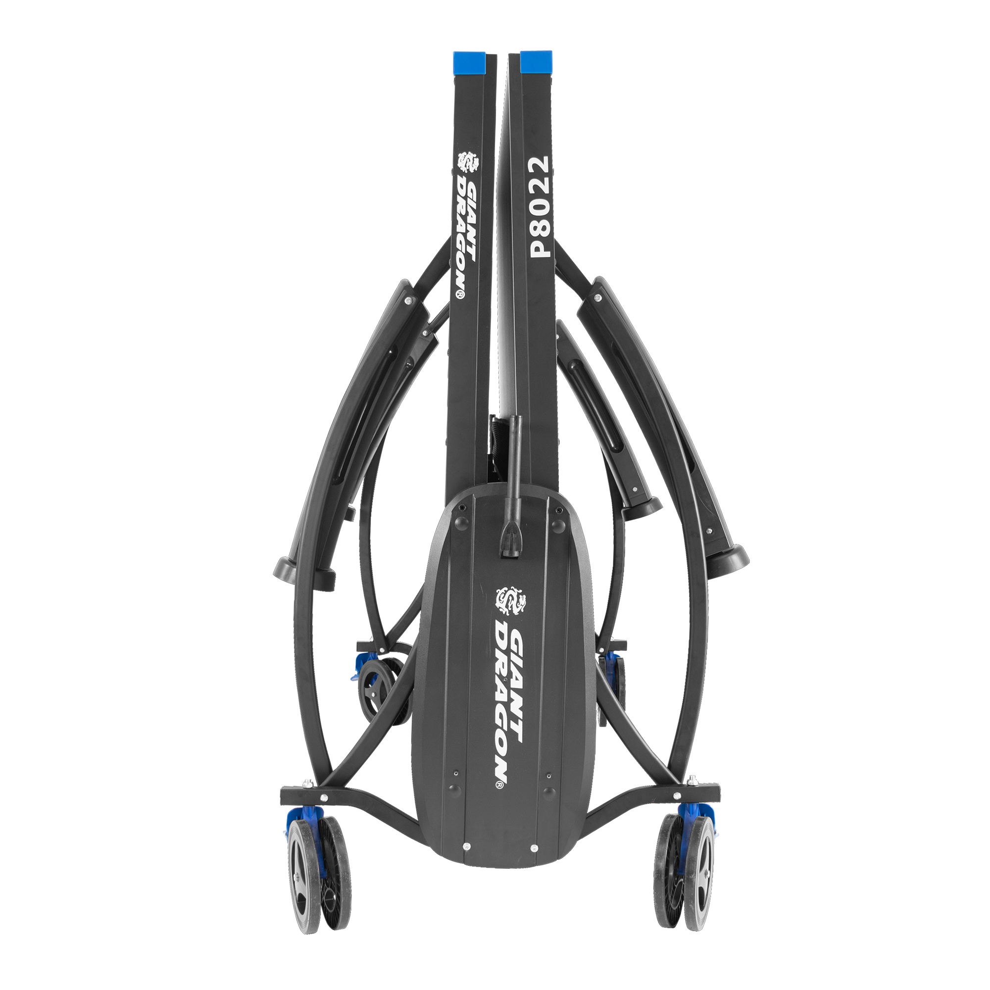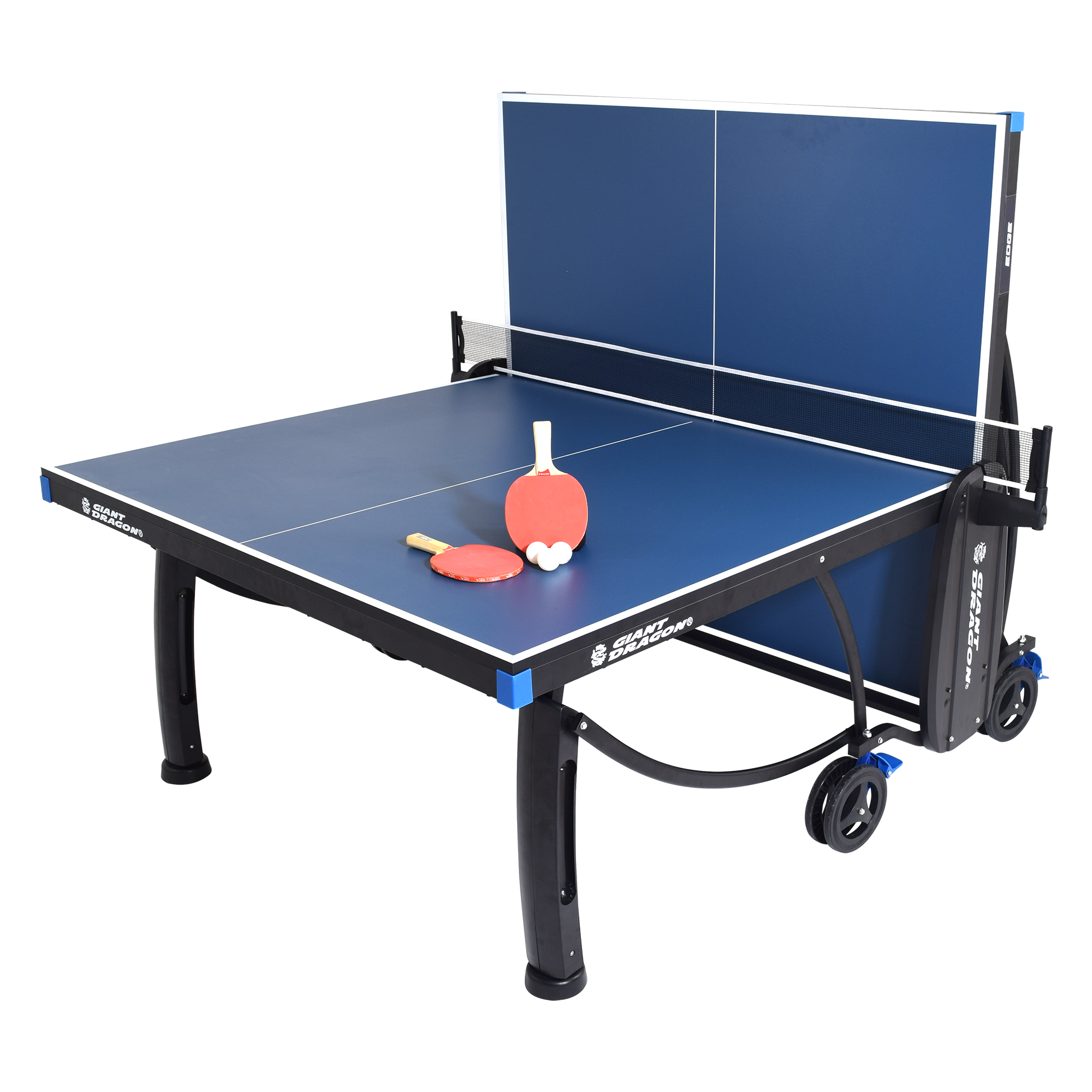 Mesa profissional indoor Giant Dragon Edge com tampo em MDF de 22 mm e pintura azul antirreflexo. Estrutura metálica robusta, rodas duplas de 200 mm com trava, paredão para treino solo e sistema de dobra fácil. Possui suporte lateral para raquetes e bolas. Acompanha rede de algodão e suportes tipo jacaré. Ideal para jogos técnicos e treinos intensivos.
