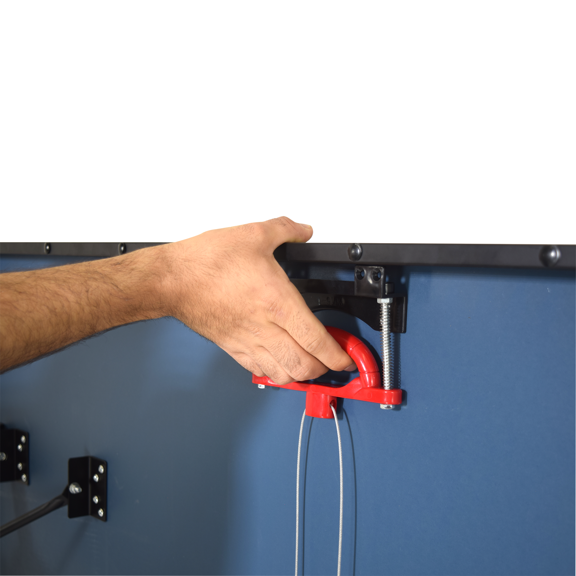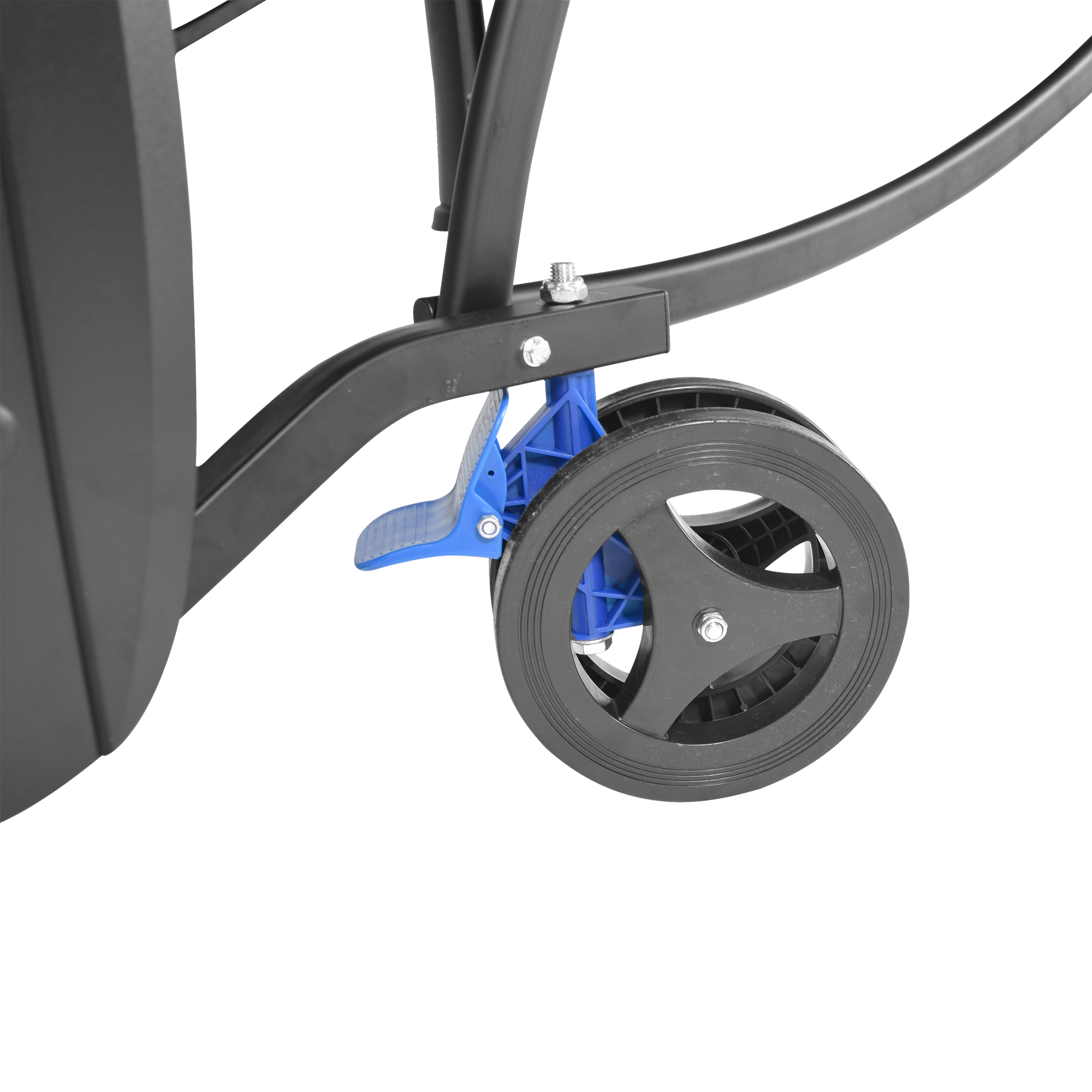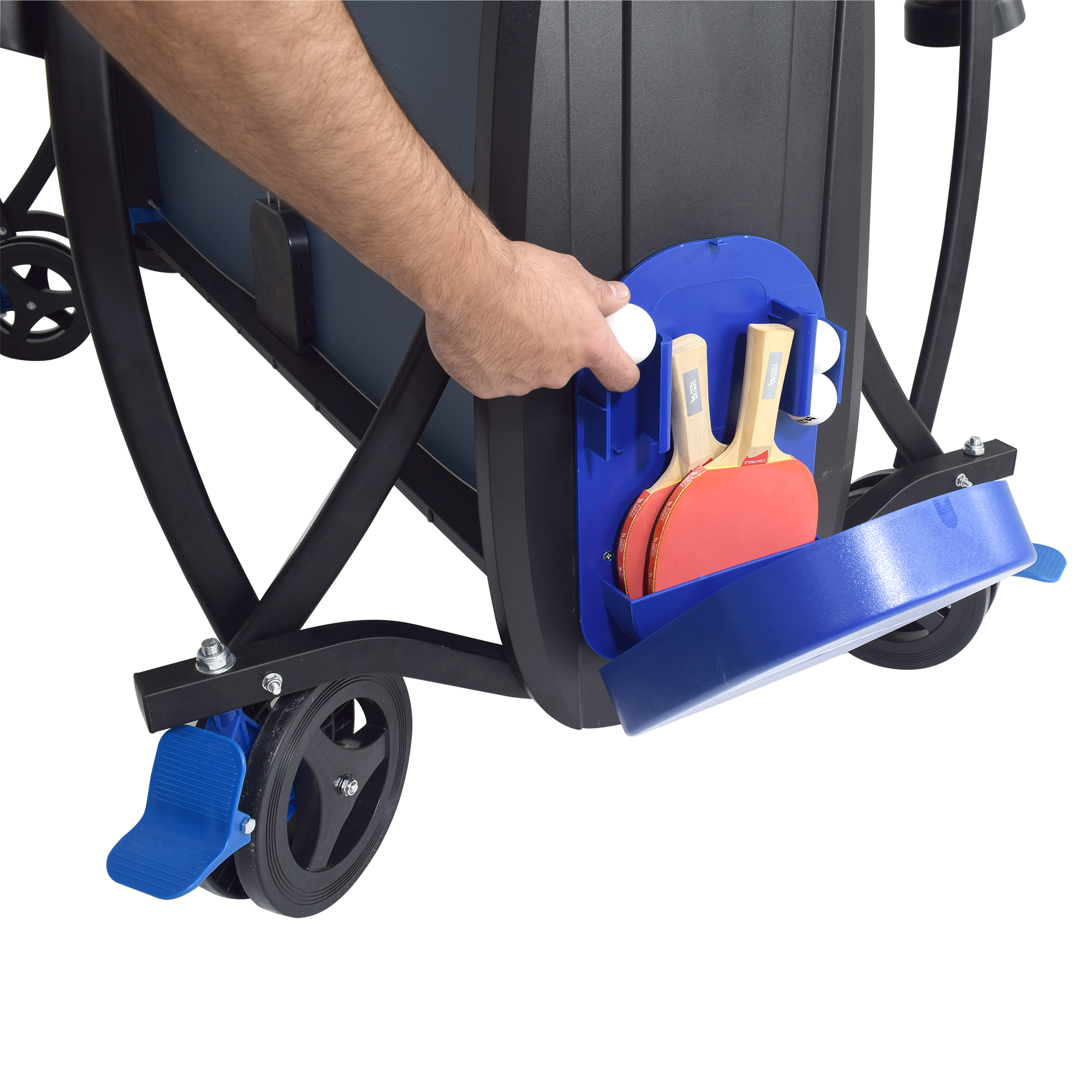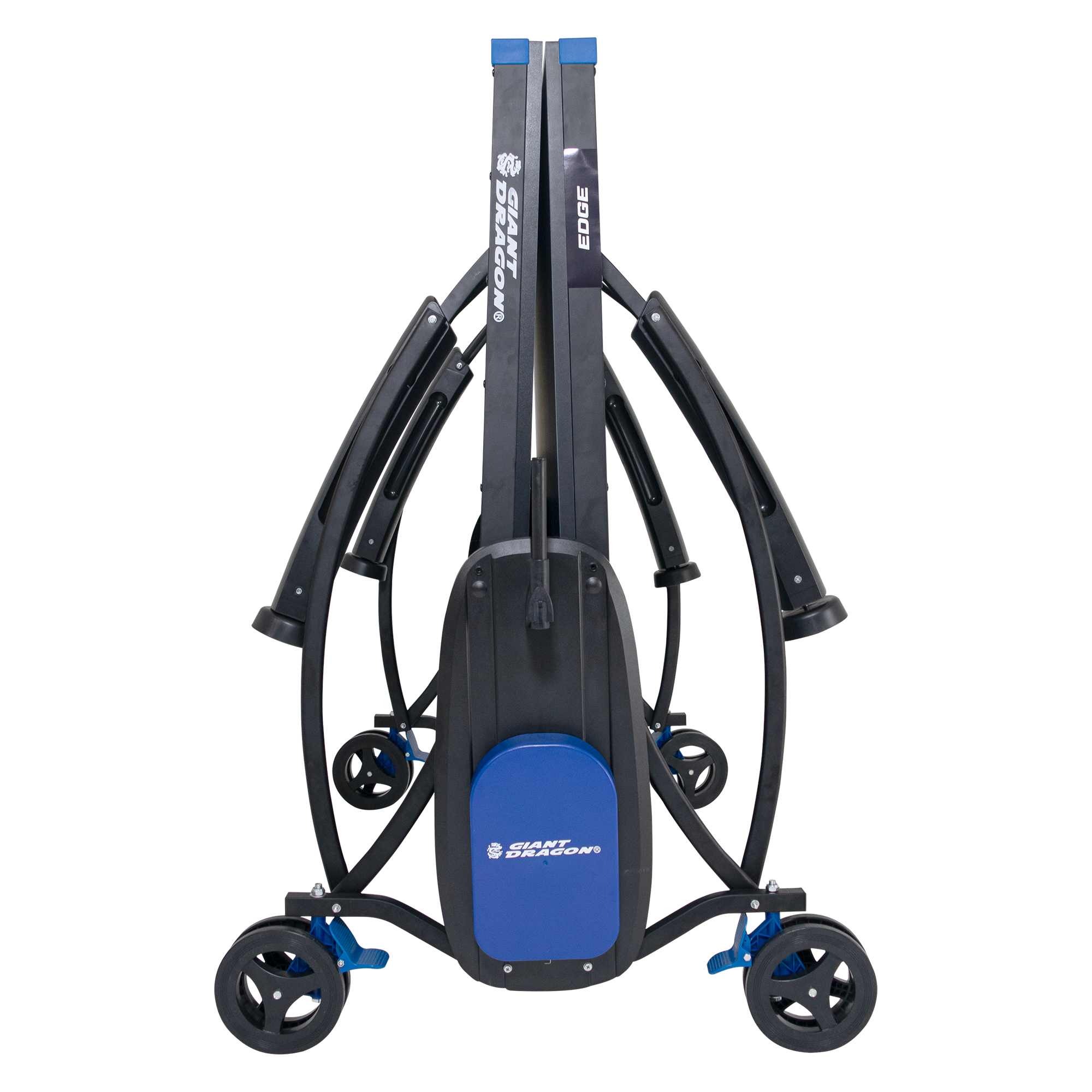 Mesa profissional indoor Giant Dragon Edge com tampo em MDF de 22 mm e pintura azul antirreflexo. Estrutura metálica robusta, rodas duplas de 200 mm com trava, paredão para treino solo e sistema de dobra fácil. Possui suporte lateral para raquetes e bolas. Acompanha rede de algodão e suportes tipo jacaré. Ideal para jogos técnicos e treinos intensivos.
