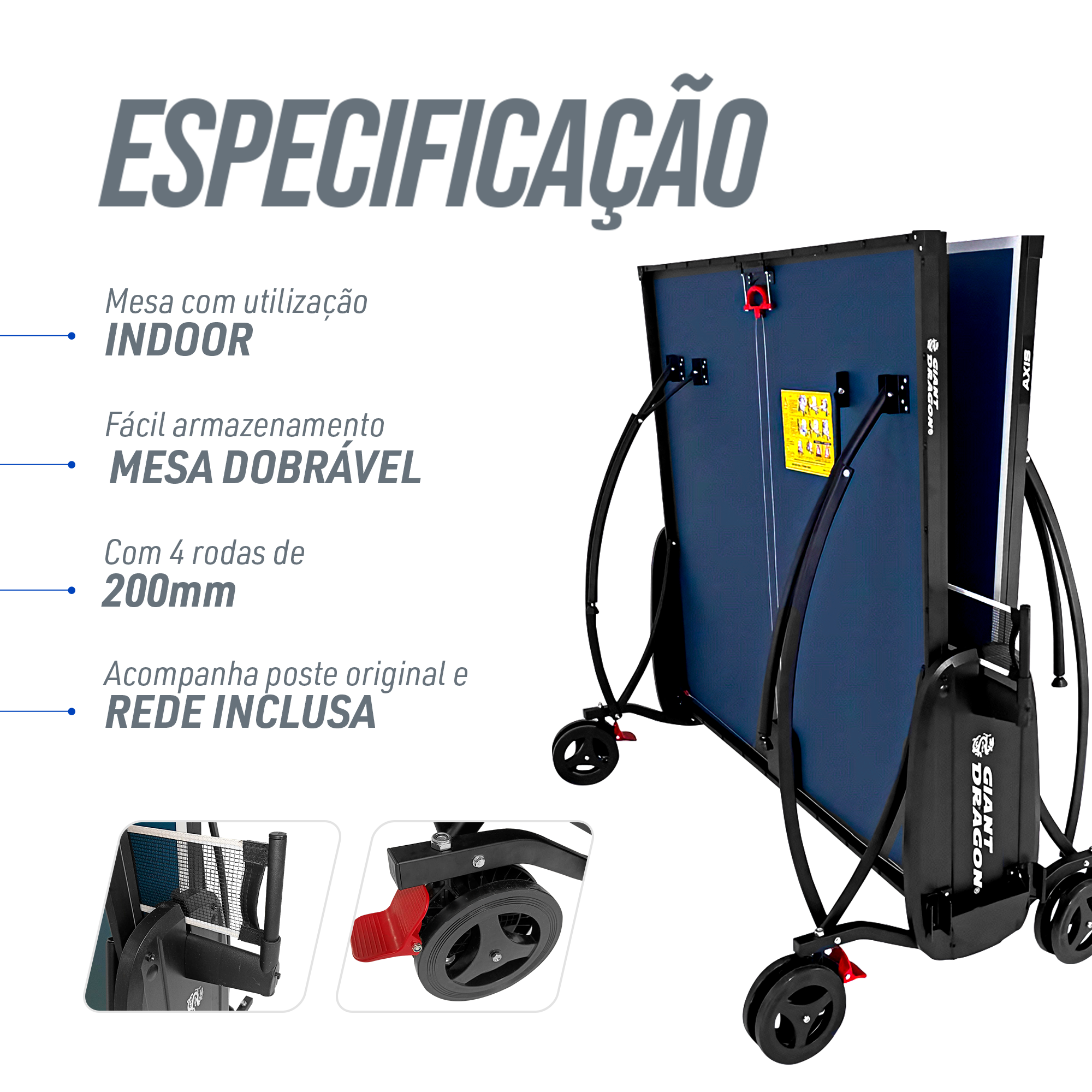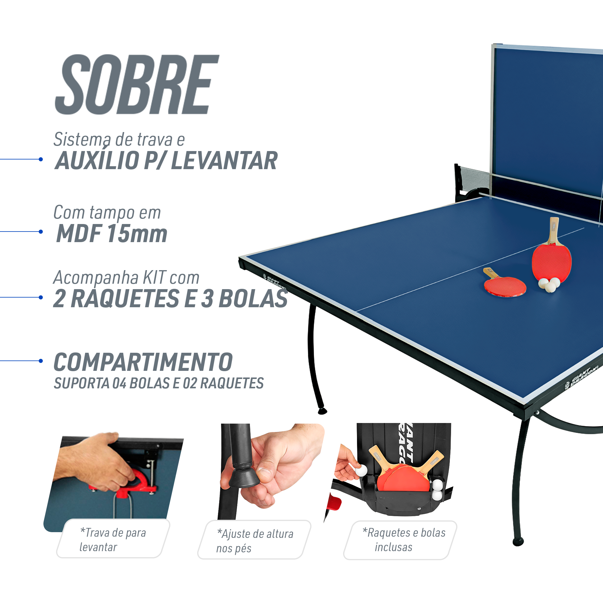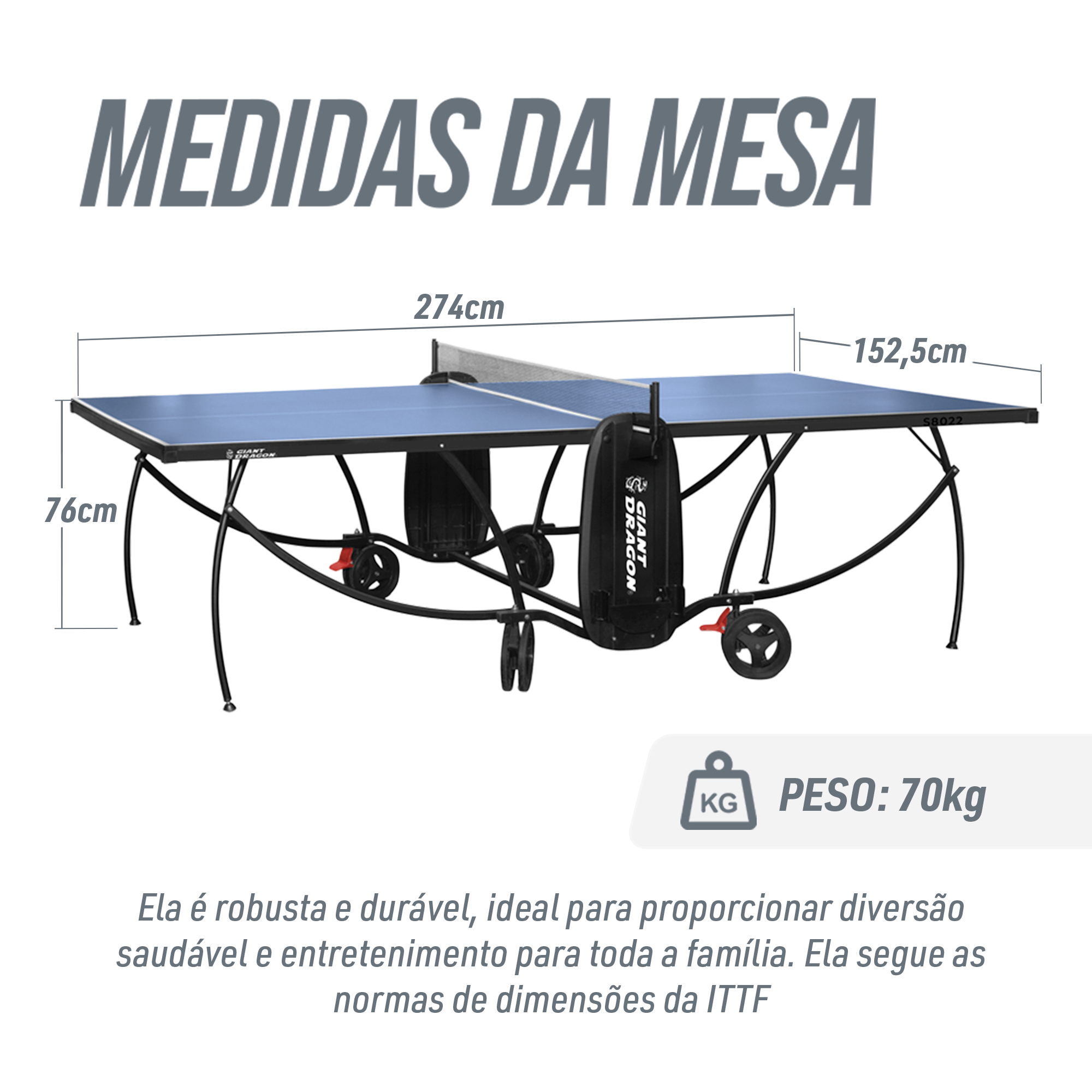 Pensada para treinos e partidas com medidas oficiais, traz tampo em MDF de 15mm com pintura antirreflexo para leitura clara do giro e do quique. Estrutura metálica dobrável com rodas duplas e travas facilita mover e guardar. Conta com modo paredão e ajuste de altura. Rede com suporte tipo jacaré e porta itens lateral para raquetes e bolas.