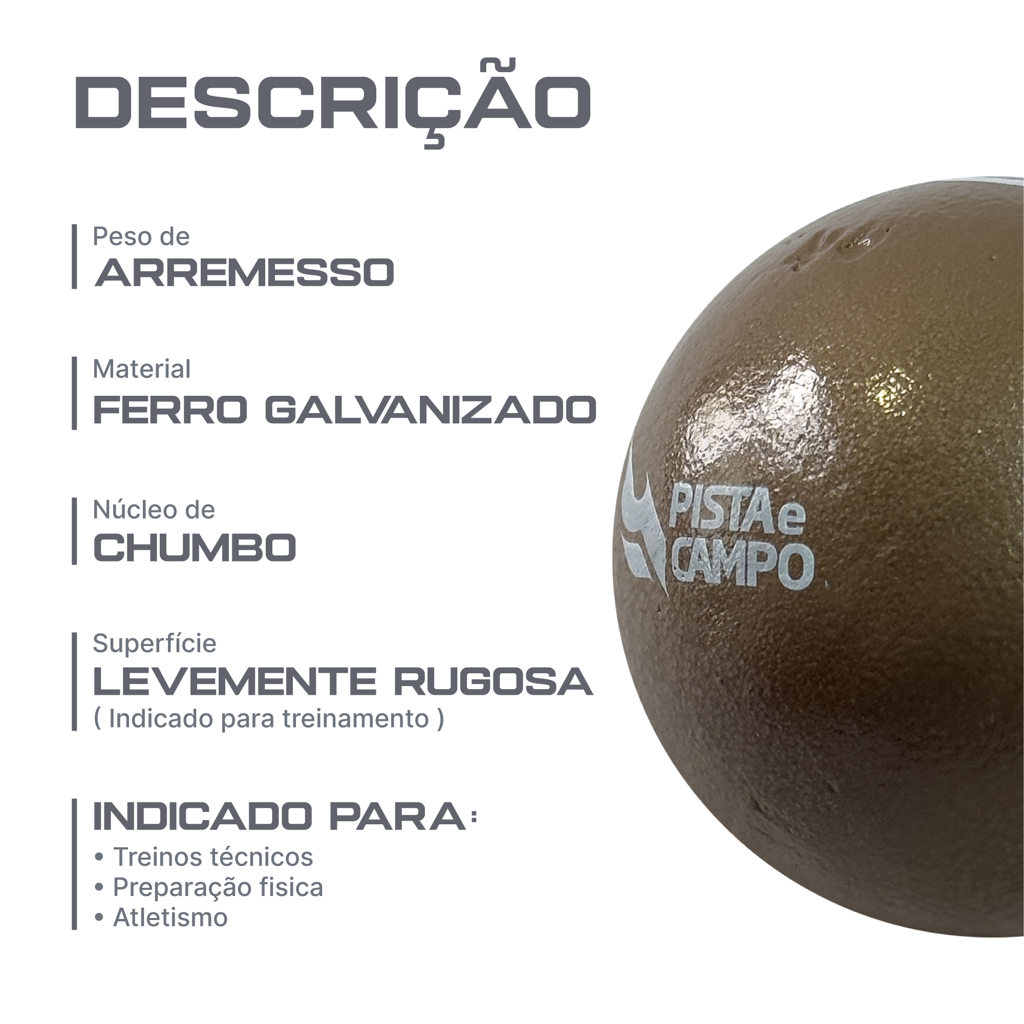 O peso de ferro da Pista e Campo foi projetado para quem busca treinar técnica e força com regularidade, sem abrir mão de controle. A construção em ferro galvanizado com núcleo de chumbo entrega densidade estável e excelente distribuição de massa, o que se traduz em trajetória consistente e sensação sólida na mão durante a saída do arremesso. A esfera é uniforme e balanceada, com diâmetro aproximado de 64 a 65 mm. Essa combinação favorece a pegada correta e a repetição do gesto técnico, ajudando a refinar a posição do cotovelo, a transferência de peso e a liberação do implemento. A superfície levemente rugosa oferece aderência adicional, reduzindo escorregões quando o treino aquece e o suor aparece. É o tipo de acabamento pensado para sessões longas, em pista, quadra ou áreas de arremesso em centros esportivos. O acabamento pintado protege o metal e contribui para a durabilidade do produto, mesmo em rotinas intensas de treinamento. Mantendo cuidados básicos, como limpar após o uso e guardar em local seco, você preserva a integridade da peça e mantém a textura de contato sempre eficiente. Voltado a treinos de arremesso do peso e à preparação física, o implemento atende bem a escolas, clubes, equipes de base e praticantes que desejam aprimorar explosão, coordenação e tempo de liberação. O desenho esférico e o balanceamento estável dão ao atleta uma resposta previsível, essencial para evoluir a técnica com segurança. Principais benefícios na prática: controle de pegada graças à textura rugosa; sensação firme e centrada pela distribuição de massa com núcleo de chumbo; durabilidade do ferro galvanizado para suportar o uso contínuo; dimensões compactas que facilitam a condução do movimento do início à liberação. Se você procura um peso de arremesso confiável para treinar com qualidade, este modelo entrega o essencial: equilíbrio, aderência e resistência. Explore as fotos, confira a ficha técnica e finalize sua compra no site Pista e Campo para levar mais consistência aos seus treinos.