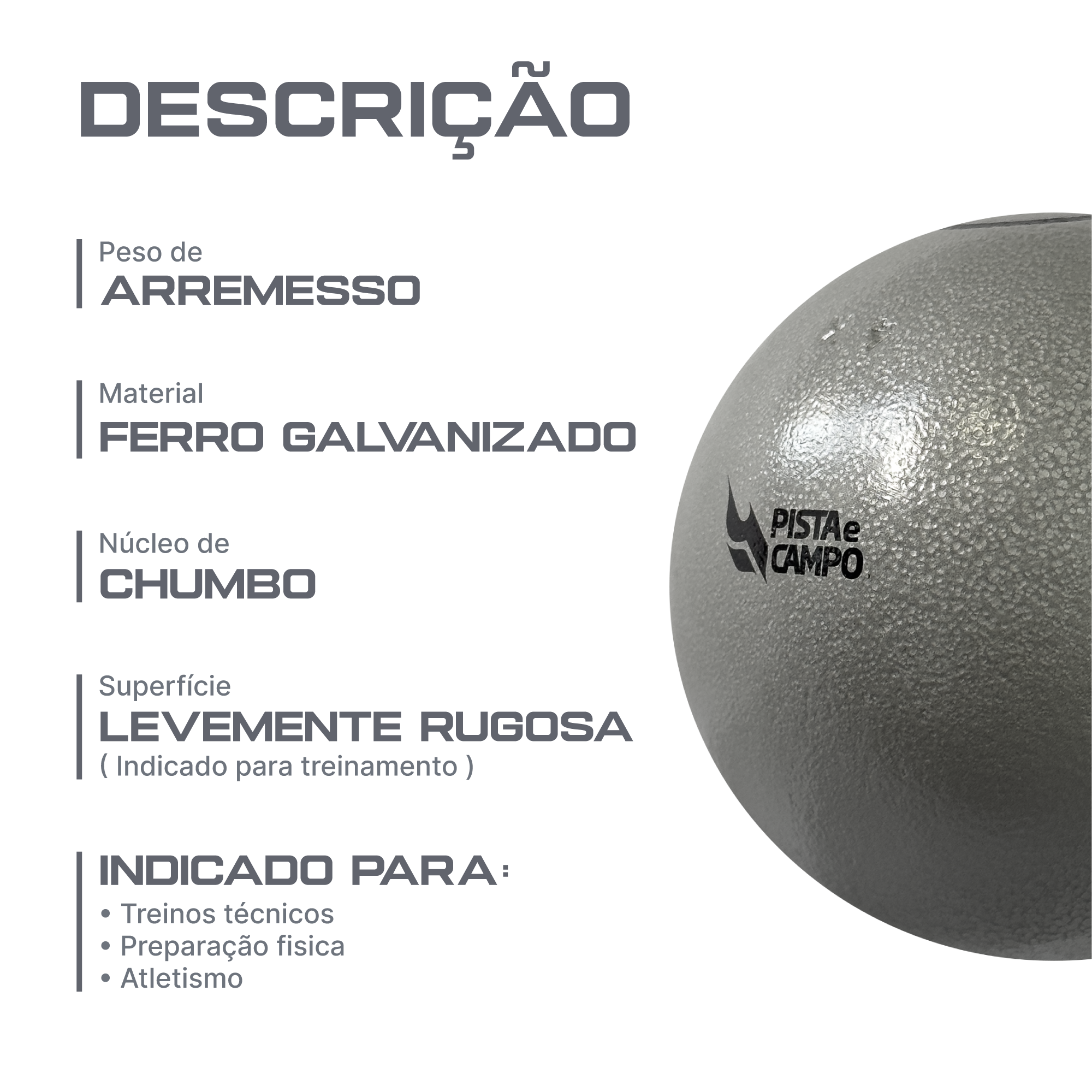 O peso de ferro da Pista e Campo foi projetado para quem busca treinar técnica e força com regularidade, sem abrir mão de controle. A construção em ferro galvanizado com núcleo de chumbo entrega densidade estável e excelente distribuição de massa, o que se traduz em trajetória consistente e sensação sólida na mão durante a saída do arremesso. A esfera é uniforme e balanceada, com diâmetro aproximado de 100 a 102 mm. Essa combinação favorece a pegada correta e a repetição do gesto técnico, ajudando a refinar a posição do cotovelo, a transferência de peso e a liberação do implemento. A superfície levemente rugosa oferece aderência adicional, reduzindo escorregões quando o treino aquece e o suor aparece. É o tipo de acabamento pensado para sessões longas, em pista, quadra ou áreas de arremesso em centros esportivos. O acabamento pintado protege o metal e contribui para a durabilidade do produto, mesmo em rotinas intensas de treinamento. Mantendo cuidados básicos, como limpar após o uso e guardar em local seco, você preserva a integridade da peça e mantém a textura de contato sempre eficiente. Voltado a treinos de arremesso do peso e à preparação física, o implemento atende bem a escolas, clubes, equipes de base e praticantes que desejam aprimorar explosão, coordenação e tempo de liberação. O desenho esférico e o balanceamento estável dão ao atleta uma resposta previsível, essencial para evoluir a técnica com segurança. Principais benefícios na prática: controle de pegada graças à textura rugosa; sensação firme e centrada pela distribuição de massa com núcleo de chumbo; durabilidade do ferro galvanizado para suportar o uso contínuo; dimensões compactas que facilitam a condução do movimento do início à liberação. Se você procura um peso de arremesso confiável para treinar com qualidade, este modelo entrega o essencial: equilíbrio, aderência e resistência. Explore as fotos, confira a ficha técnica e finalize sua compra no site Pista e Campo para levar mais consistência aos seus treinos.