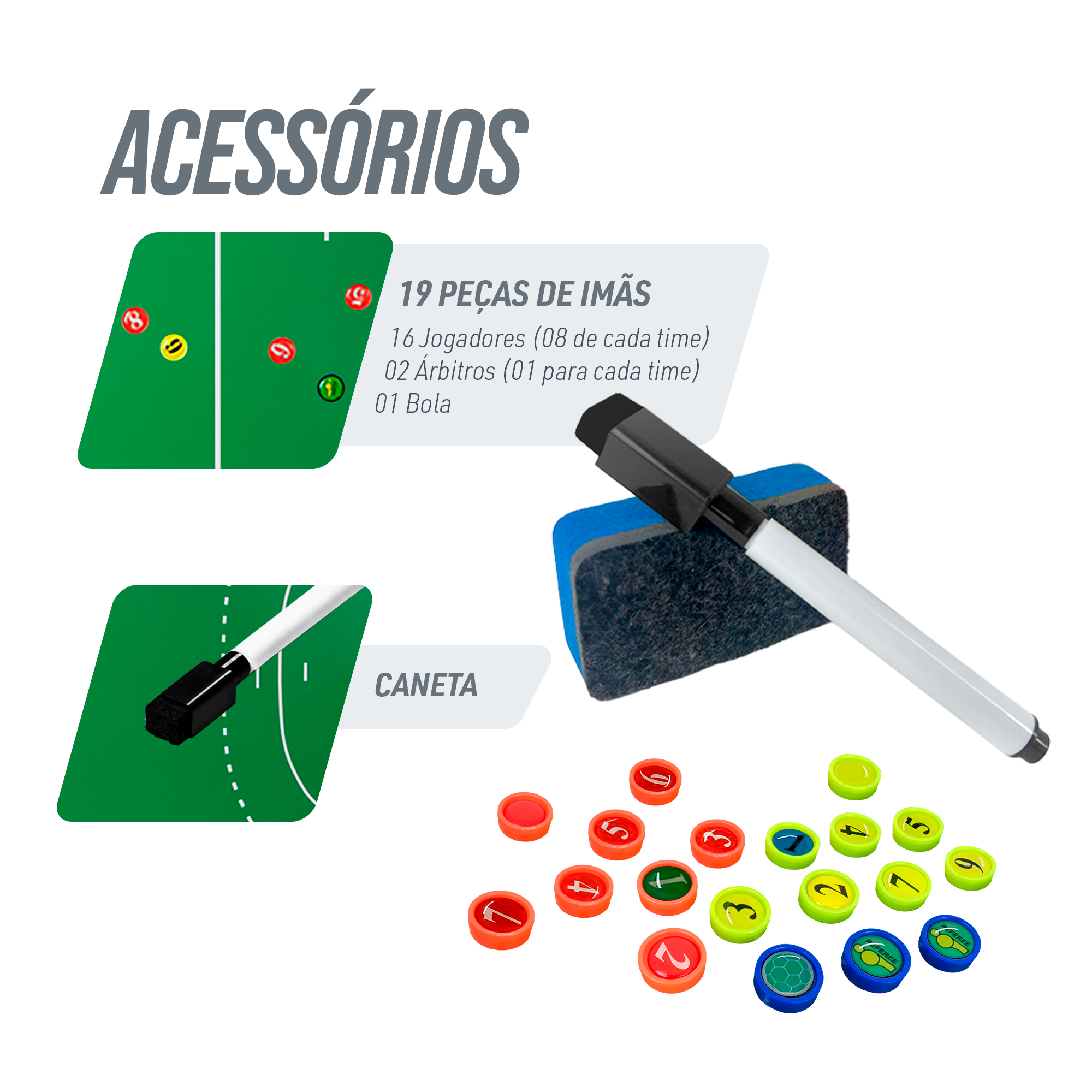 Estratégia à vista: organize sua equipe com clareza. O quadro tático magnético de handebol 45x30 cm da Velden foi pensado para treinos, preleções e tempos técnicos em qualquer nível de jogo. O formato compacto cabe na mochila da comissão e, ao mesmo tempo, oferece área suficiente para demonstrar posicionamentos, coberturas e movimentações com leitura rápida para o grupo. A moldura em alumínio dá rigidez e durabilidade sem adicionar peso. Os cantos protegidos ajudam a evitar impactos no transporte e na rotina do ginásio. A superfície dupla face multiplica as possibilidades: de um lado, a quadra inteira para organização tática geral; do outro, a meia quadra para detalhar jogadas, combinações e bolas paradas. Tudo com acabamento magnético e também próprio para escrita tipo quadro branco. O conjunto de ímãs acompanha 16 peças para jogadores, 2 para árbitros e 1 para a bola. Eles têm boa aderência, permitindo simular formações, alternar marcações e mostrar linhas de passe sem que as peças escorreguem. Para complementar, a caneta com apagador possibilita desenhar setas, trajetórias e anotações rápidas, mantendo o foco da equipe na explicação. Na prática, você usa os ganchos deslizantes para pendurar o quadro no vestiário ou na parede do ginásio, deixando as mãos livres para conduzir a conversa. No banco, a peça fica estável sobre a mesa ou no colo, graças à estrutura firme. Terminou a sessão? Passe o apagador para a limpeza diária e, quando necessário, use um pano macio levemente umedecido em álcool para manter a superfície sem fantasmas de tinta. É um recurso direto, funcional e feito para o ritmo do jogo: anote, apague, reposicione os ímãs e explique novamente. Ideal para treinadores, auxiliares e professores de educação física que precisam de comunicação visual clara e rápida. Pronto para profissionalizar suas preleções e treinos de handebol? Adicione ao carrinho e receba um quadro tático completo, resistente e portátil para elevar a tomada de decisão da equipe.