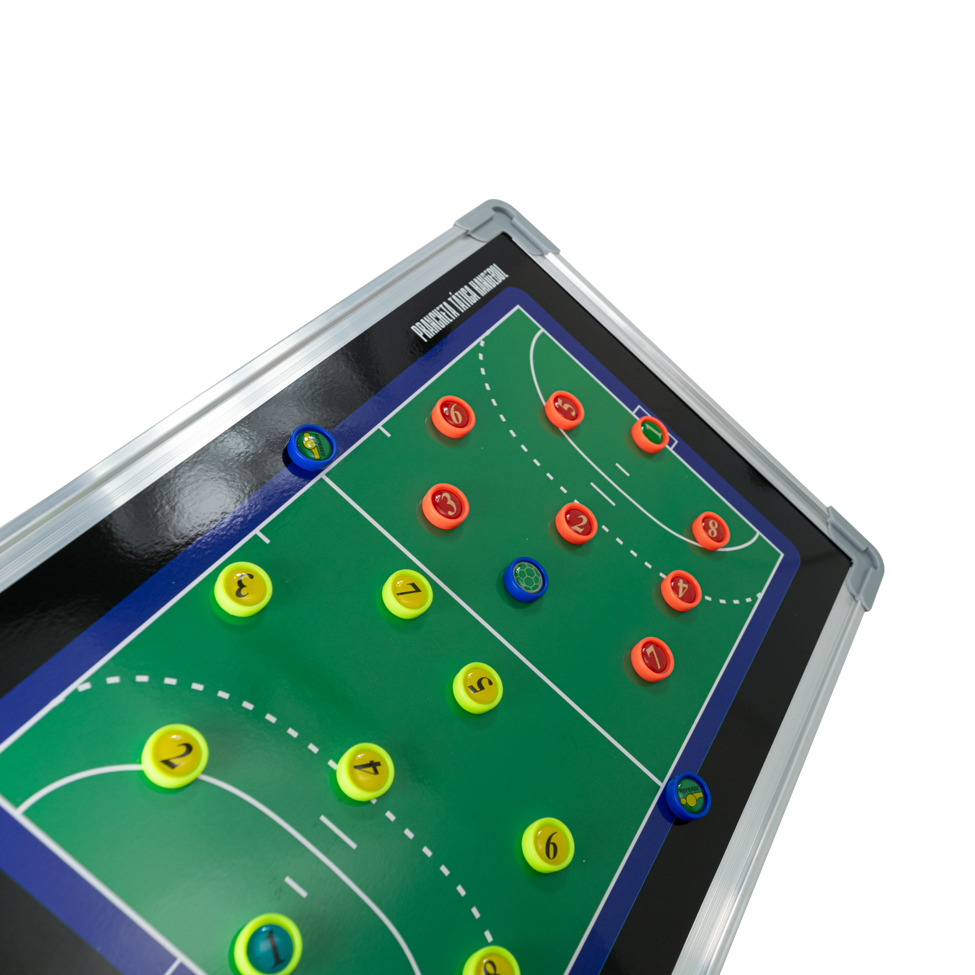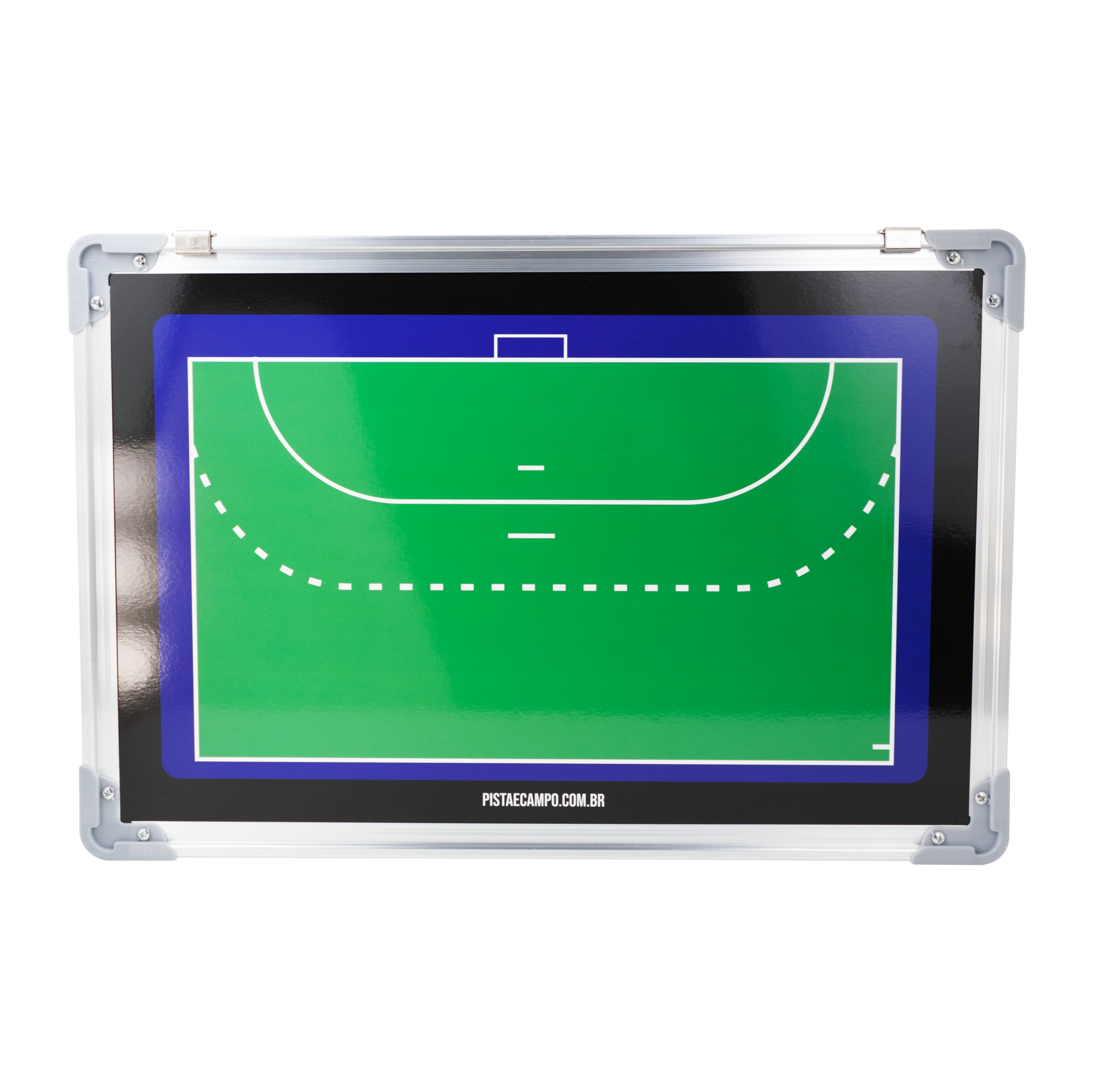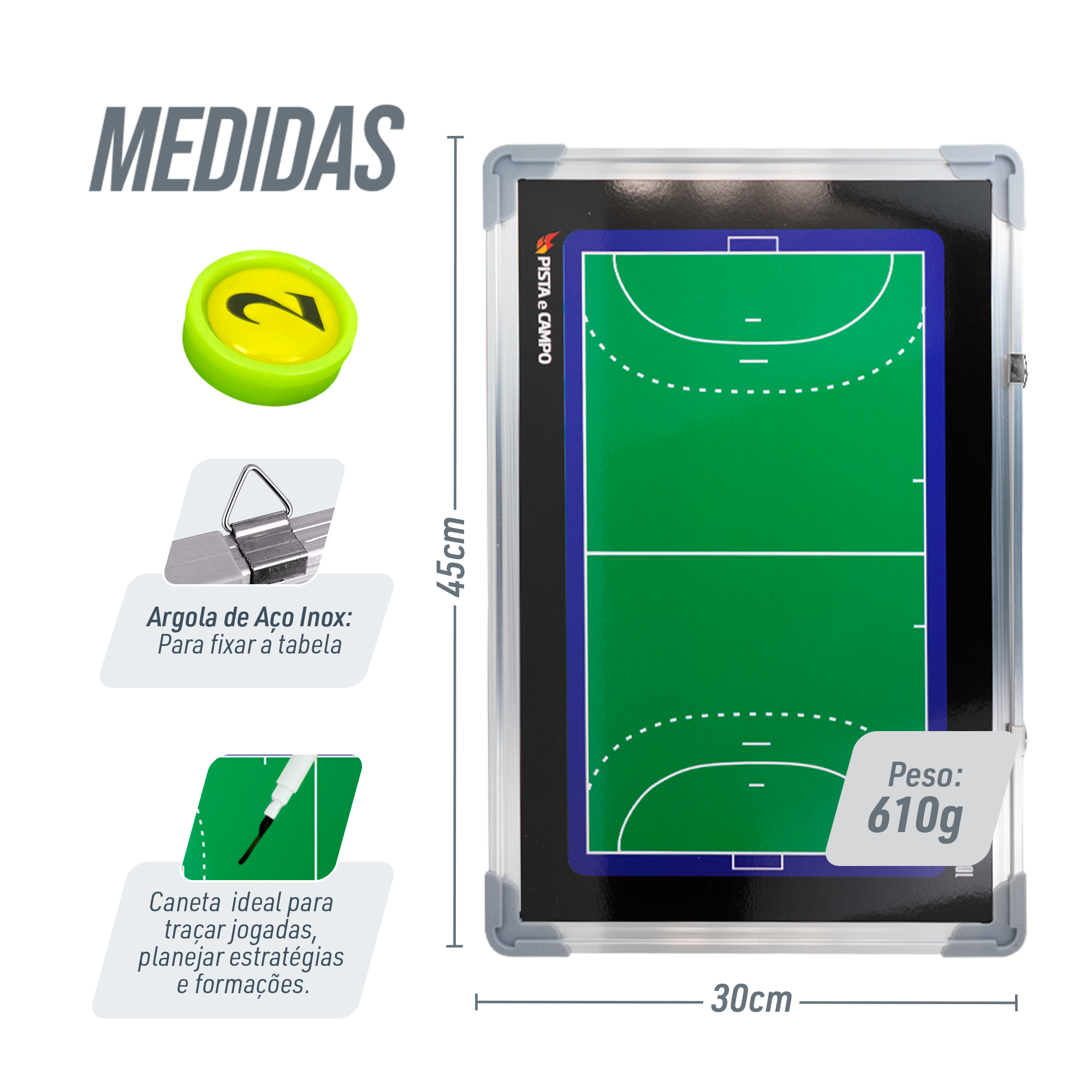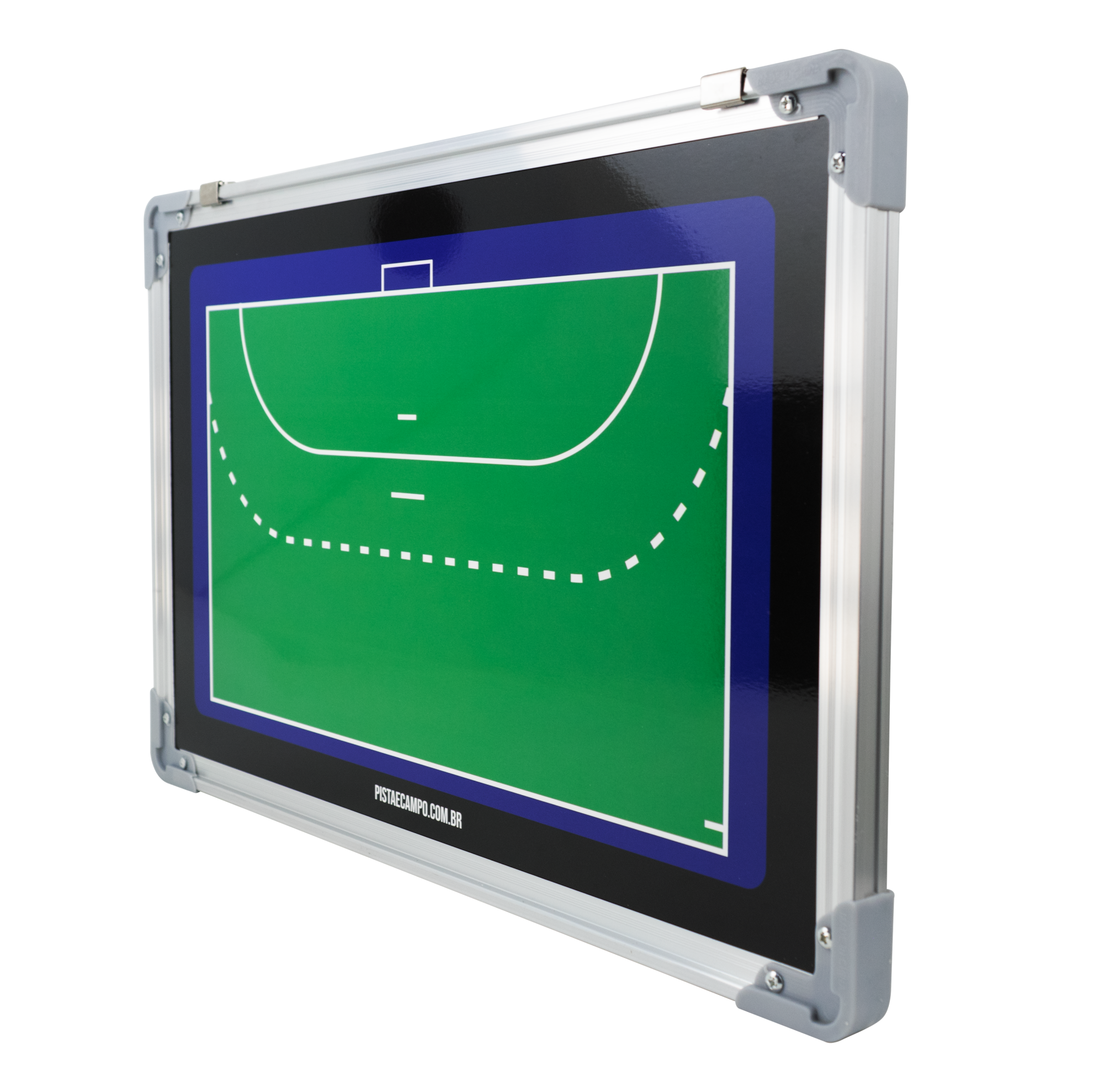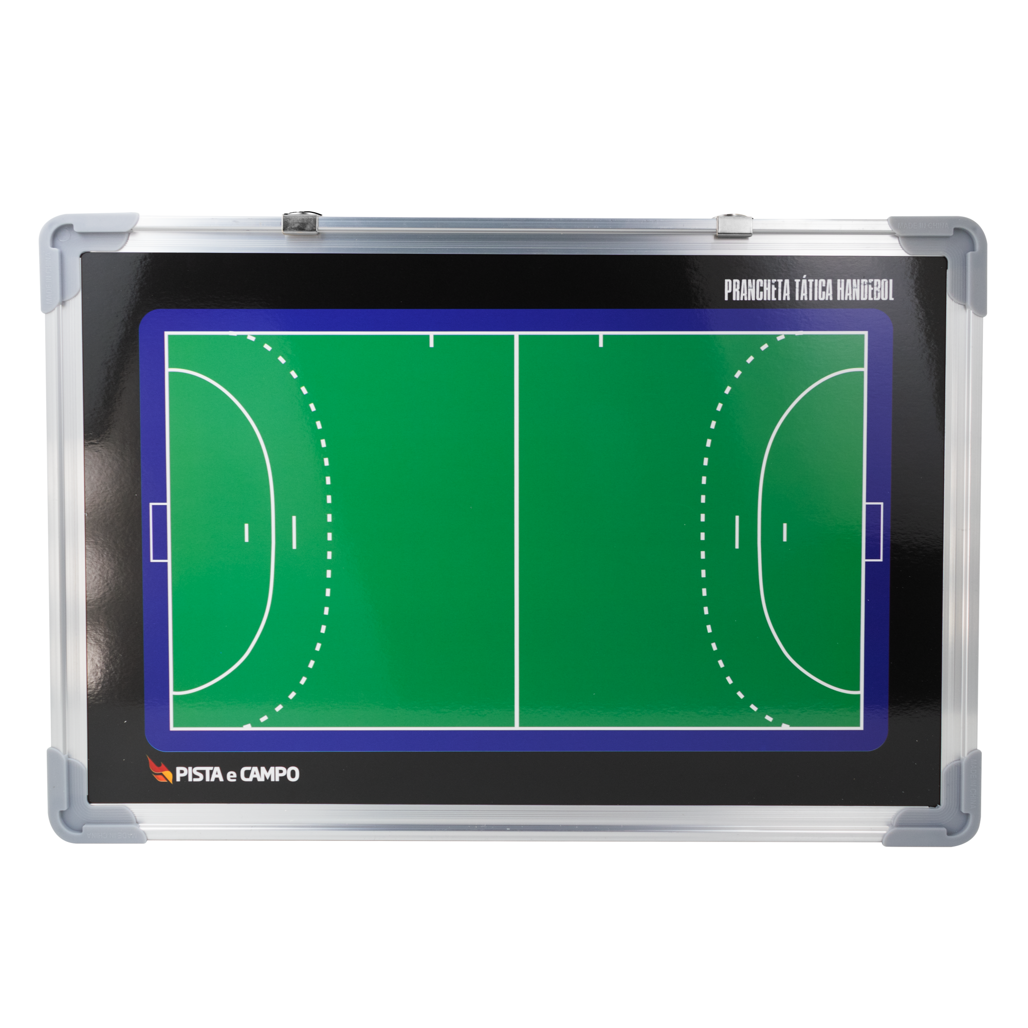 Ferramenta leve e resistente para planejar jogadas de handebol. Moldura em alumínio com cantos protegidos aumenta a durabilidade no dia a dia. Dupla face, com quadra inteira e meia quadra, facilita ajustes rápidos. Superfície magnética e de quadro branco, aceita ímãs e marcador, com ganchos para fixação.
