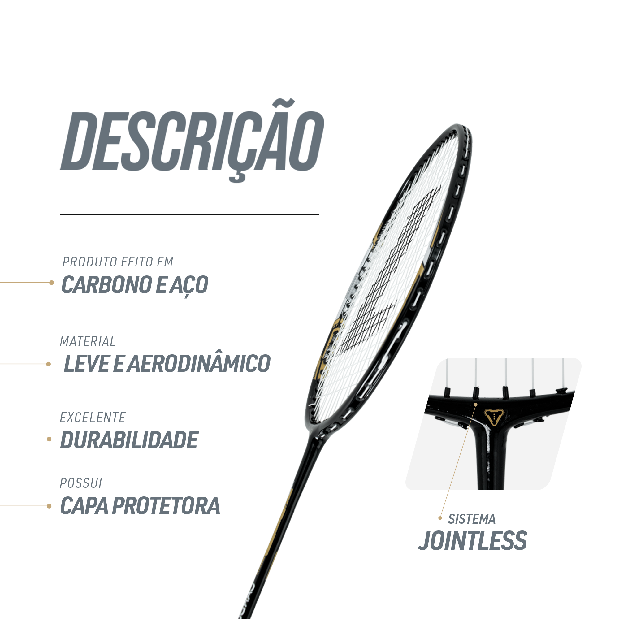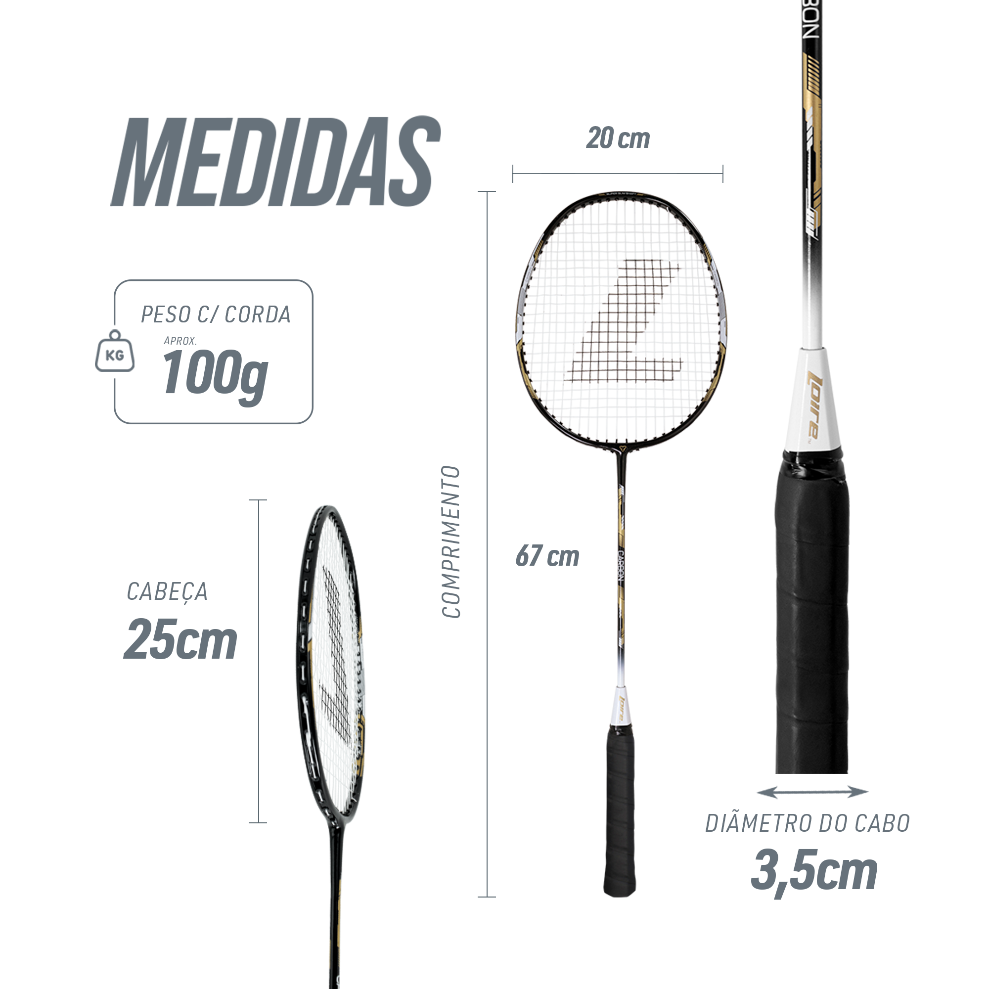 A raquete de badminton premium da Pista e Campo, linha Loire de Badminton, é feita de aço e fibra de carbono, com encordoamento em nylon, estrutura isométrica da cabeça quadrada, tecnologia Nano, pesa aproximadamente 100 gramas ou 22-24 libras e ideal para uso profissional e adulto. Dimensões: 67 x 20 x 2,5 cm. A raquete proporciona nas jogadas: intensidade, super flexibilidade e velocidade conforme impulso e agitação. Esta é a escolha certa para quem está a procura de um excelente desempenho nas quadras. Obs. não acompanha o overgrip, apenas o cushion grip. Recomendamos a compra de overgrips em qualquer loja de raquetes, os mesmos precisam ser trocados sempre que gastarem.