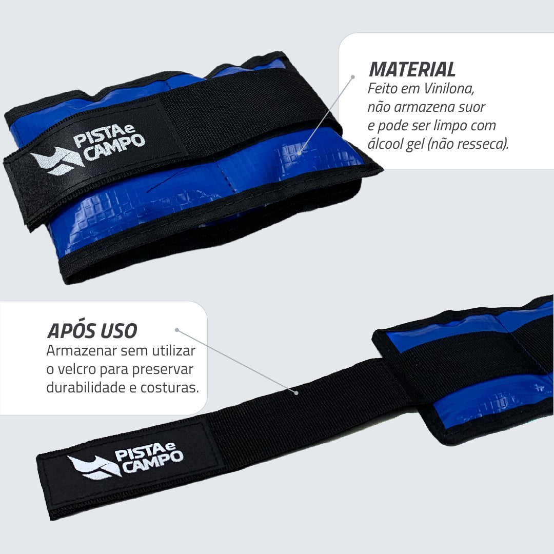 Par de tornozeleiras para fortalecer membros inferiores e intensificar treinos funcionais. Revestimento em vinilona resistente com costuras reforçadas para uso frequente. Enchimento denso em compartimentos que distribuem a carga com estabilidade. Tira de contato ajustável garante encaixe firme em diferentes circunferências.